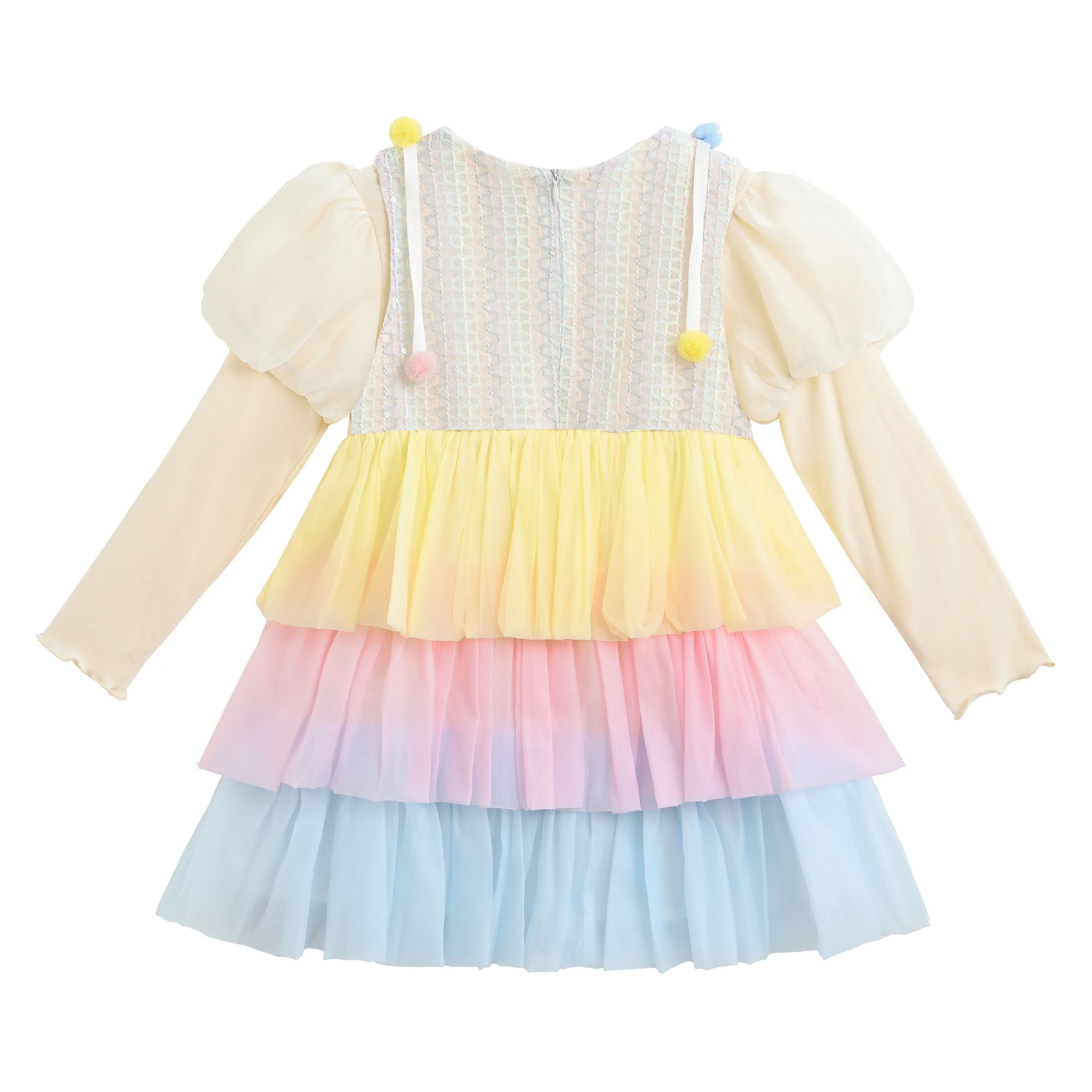 - Layered Tulle Skirt: Gradient tiers in yellow, pink, and blue create a soft, twirl-worthy silhouette.