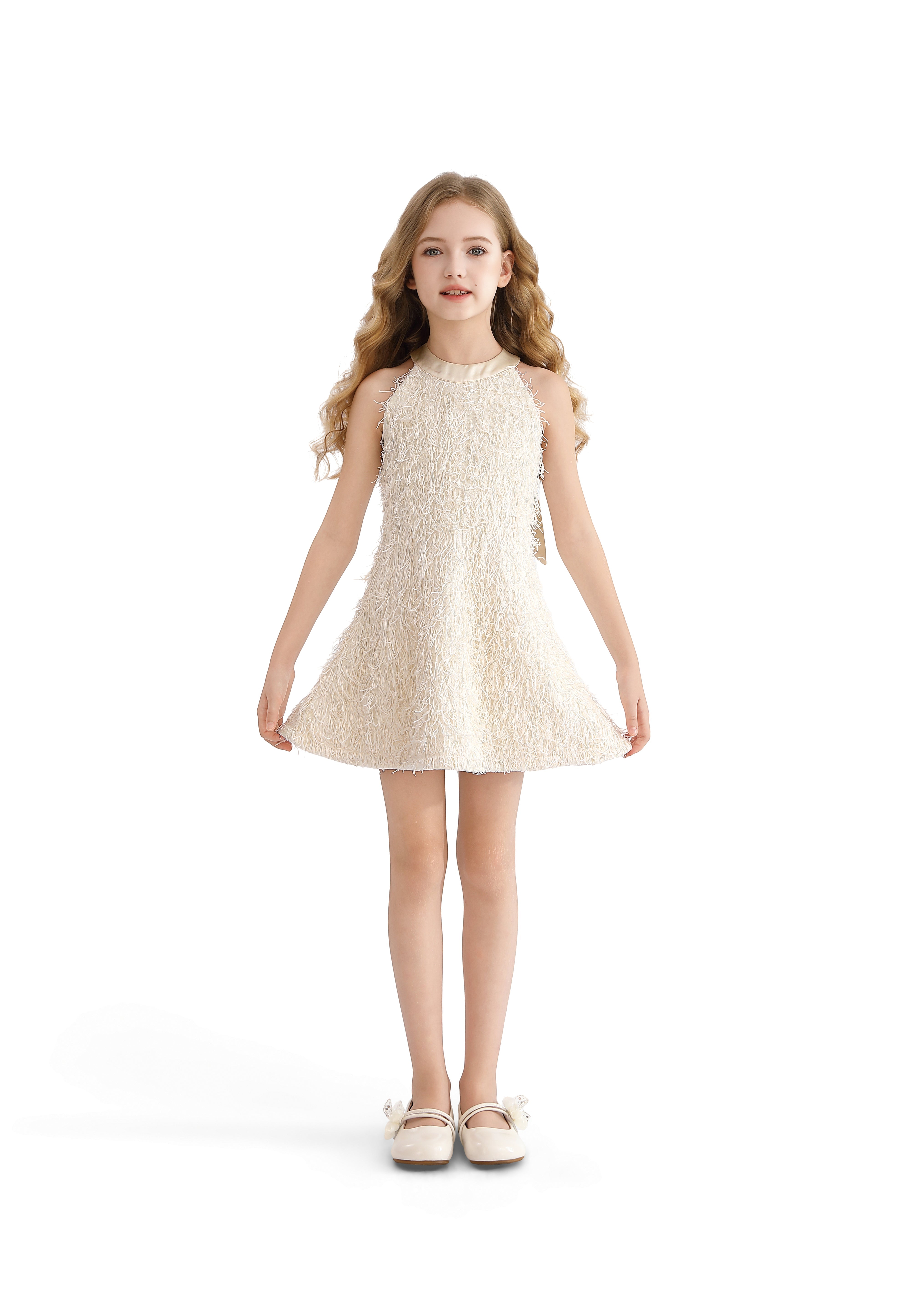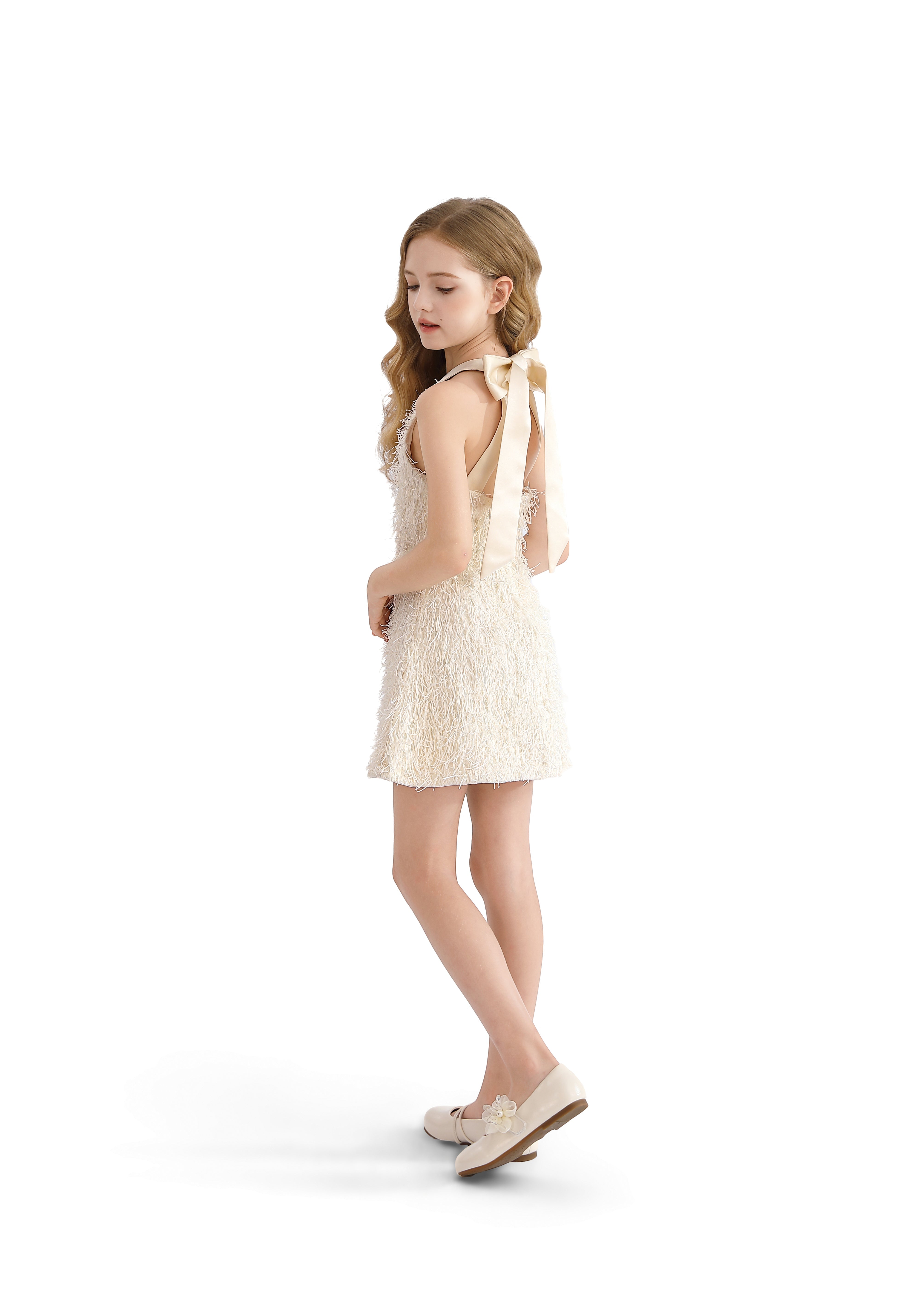 - Back ribbon tie and flower-detailed shoes add a soft, romantic finish from every angle