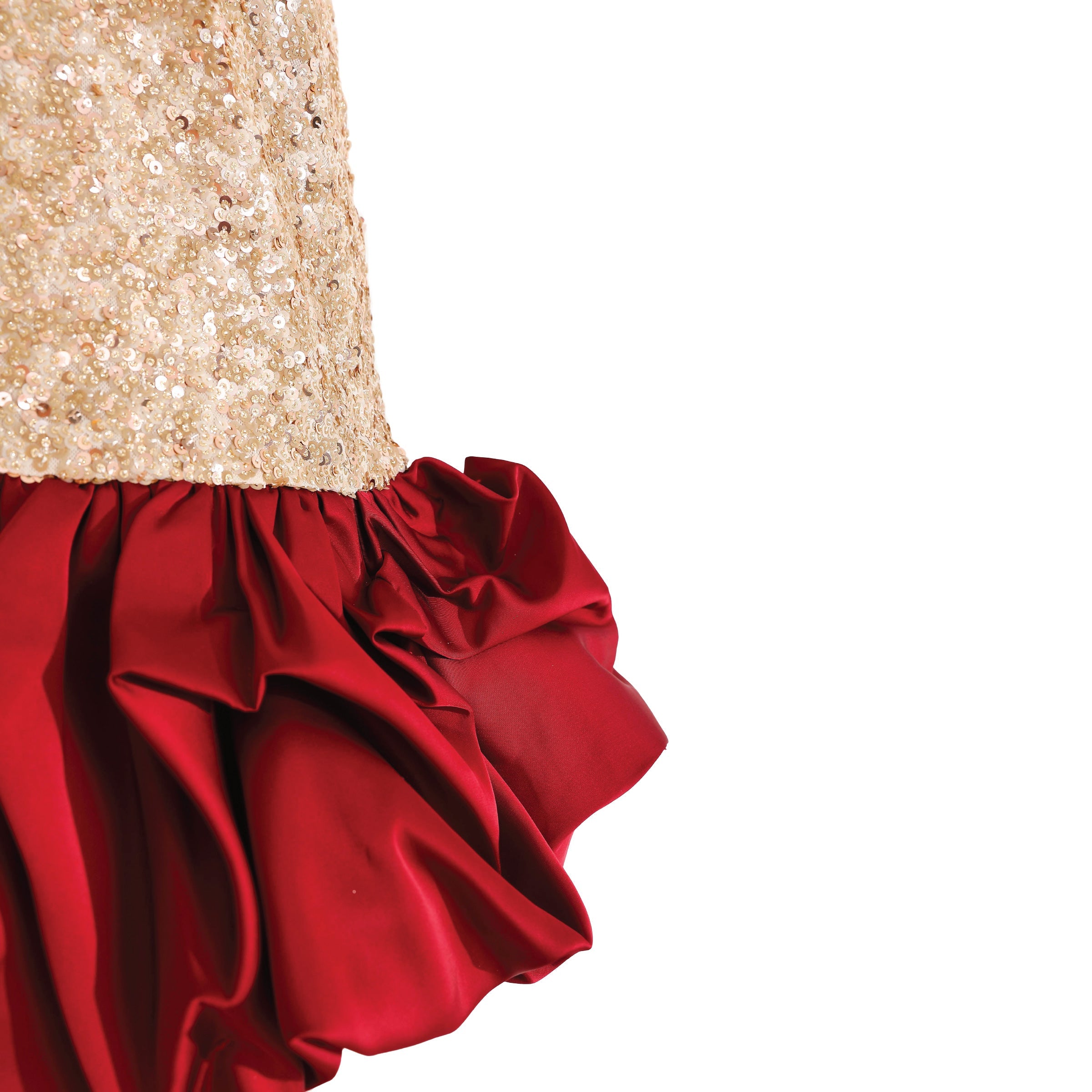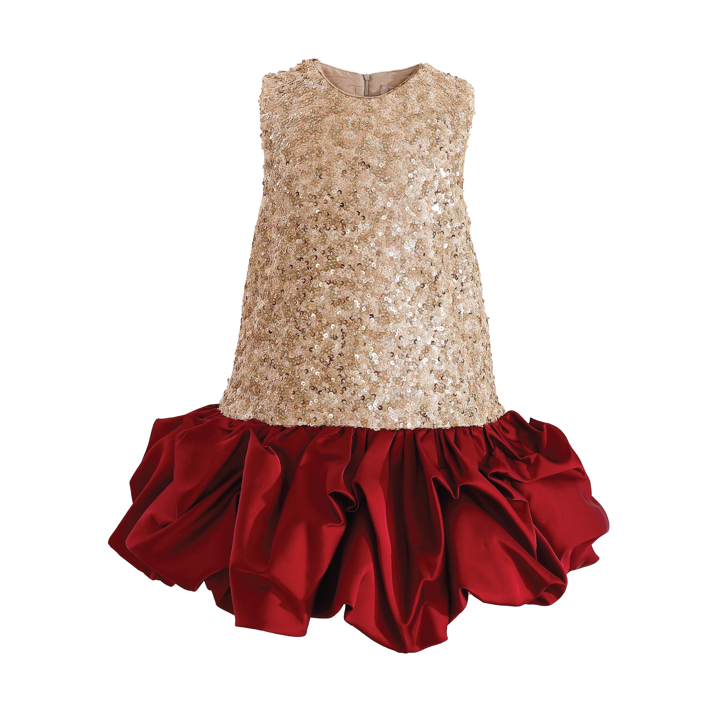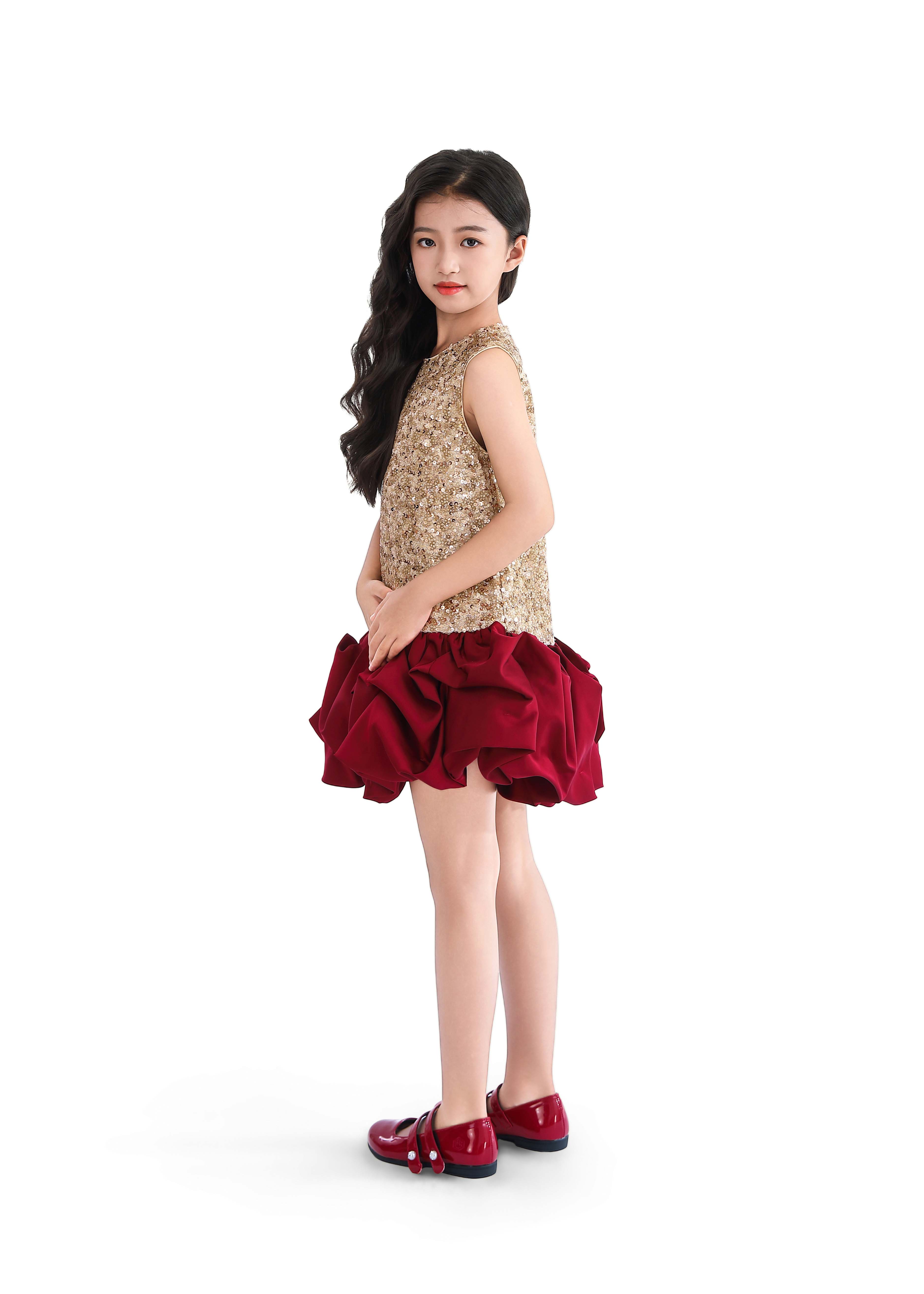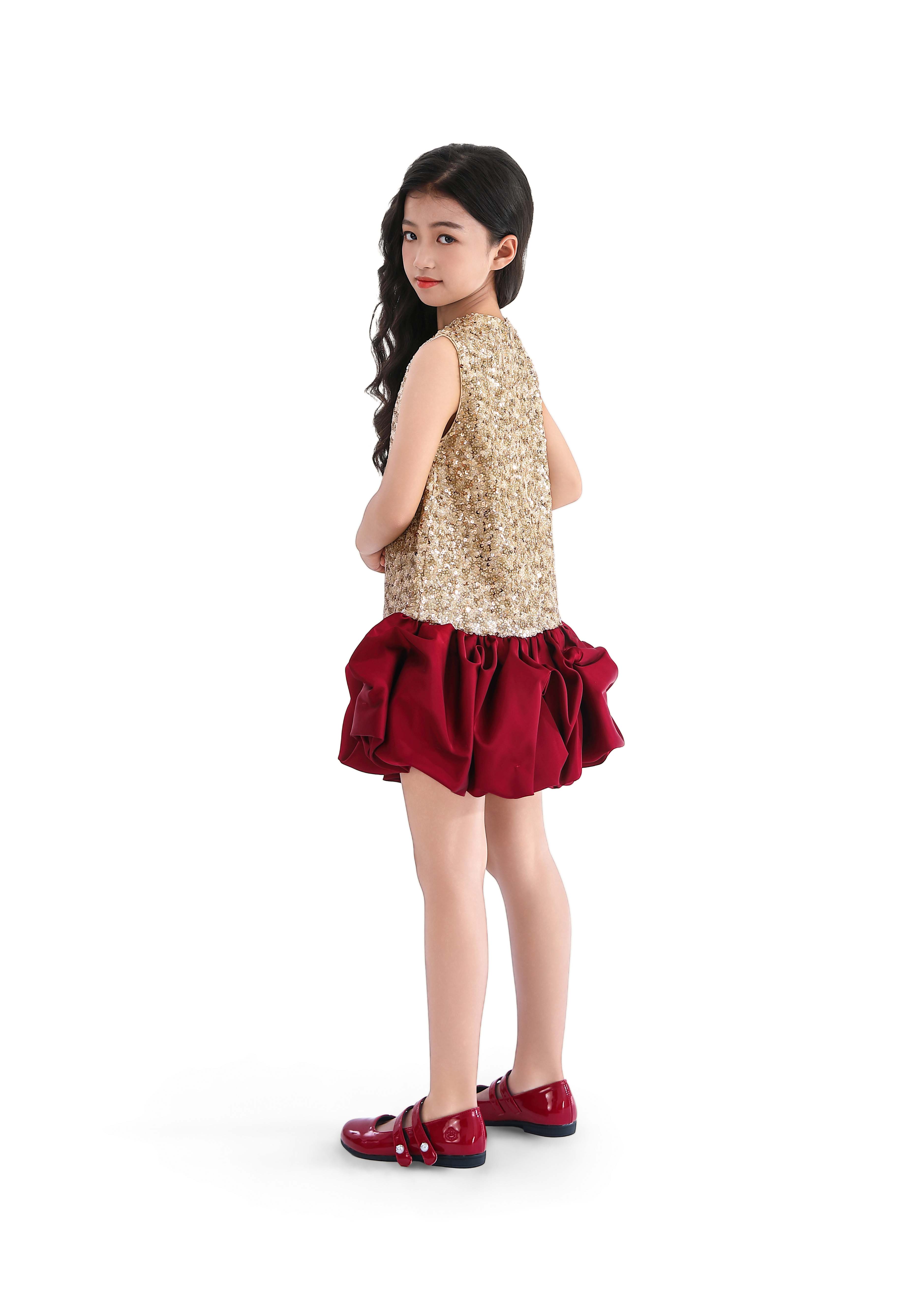 Make her shine with this eye-catching sleeveless dress, where shimmering gold sequins meet a voluminous red ruffle hem. Perfect for birthdays, holiday parties, or any occasion that calls for sparkle and flair.