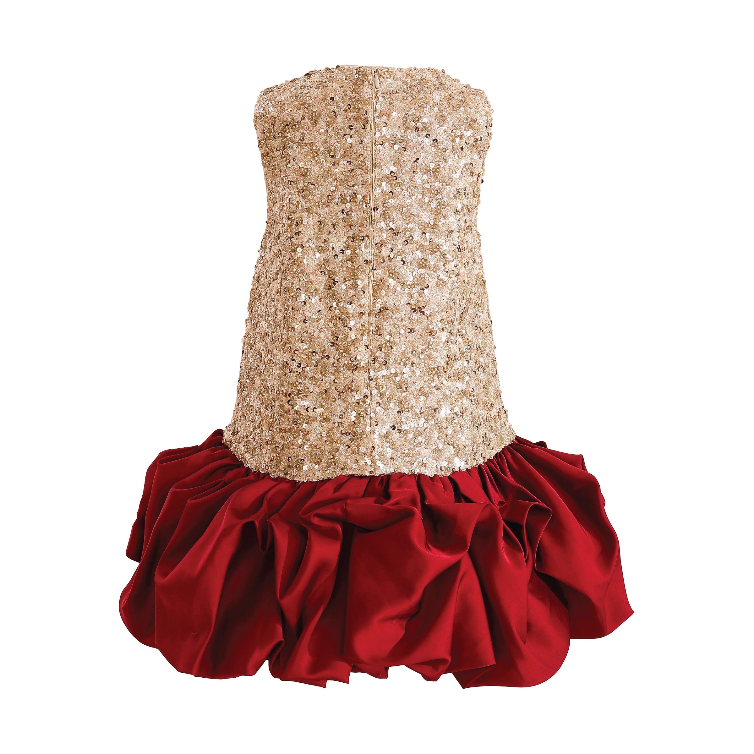 - Dramatic red bubble skirt adds volume and playful elegance