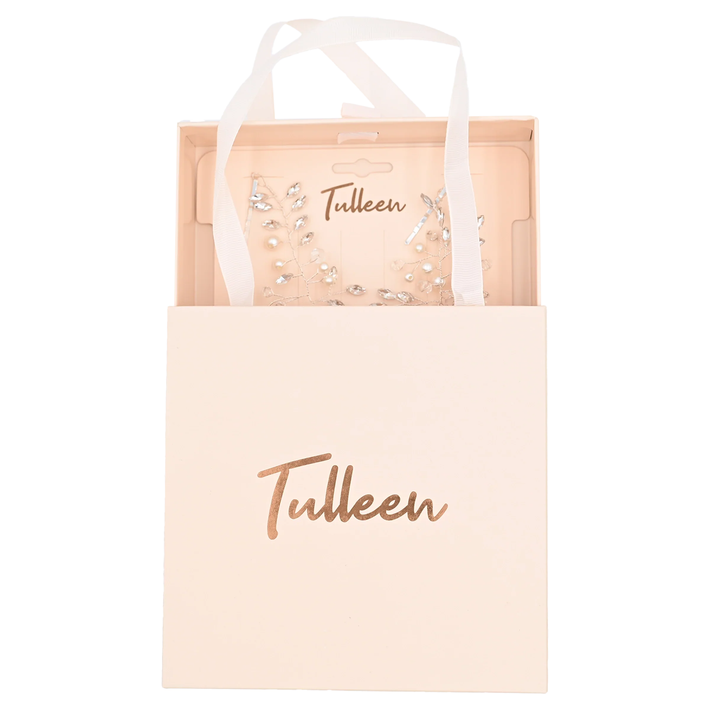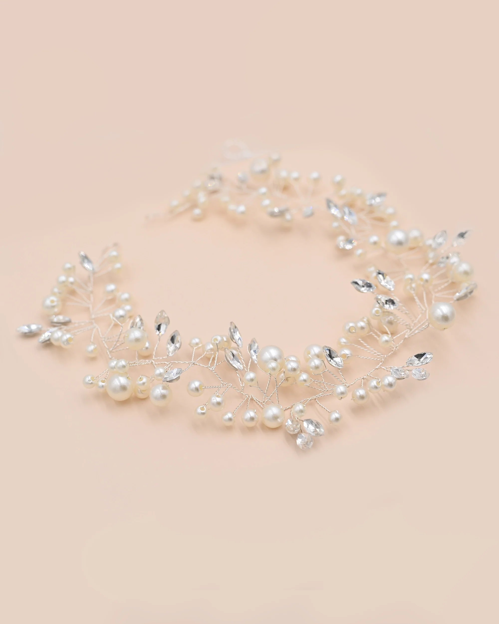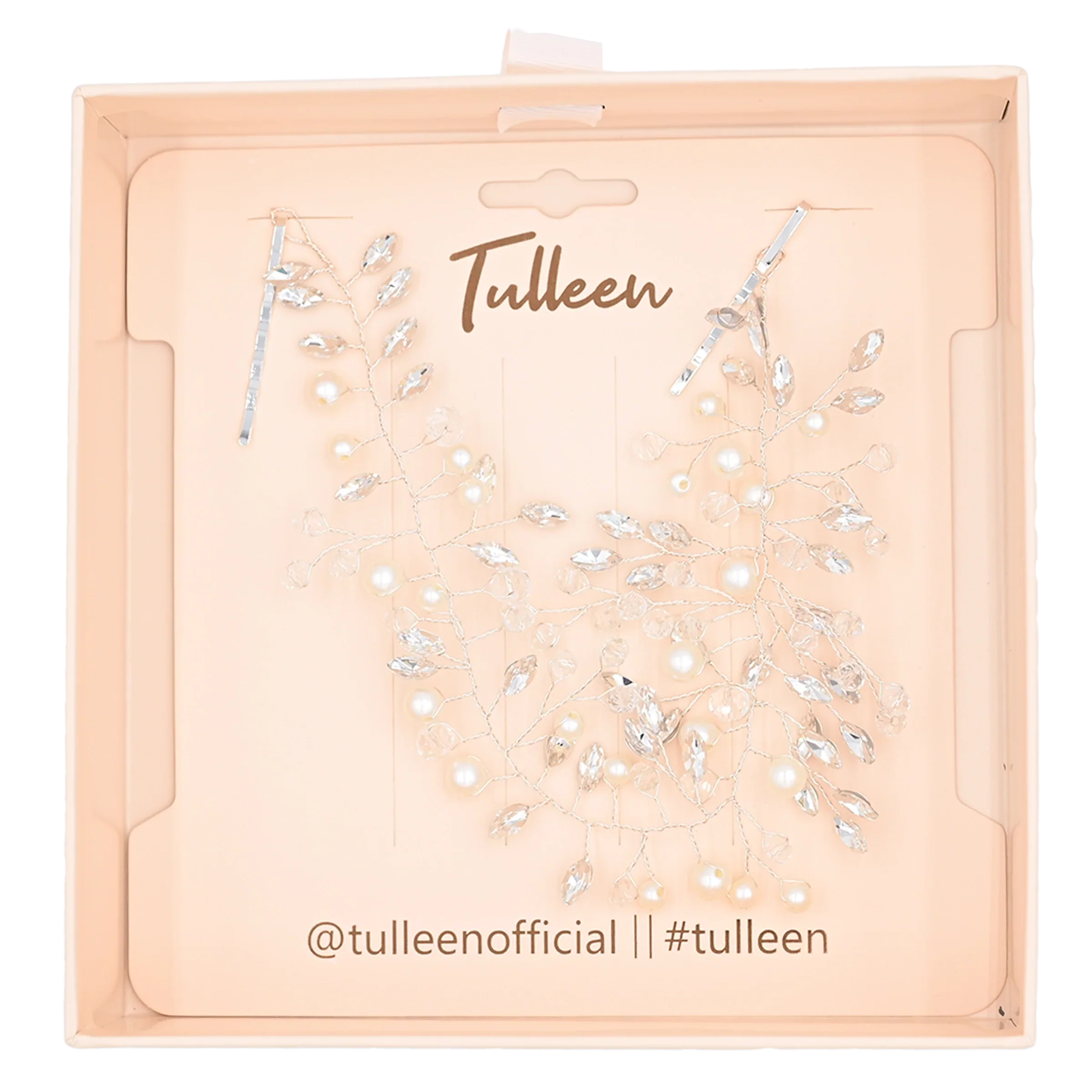 Crystal Glimmering Pearl Hair Vine for kid girls from Tulleen. Featuring a leaf gem and crystal design with pearl appliques with bobby pin closure.