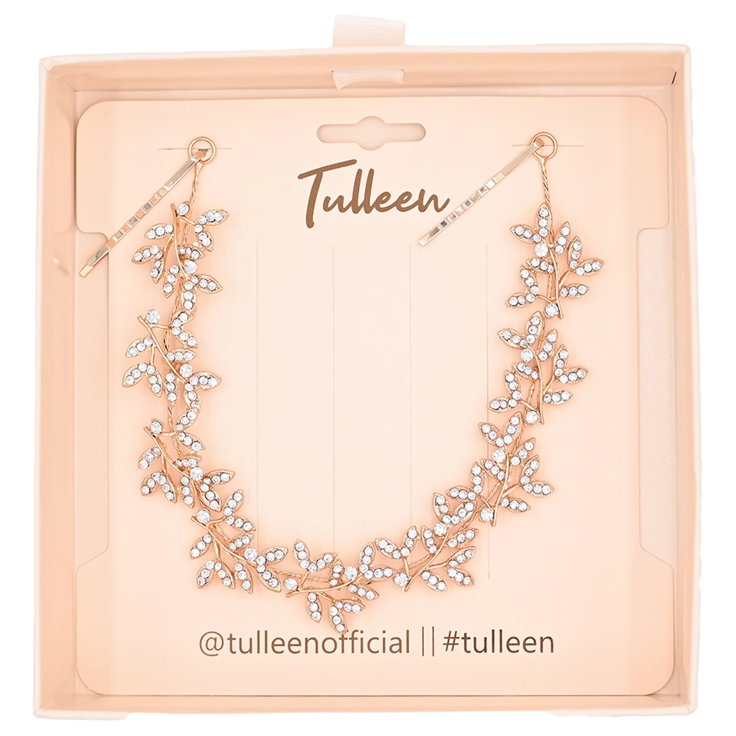 Crystal Shimmering Rose Gold Hair Vine for kid girls from Tulleen. Featuring a leaf gem and crystal design with vine interweaved in design.