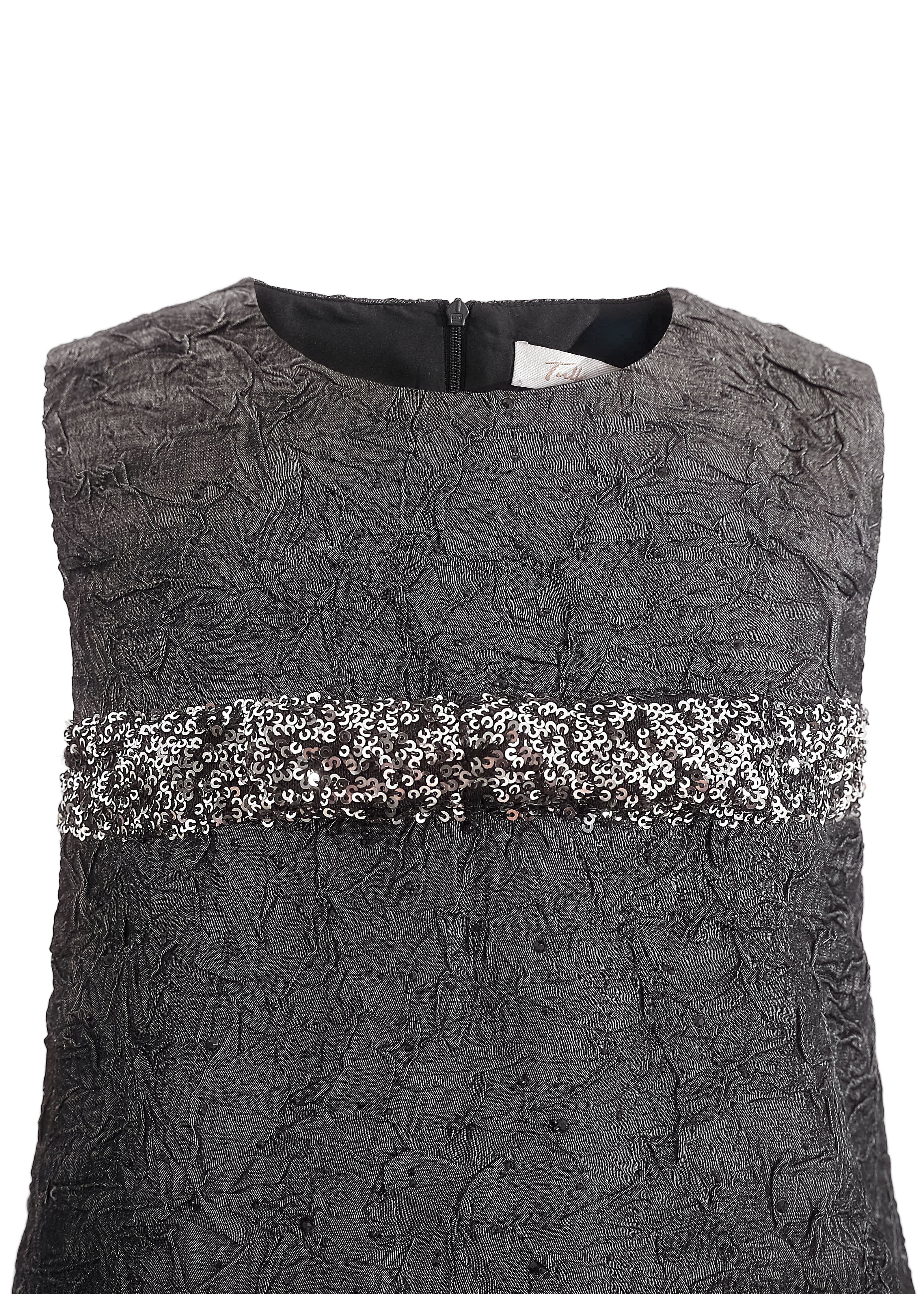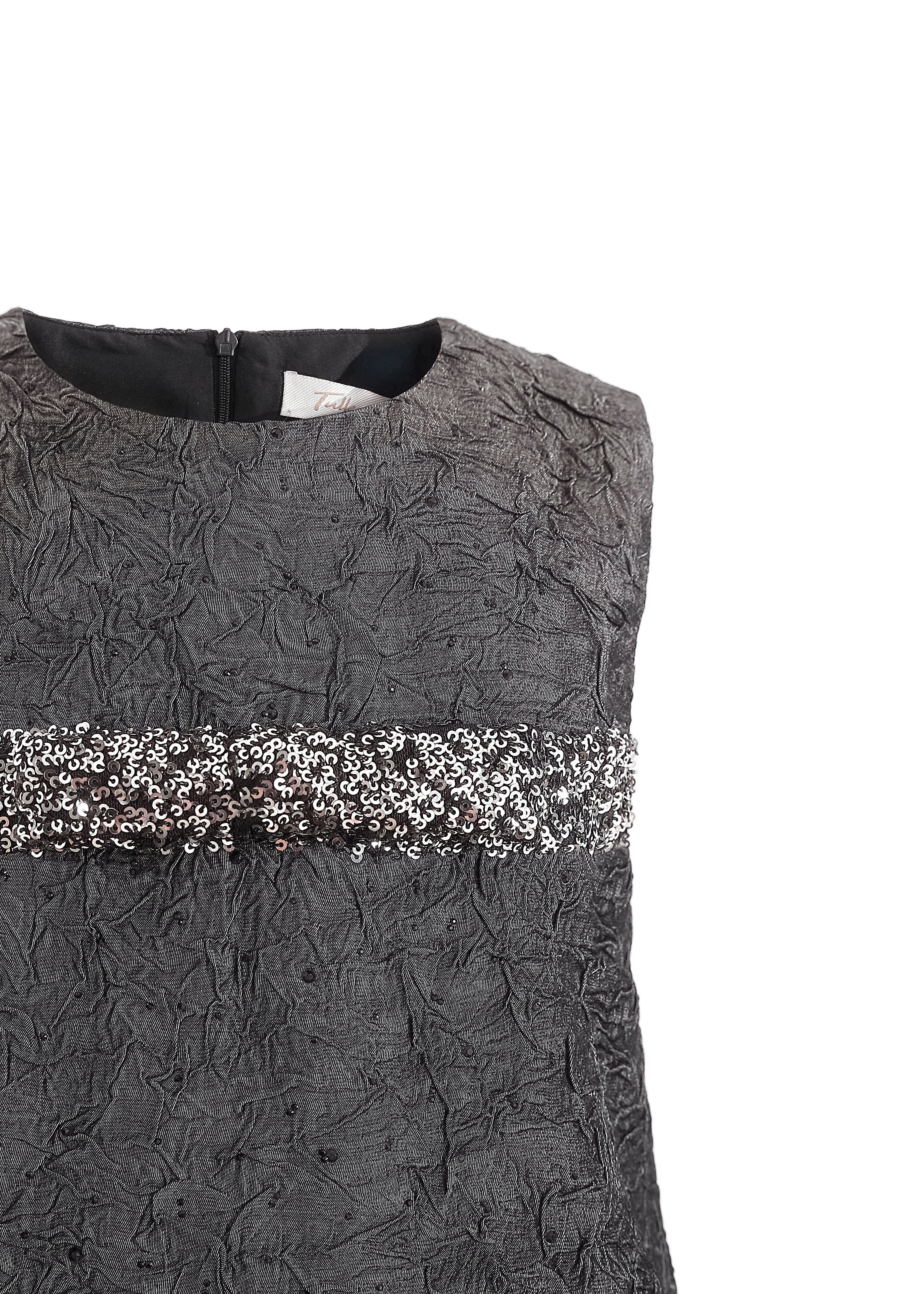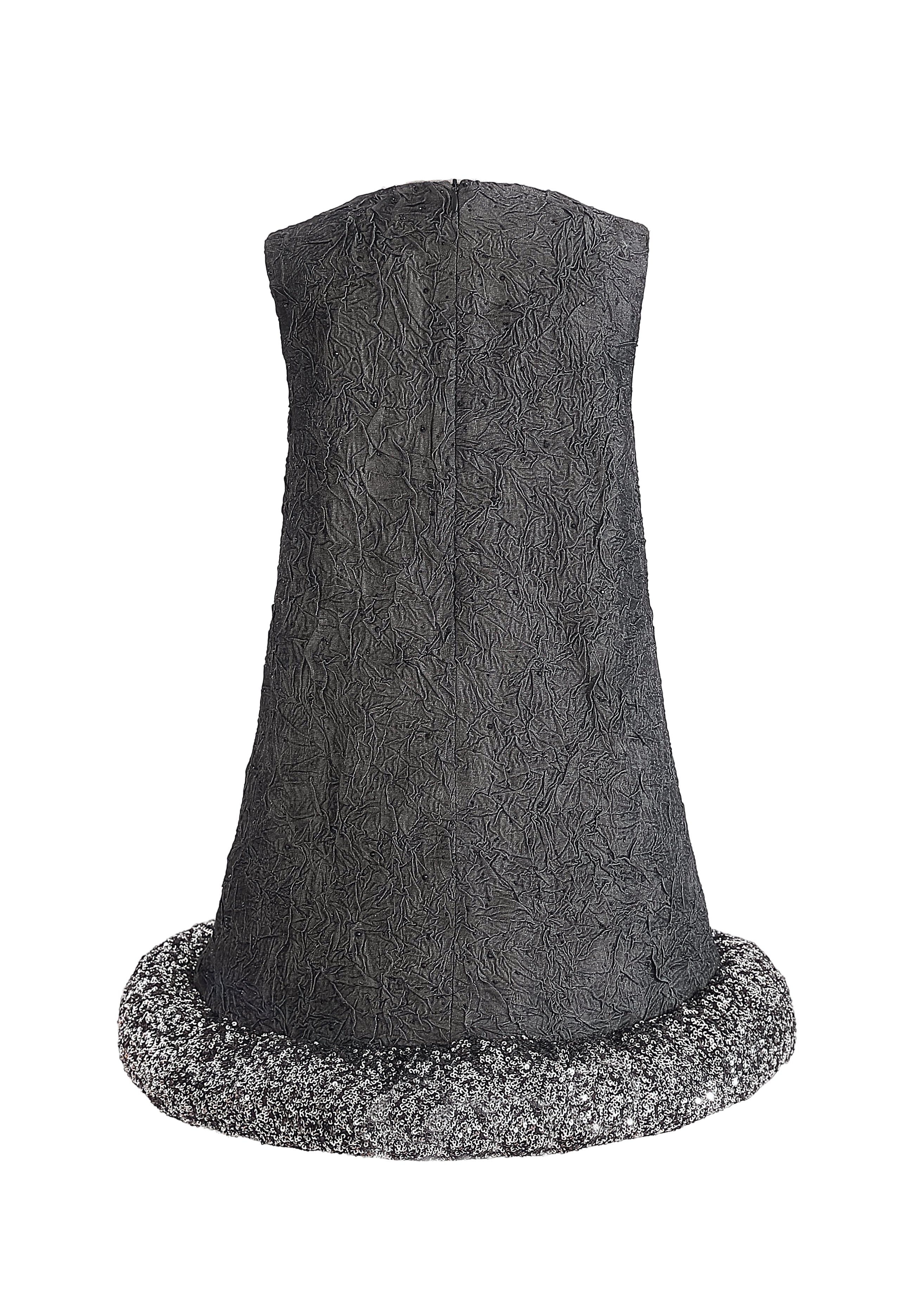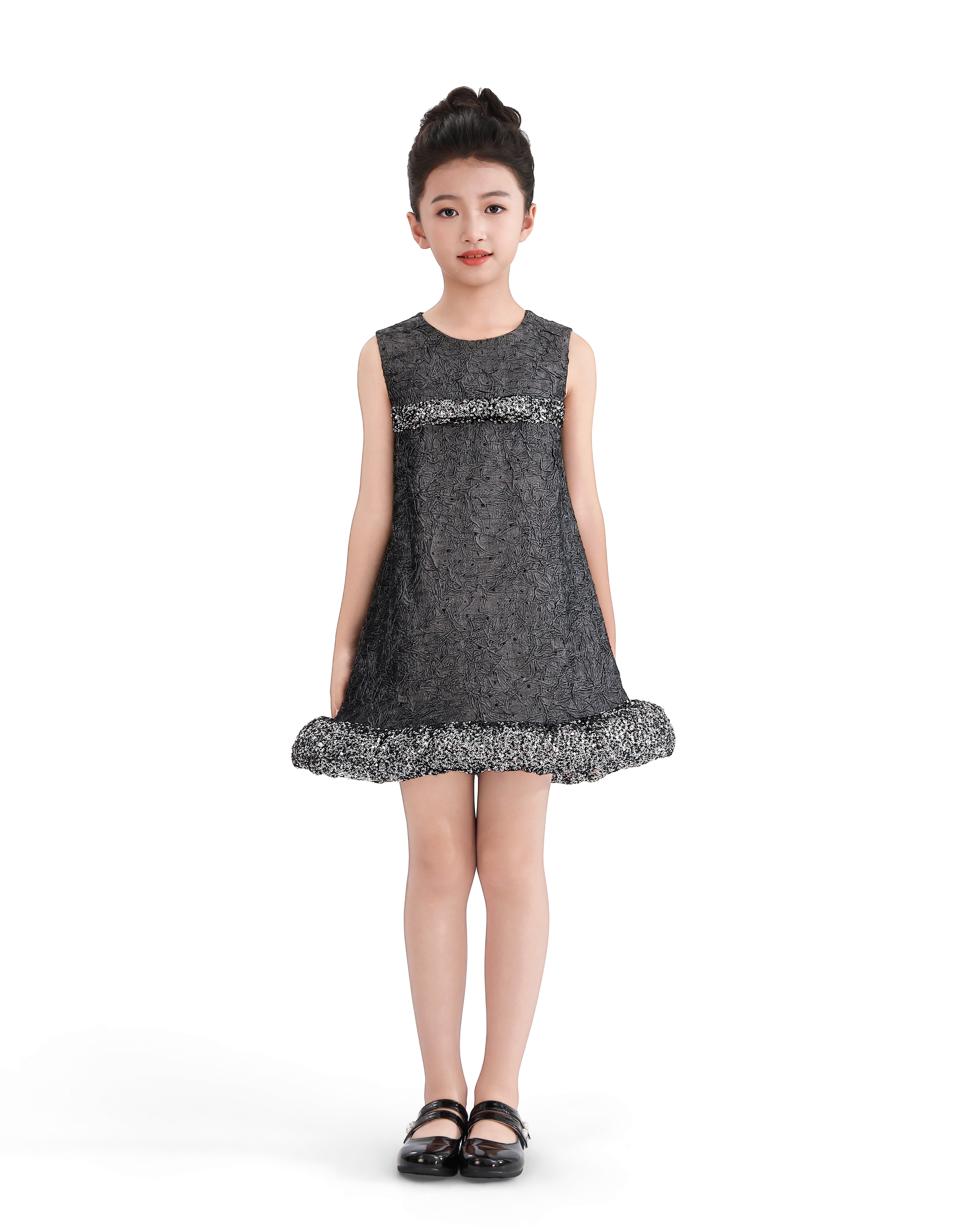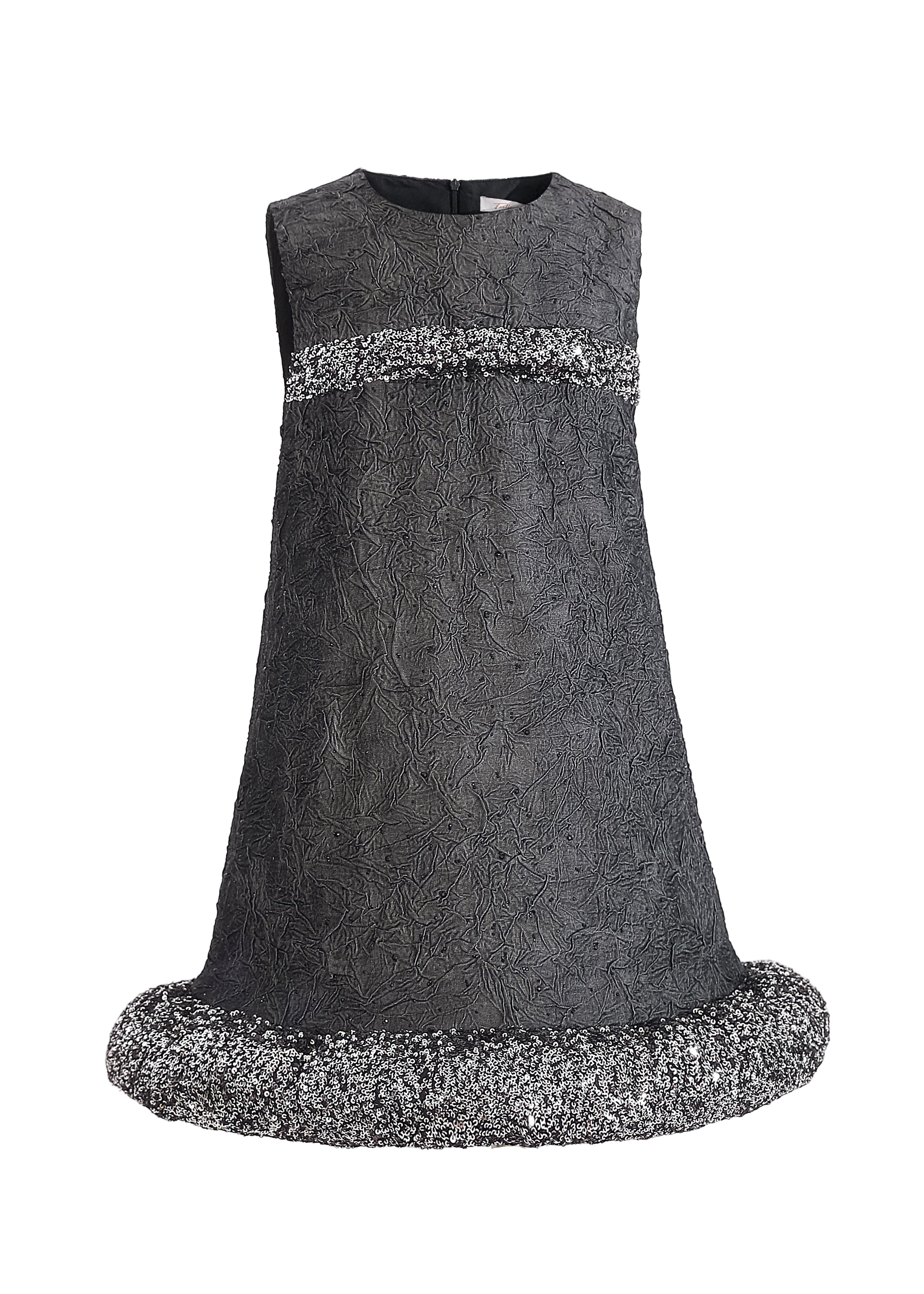 This sleeveless A-line dress blends texture and tone for a refined, modern look. The speckled bands add a playful edge to its minimalist silhouette, making it a standout for dressy occasions.