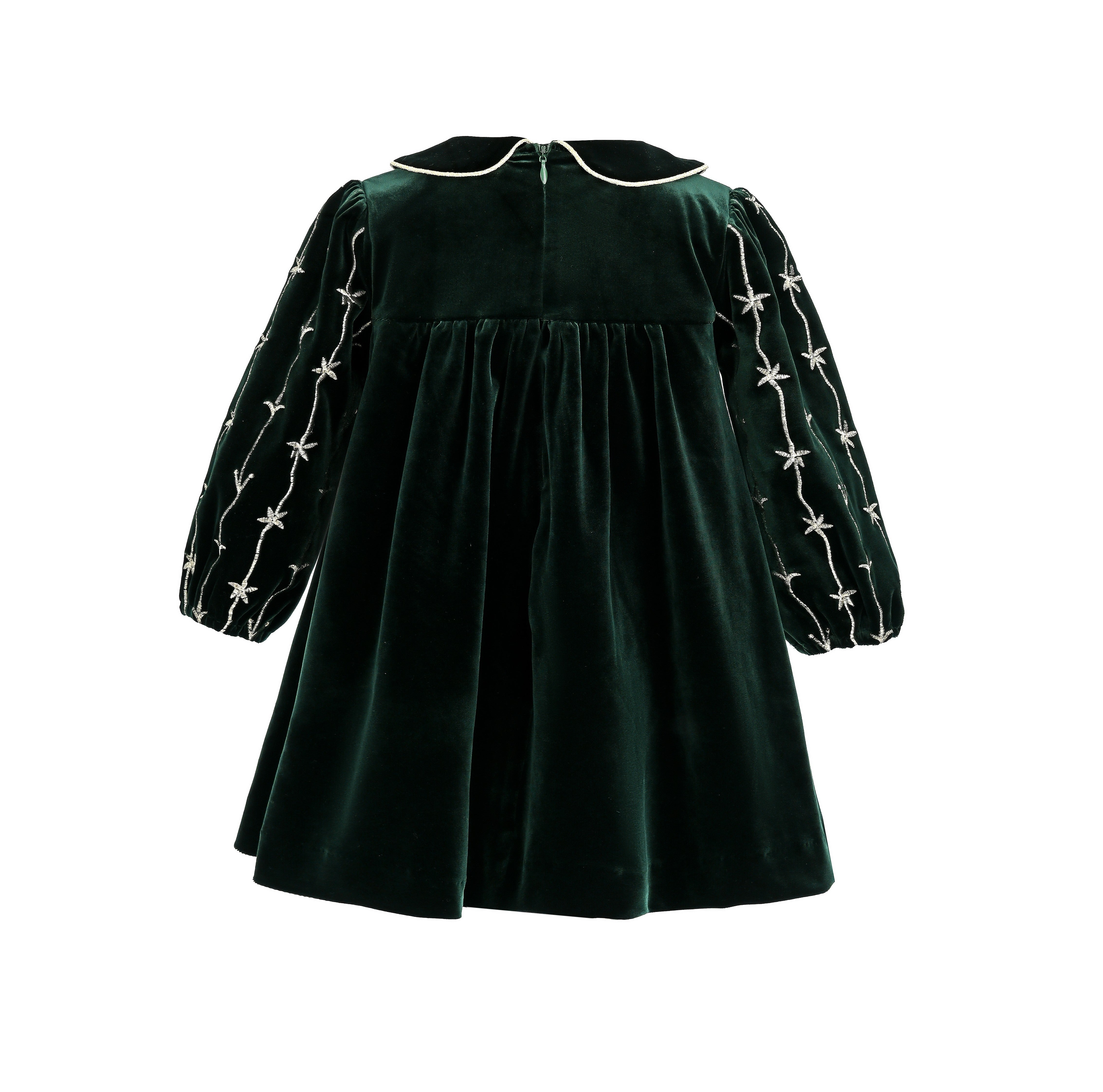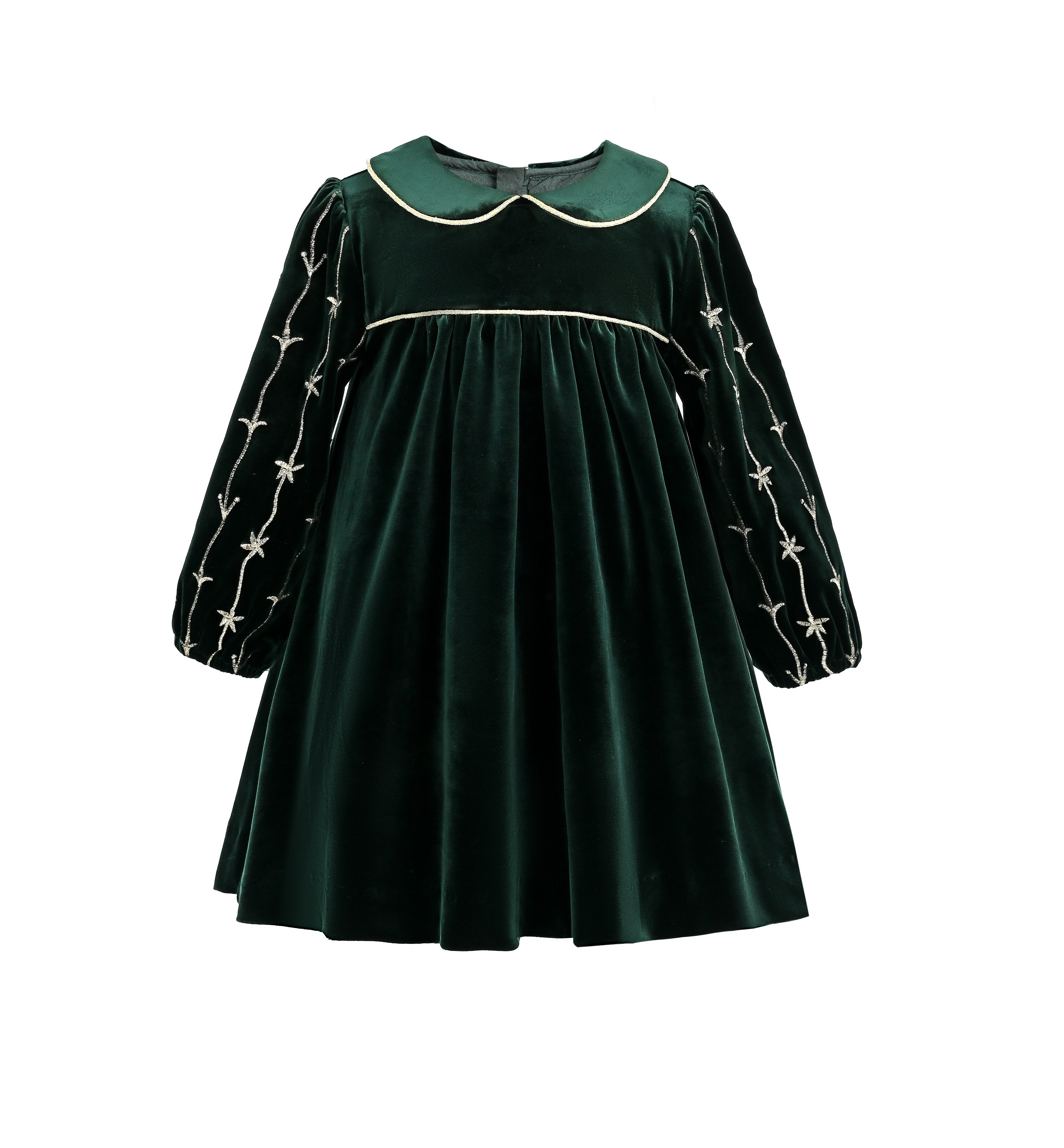 A charming formal piece for young girls, this dress features rich velvet texture, delicate embroidery, and a full gathered skirt—perfect for holiday gatherings or special occasions.