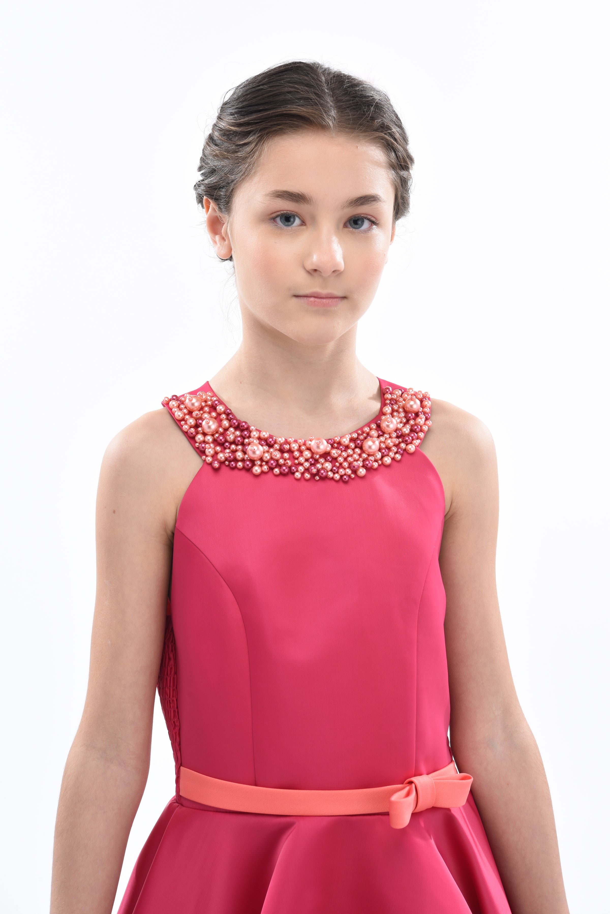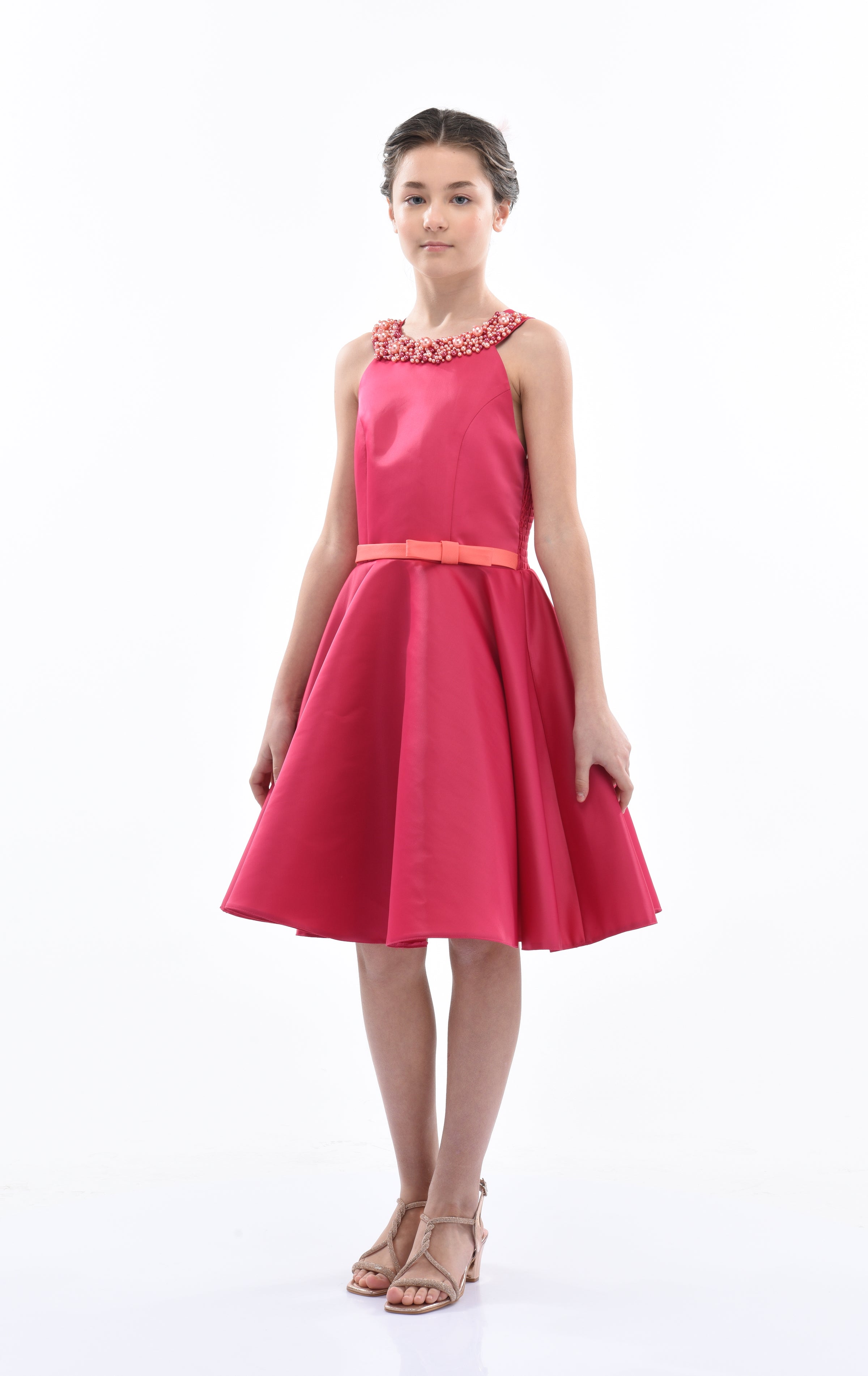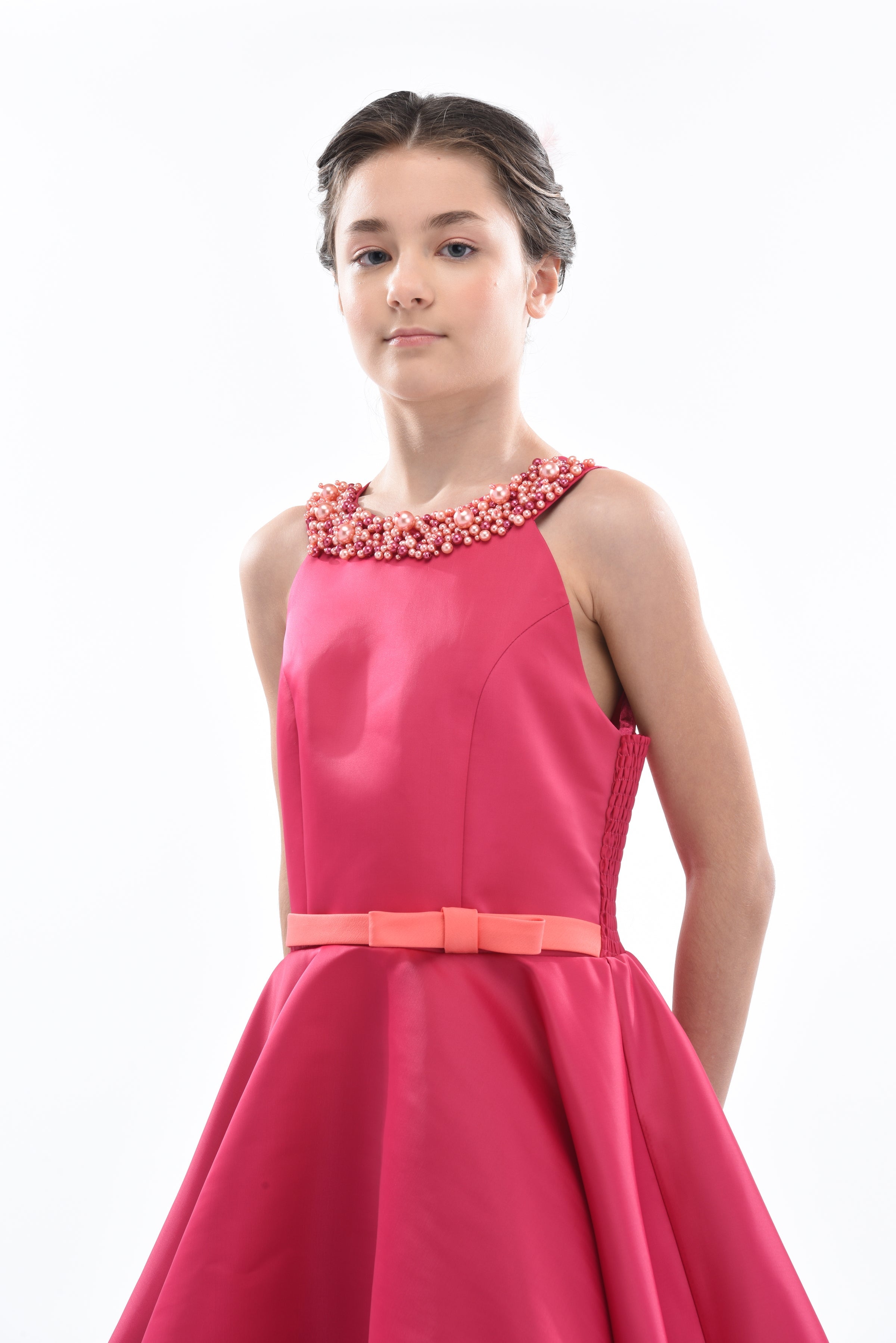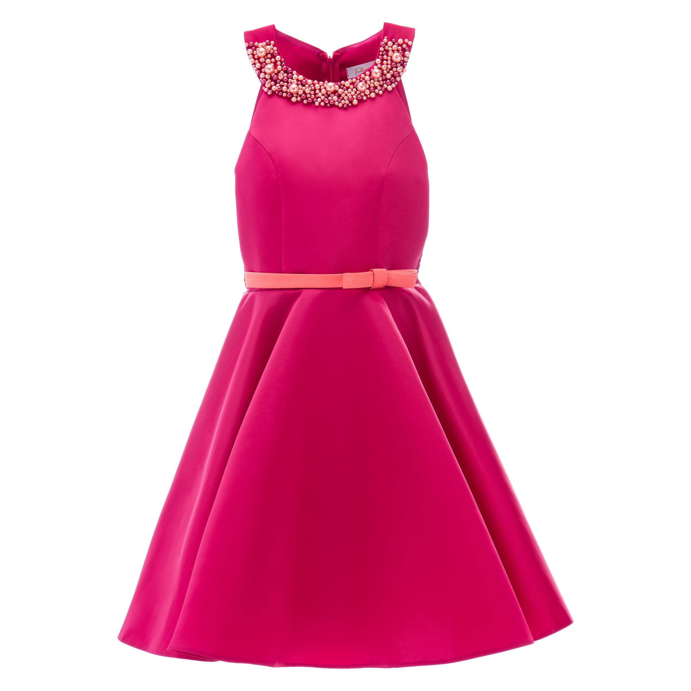 The Fuchsia Pink Cardona Pearl Halter Dress for junior girls from Tulleen is a stunning and elegant choice for any special occasion. This dress features a wonderful halter cut with a pearl-embellished design on the neck, adding a touch of sophistication and sparkle. Firstly, the sleeveless design ensures comfort and ease of movement.