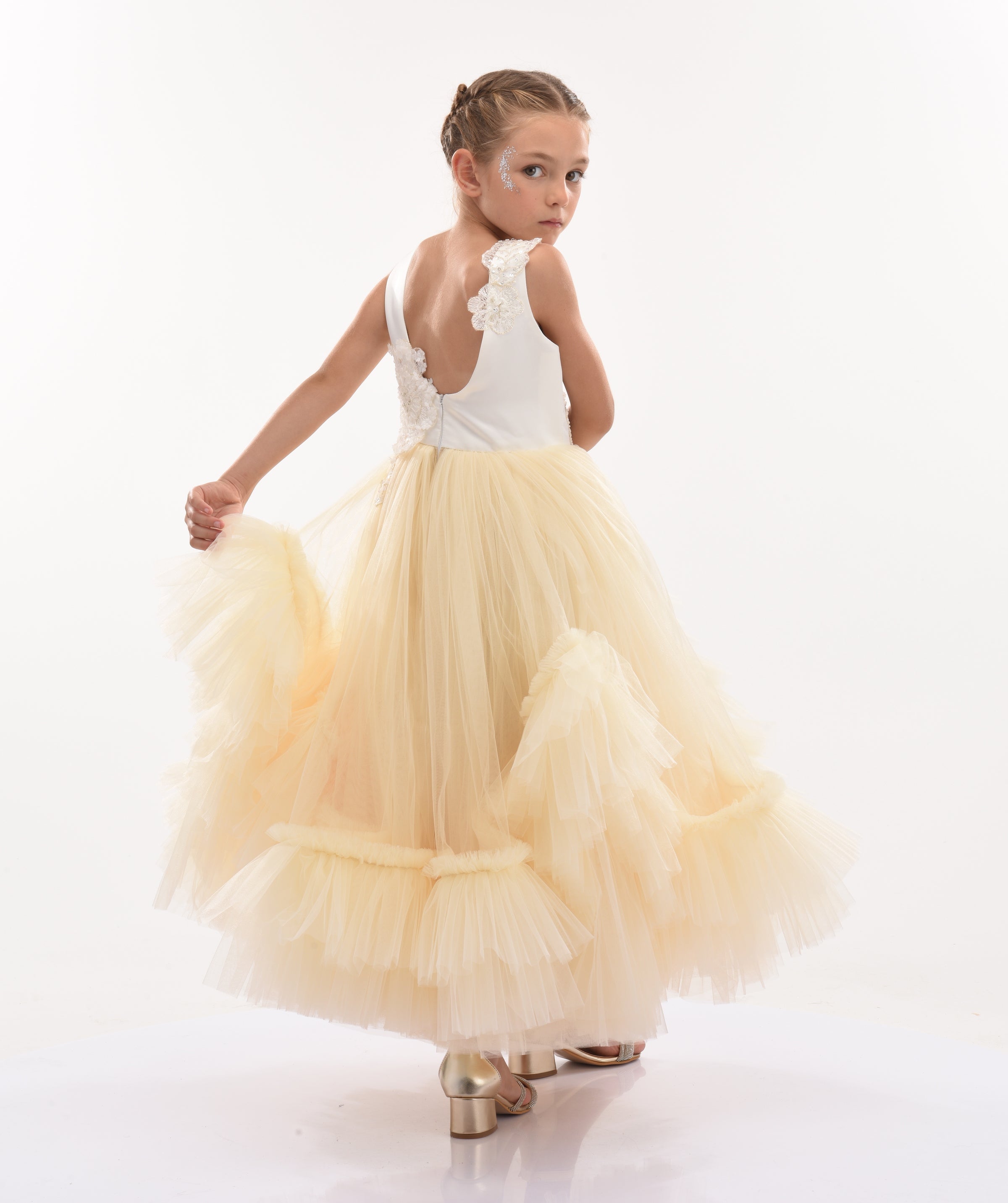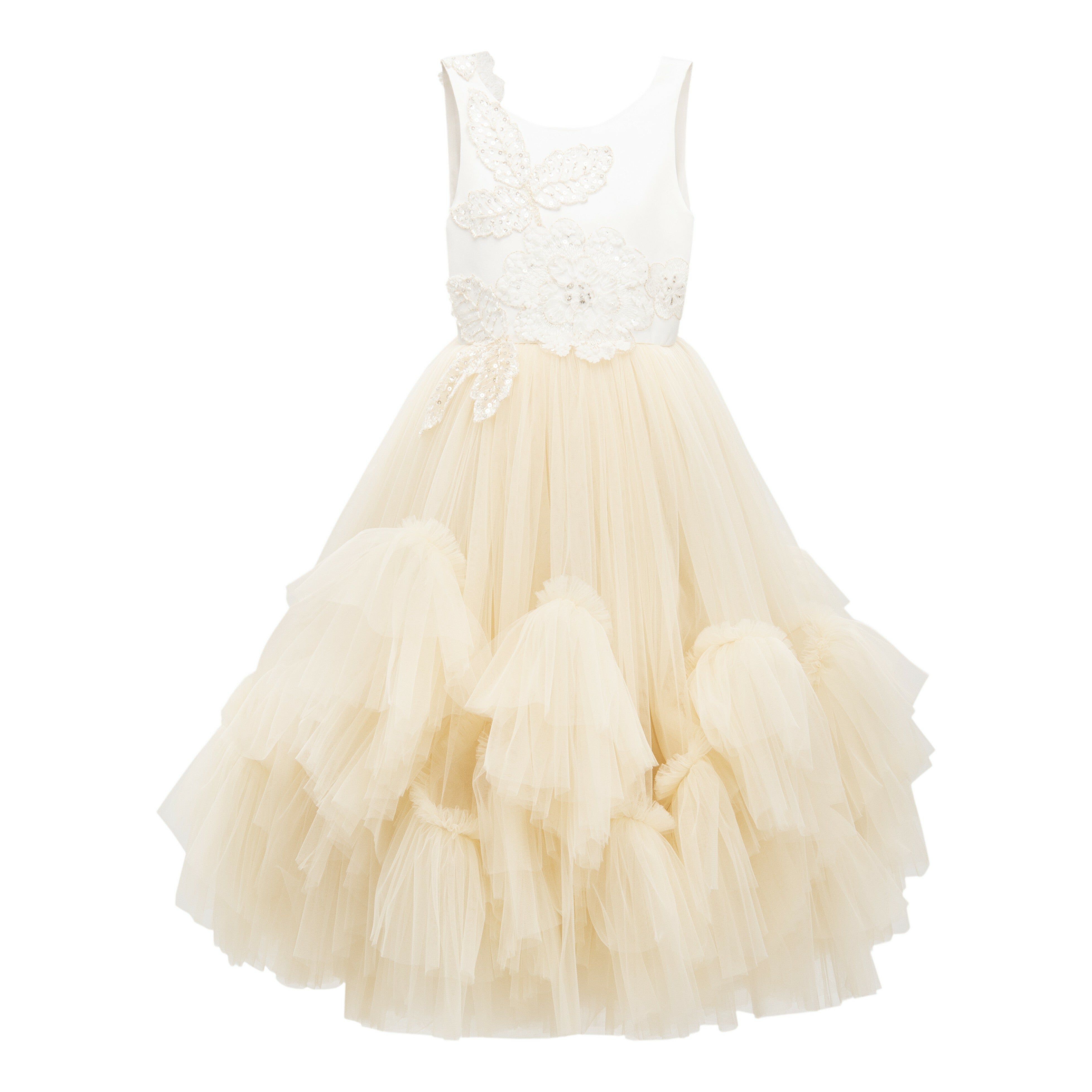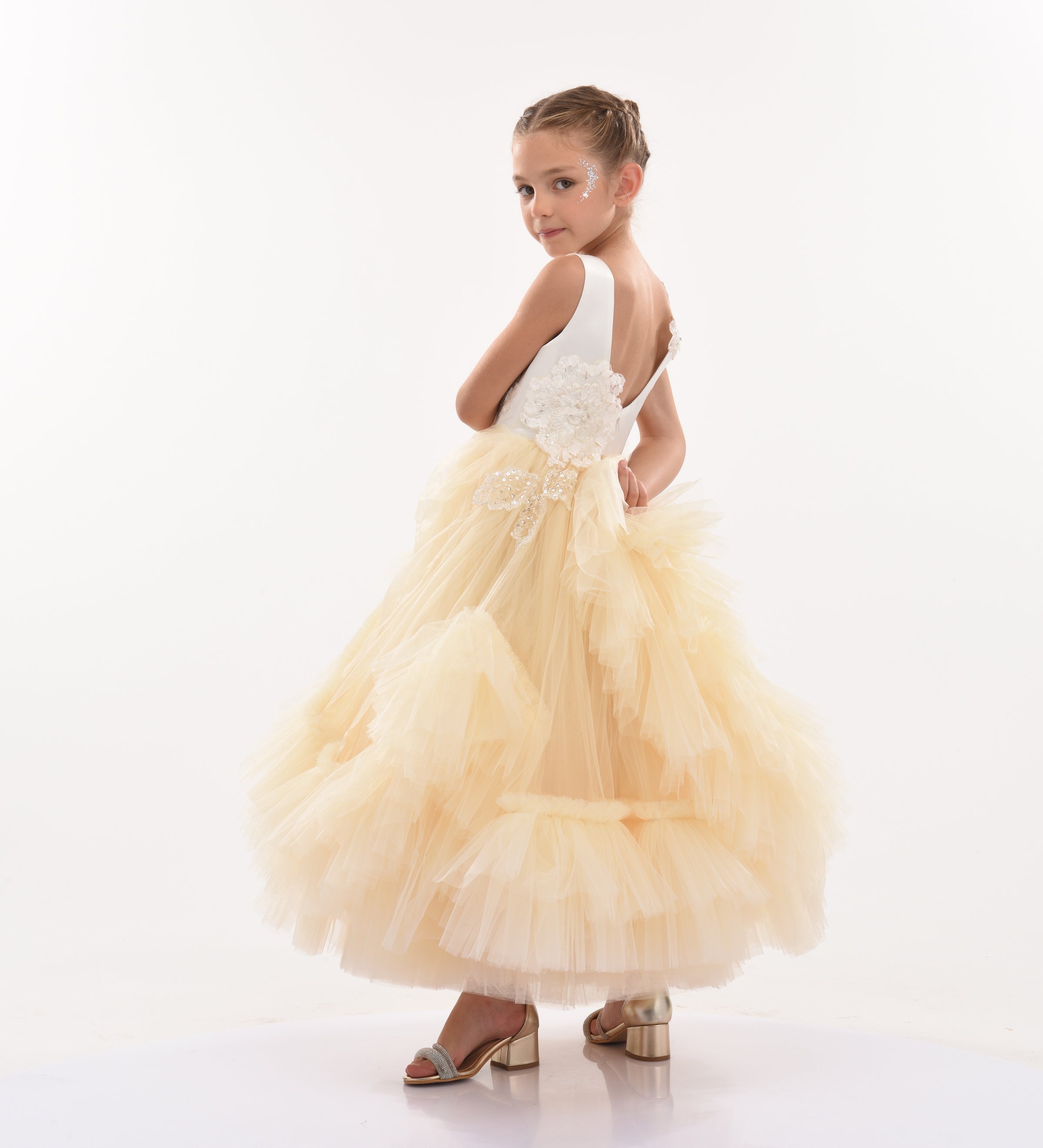 Delve into all the delectable details of this princess ballgown. The white satin top features white and gold hand-crafed beaded embellishment of florals, seamlessly blending into the honey-toned tulle skirt. The tulle elegantly drapes down in ruffled bunches of varying heights to create the perfect silhoutte.