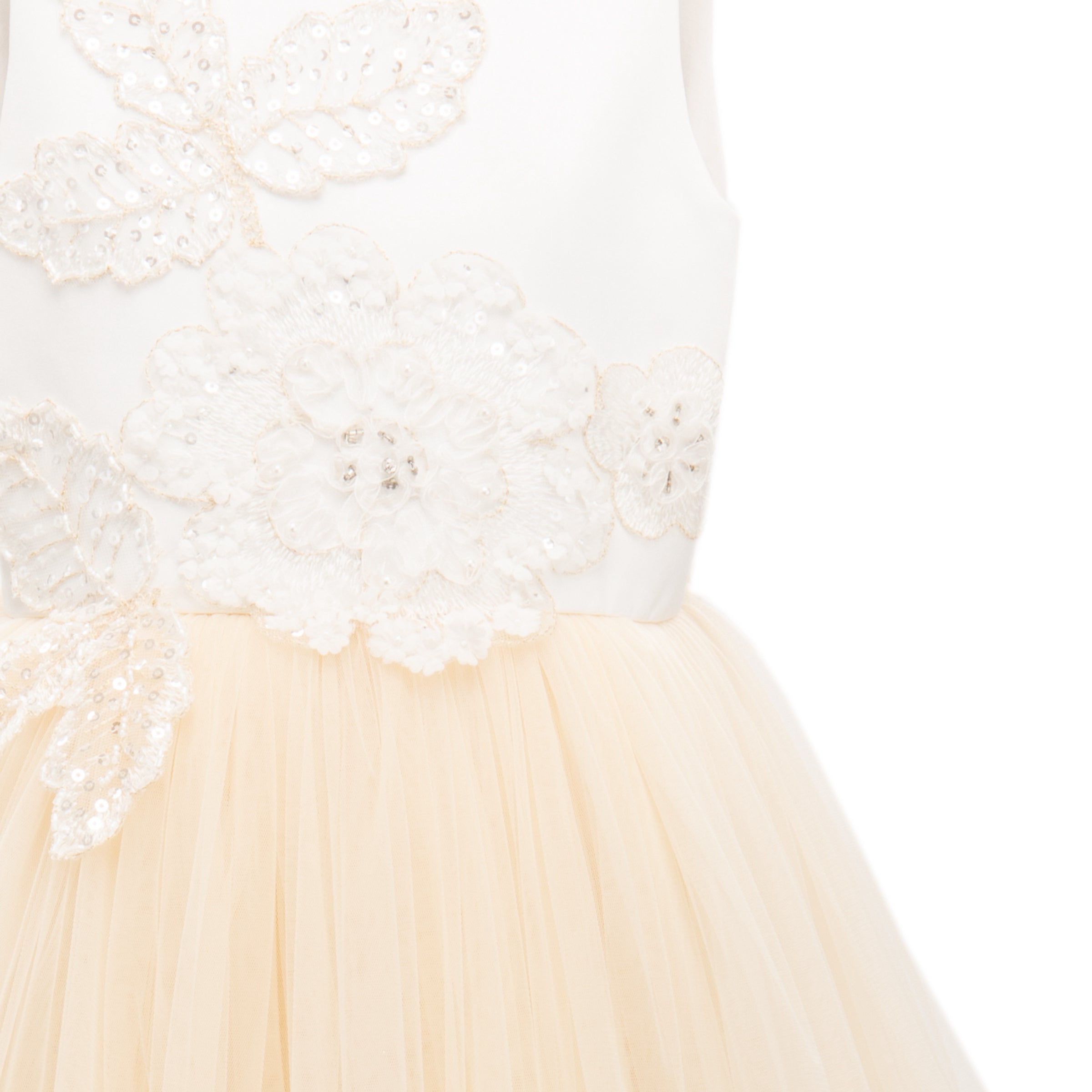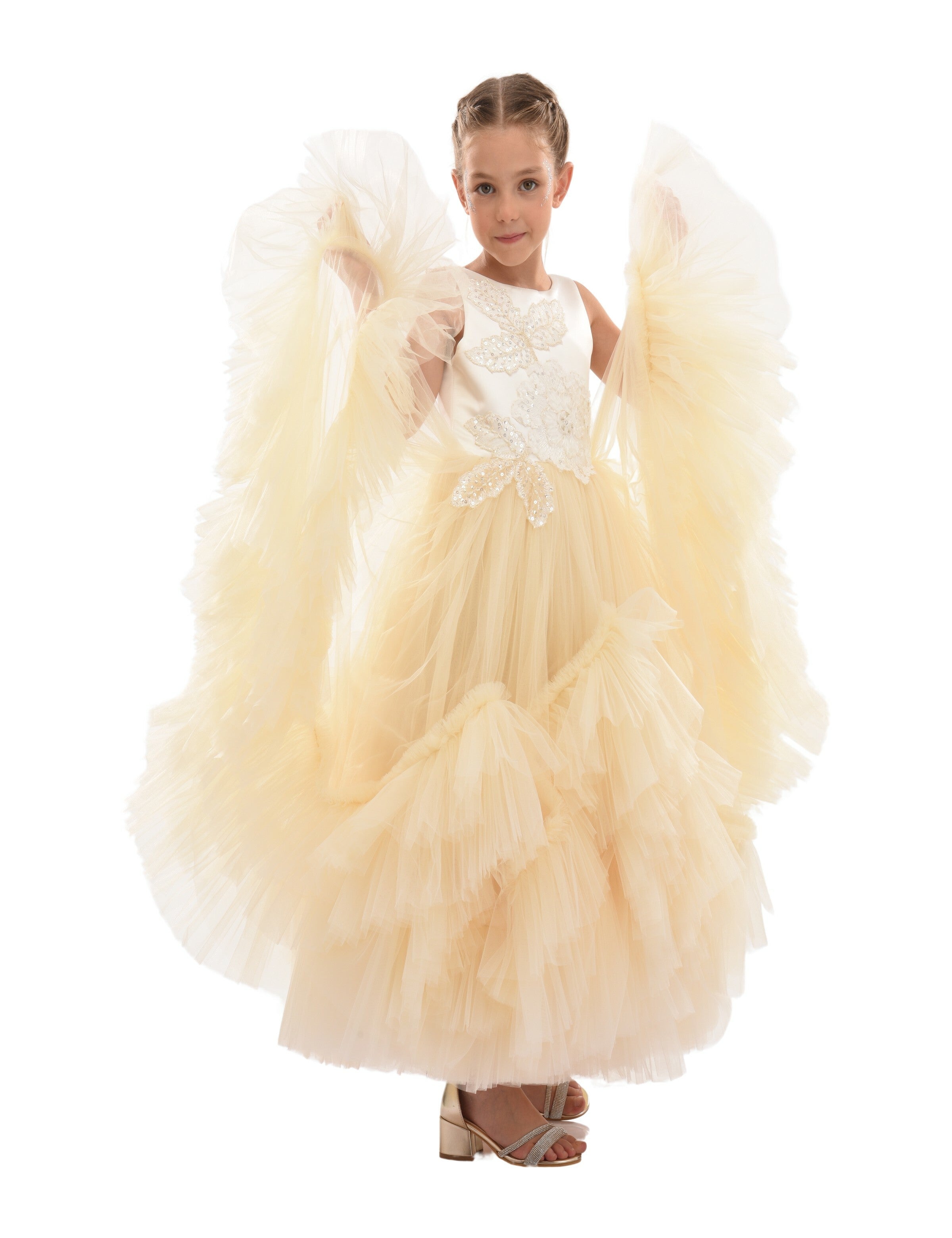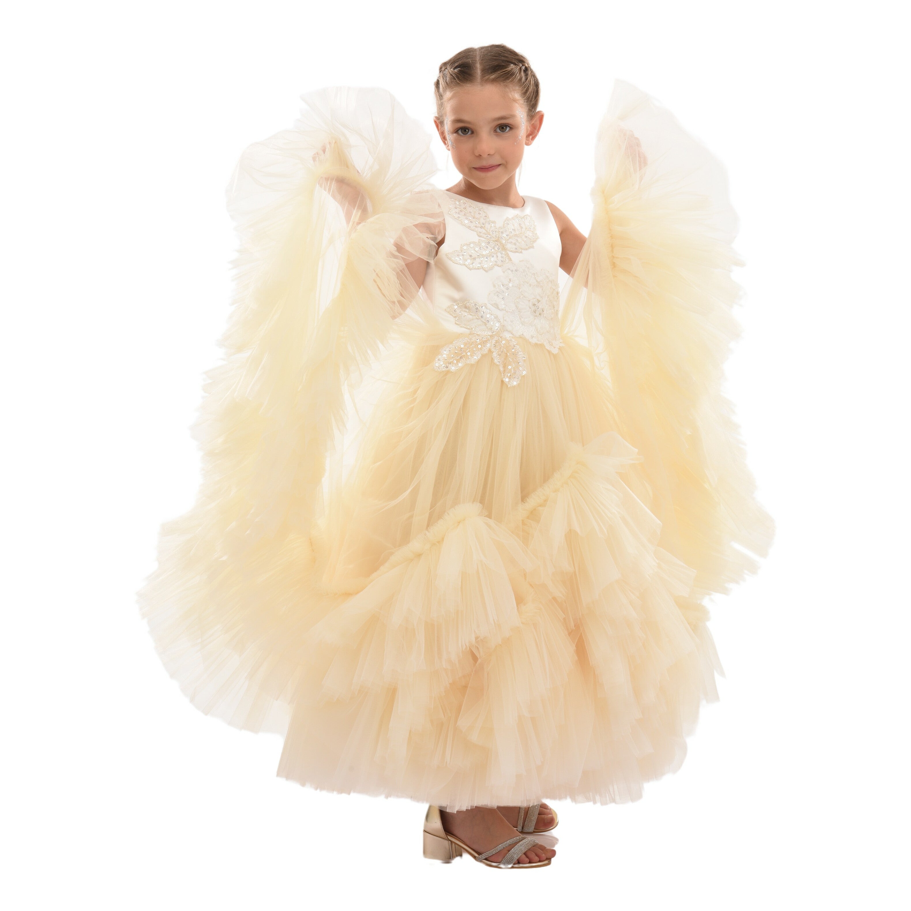 Delve into all the delectable details of this princess ballgown. The white satin top features white and gold hand-crafed beaded embellishment of florals, seamlessly blending into the honey-toned tulle skirt. The tulle elegantly drapes down in ruffled bunches of varying heights to create the perfect silhoutte.