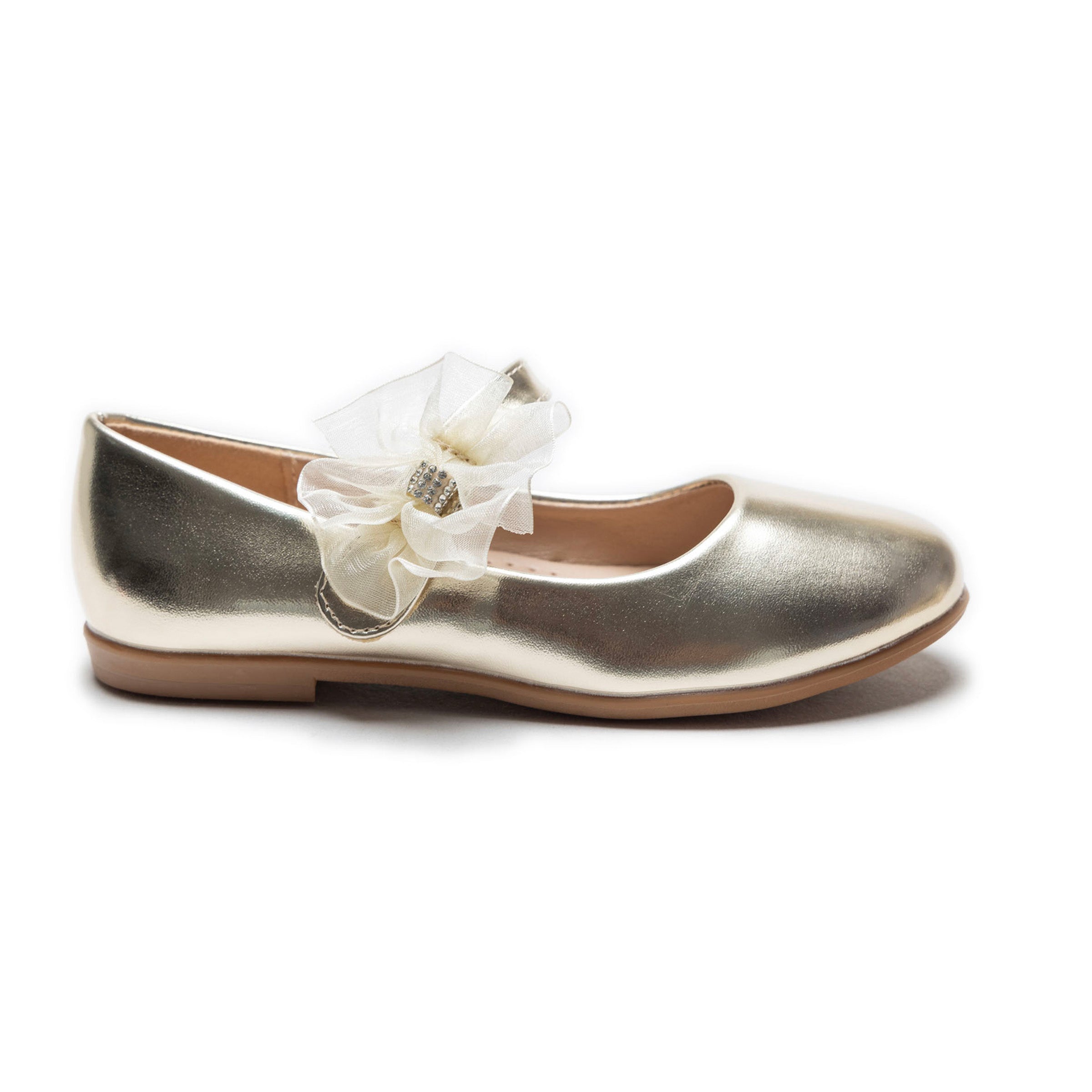 Introducing the Gold Haile Rhinestone Flower Flats by Tulleen, a stunning blend of sophistication and sparkle. The luxurious satin material gleams with a radiant gold hue, creating a soft, shimmering effect that elevates any look. Perfect for adding a touch of glamour, these flats are an ideal choice for young girls who want to stand out in style.