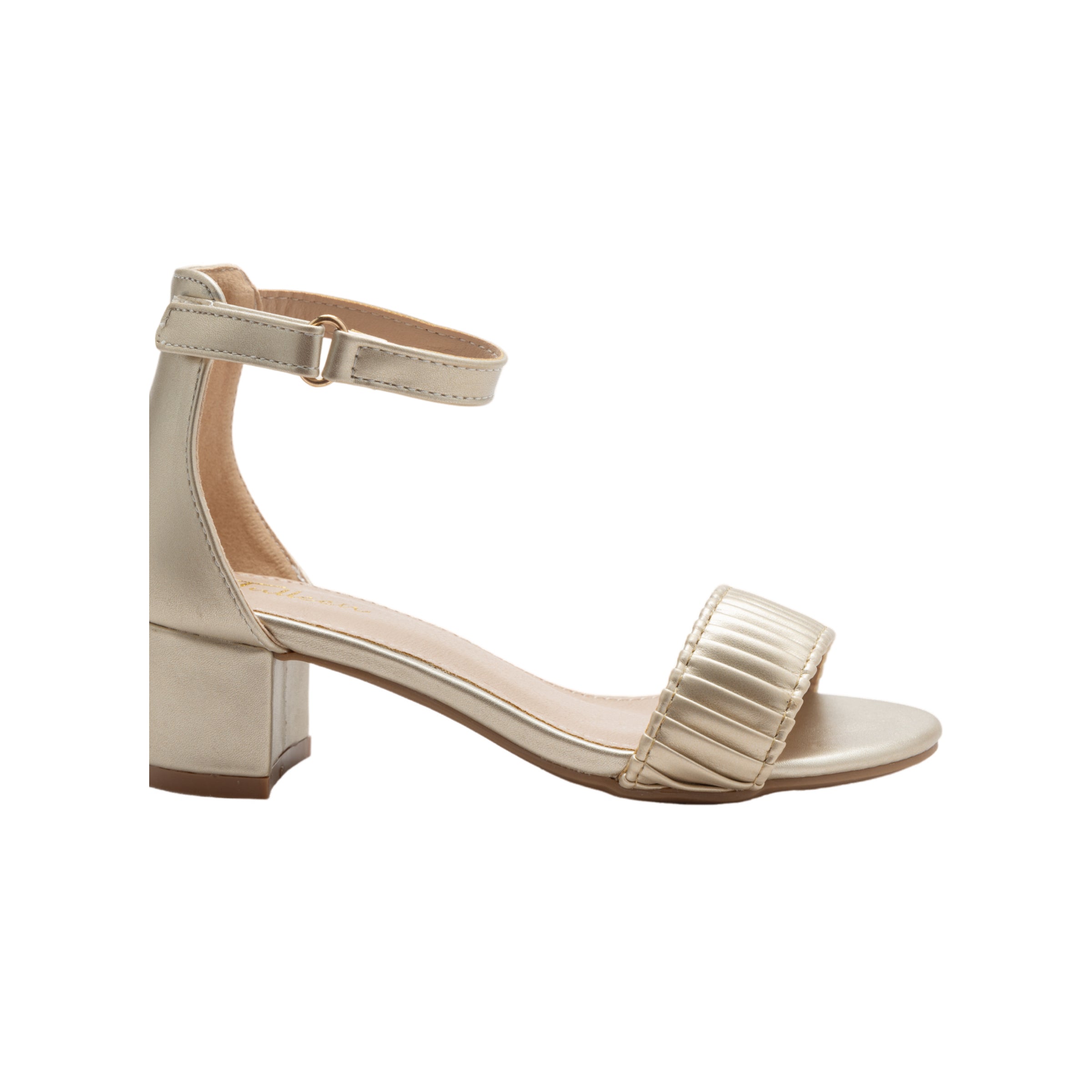 The pleated lined band across the front adds a layer of refined charm, enhancing the overall design with its chic and shimmering appeal. The Gold Pleated Lined Band Block Heels by Tulleen are a standout addition to any little girl's wardrobe.