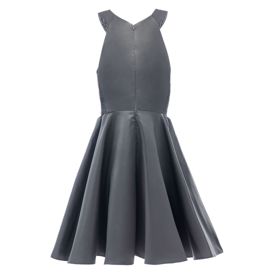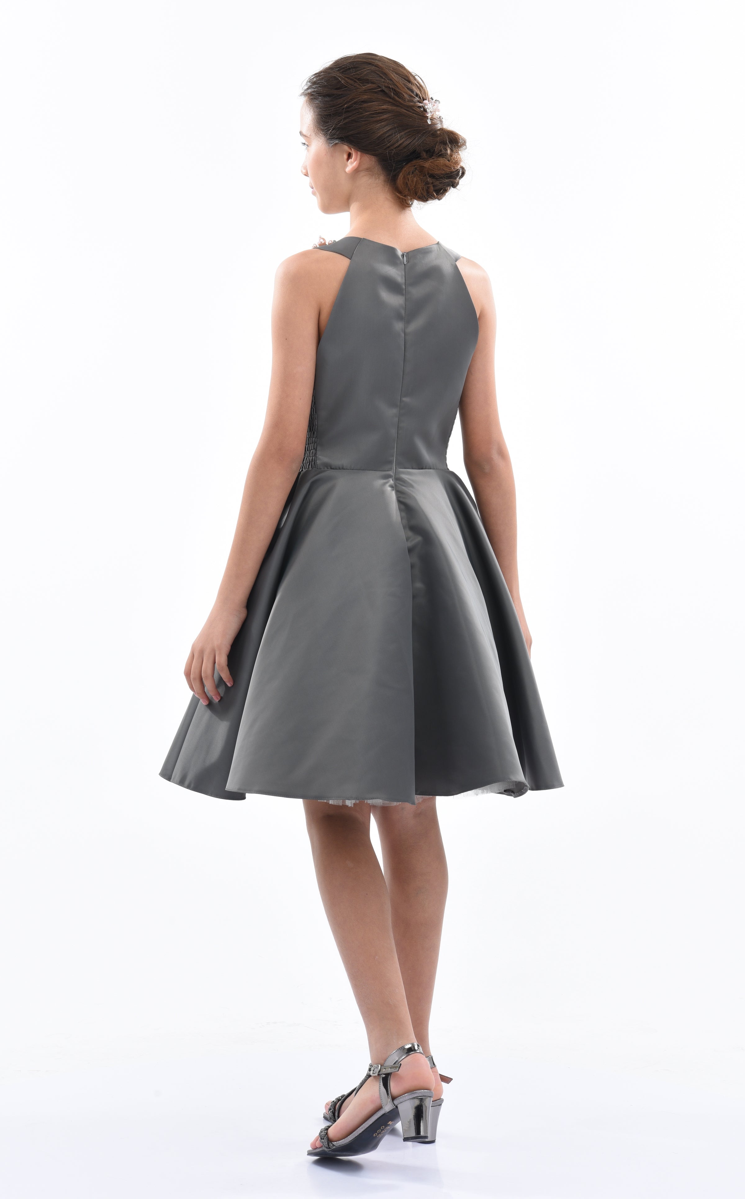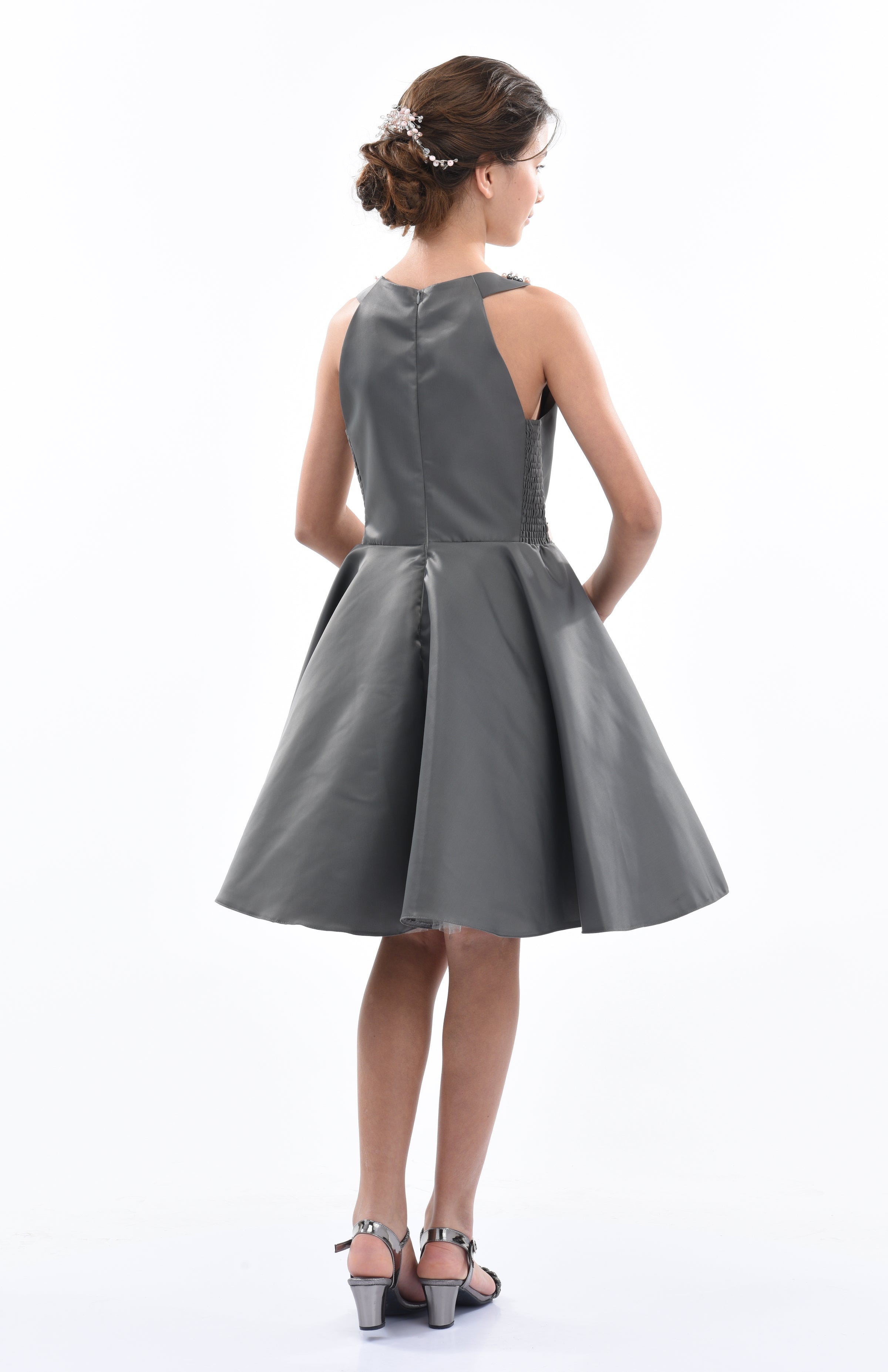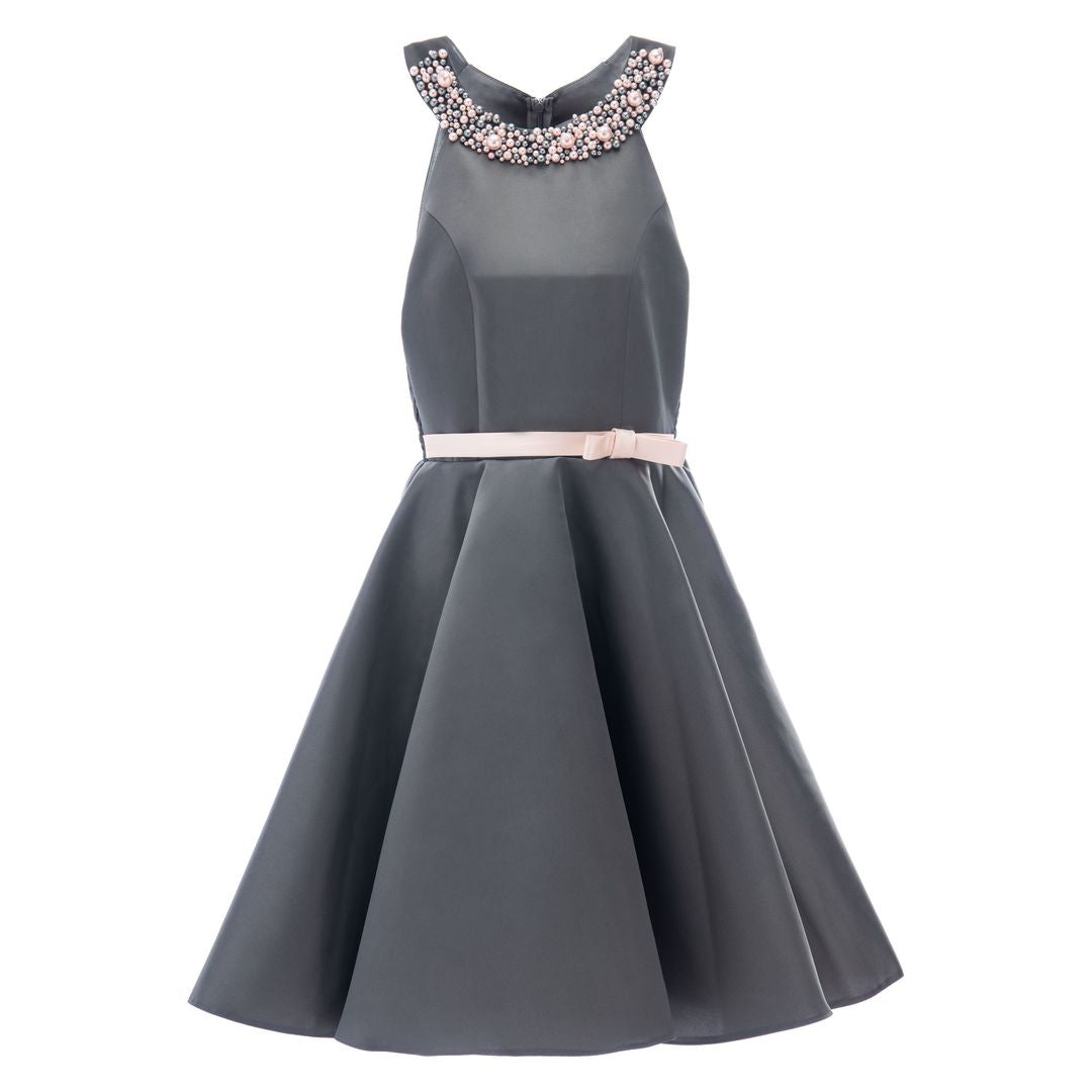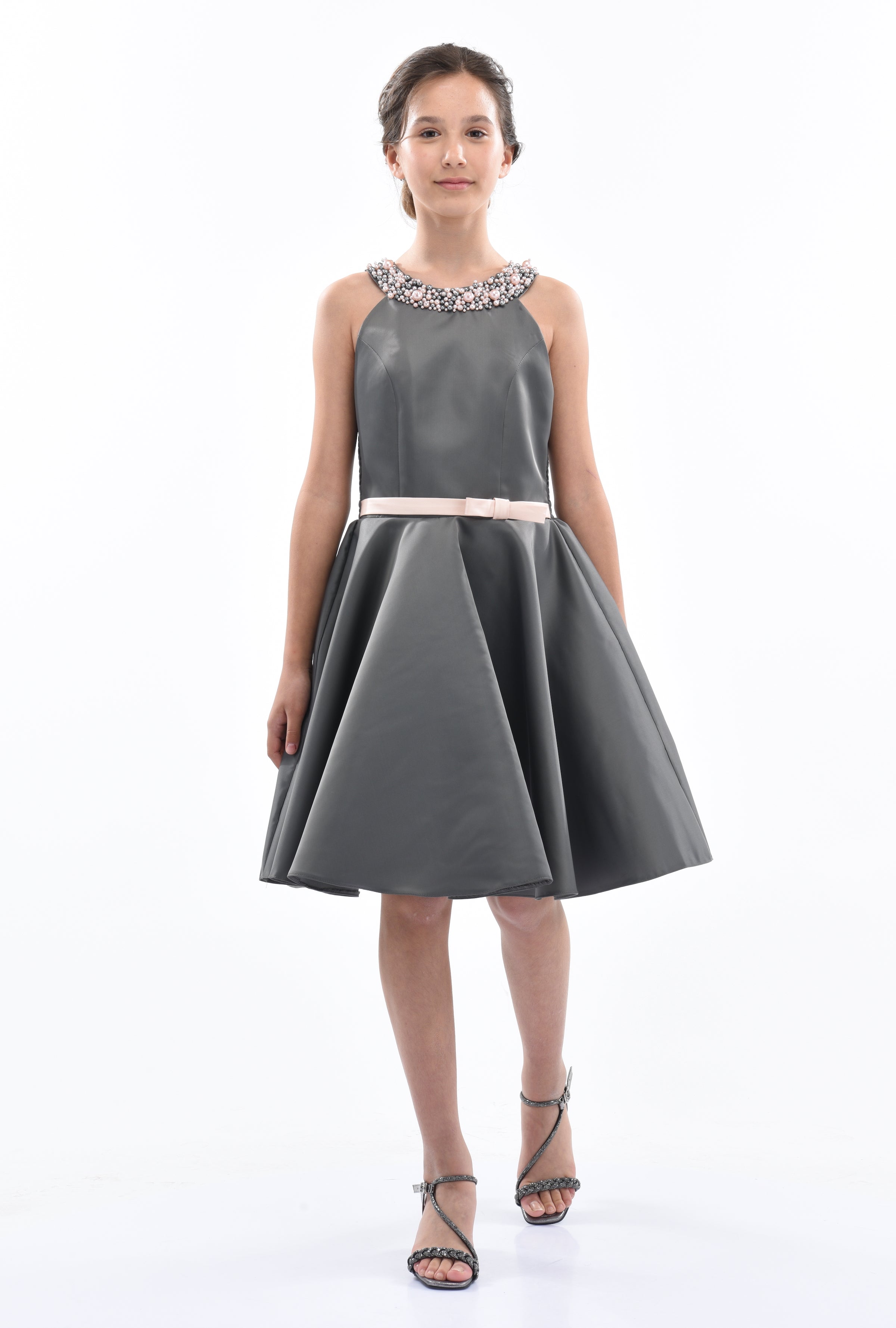 The Gray Cardona Pearl Halter Dress for junior girls from Tulleen is a stunning and elegant choice for any special occasion. This dress features a wonderful halter cut with a pearl-embellished design on the neck, adding a touch of sophistication and sparkle. Firstly, the sleeveless design ensures comfort and ease of movement.