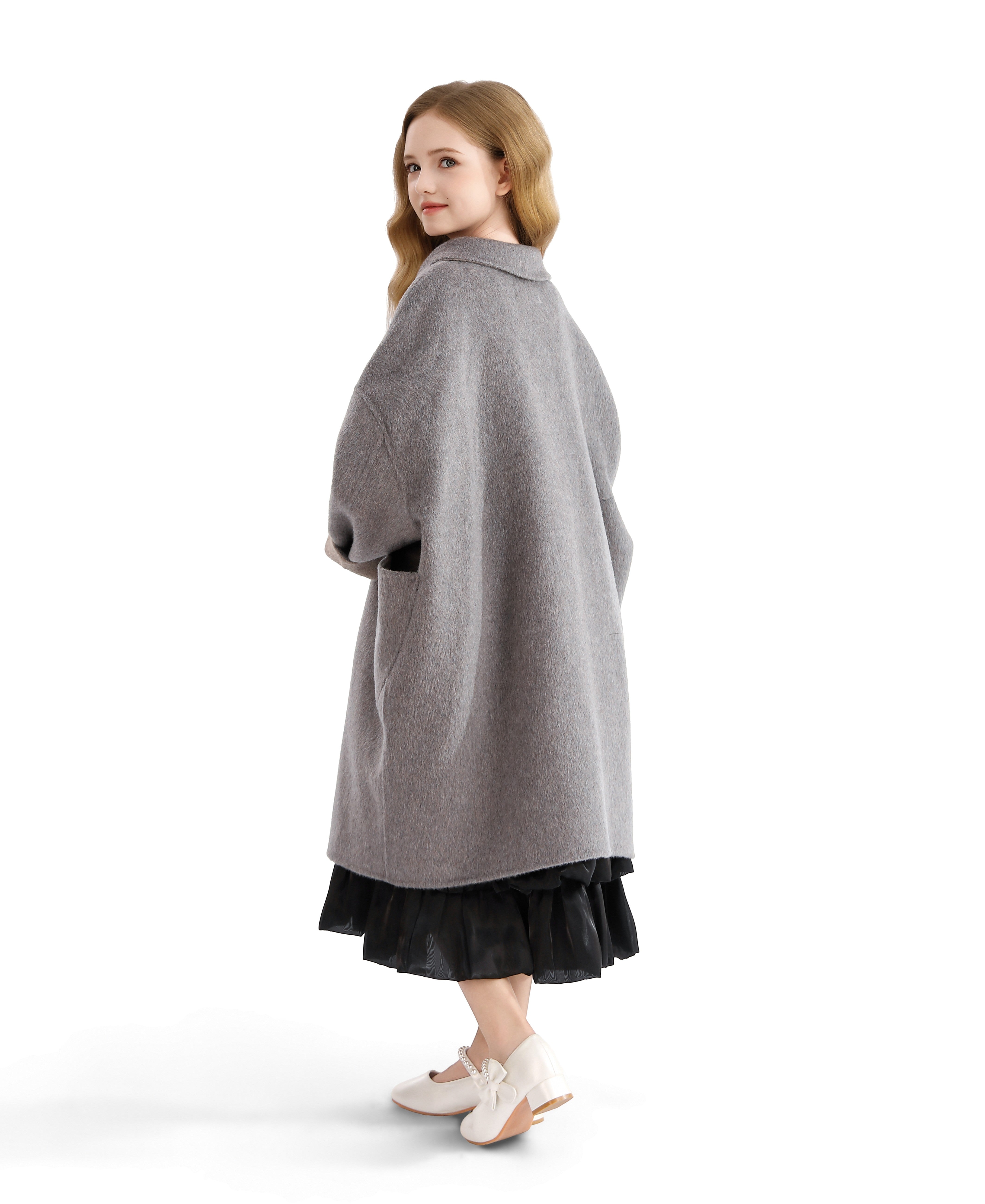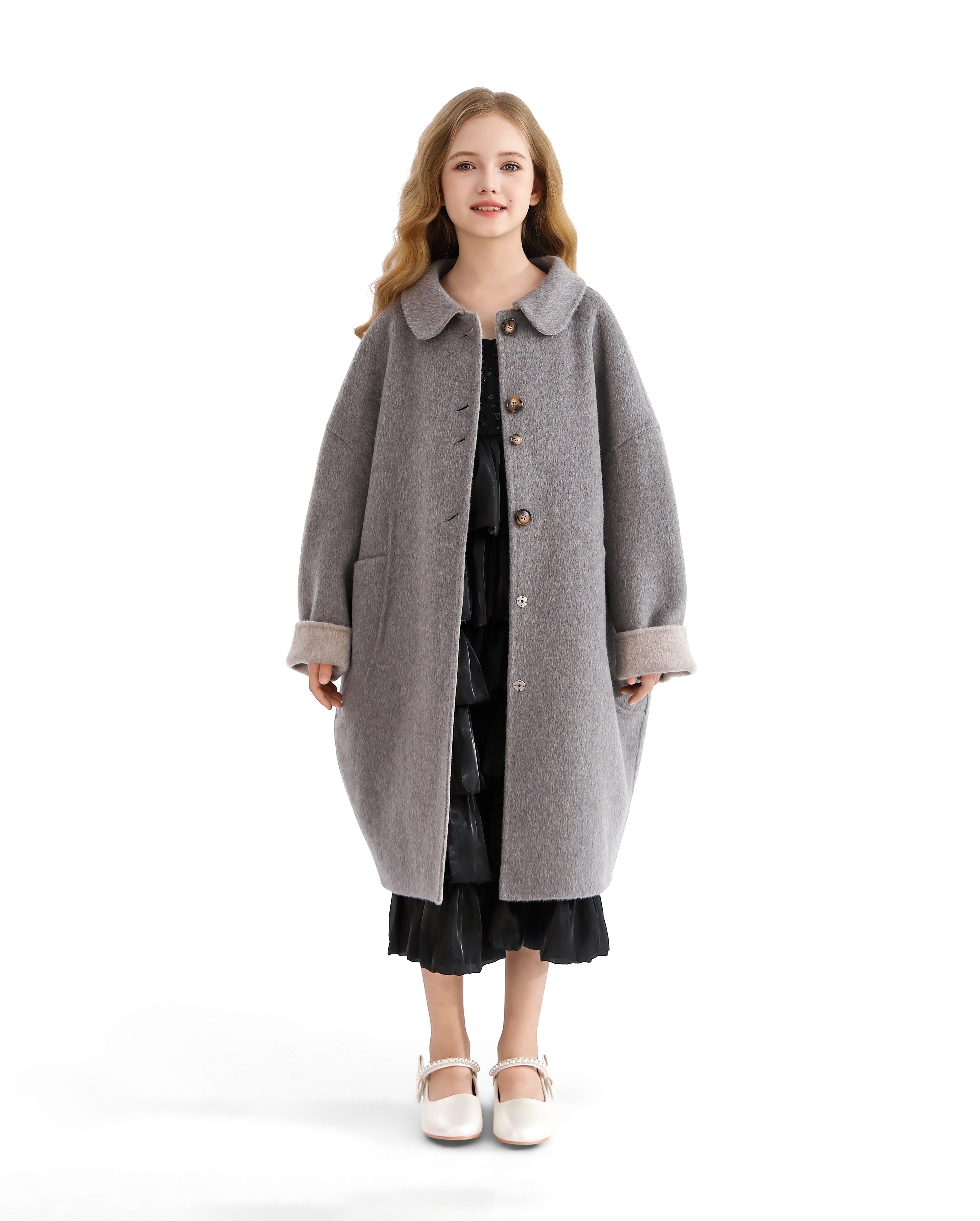 A timeless layer for cooler days, this gray wool coat blends classic charm with cozy comfort. Its oversized silhouette and soft texture make it a standout for stylish strolls and seasonal outings.