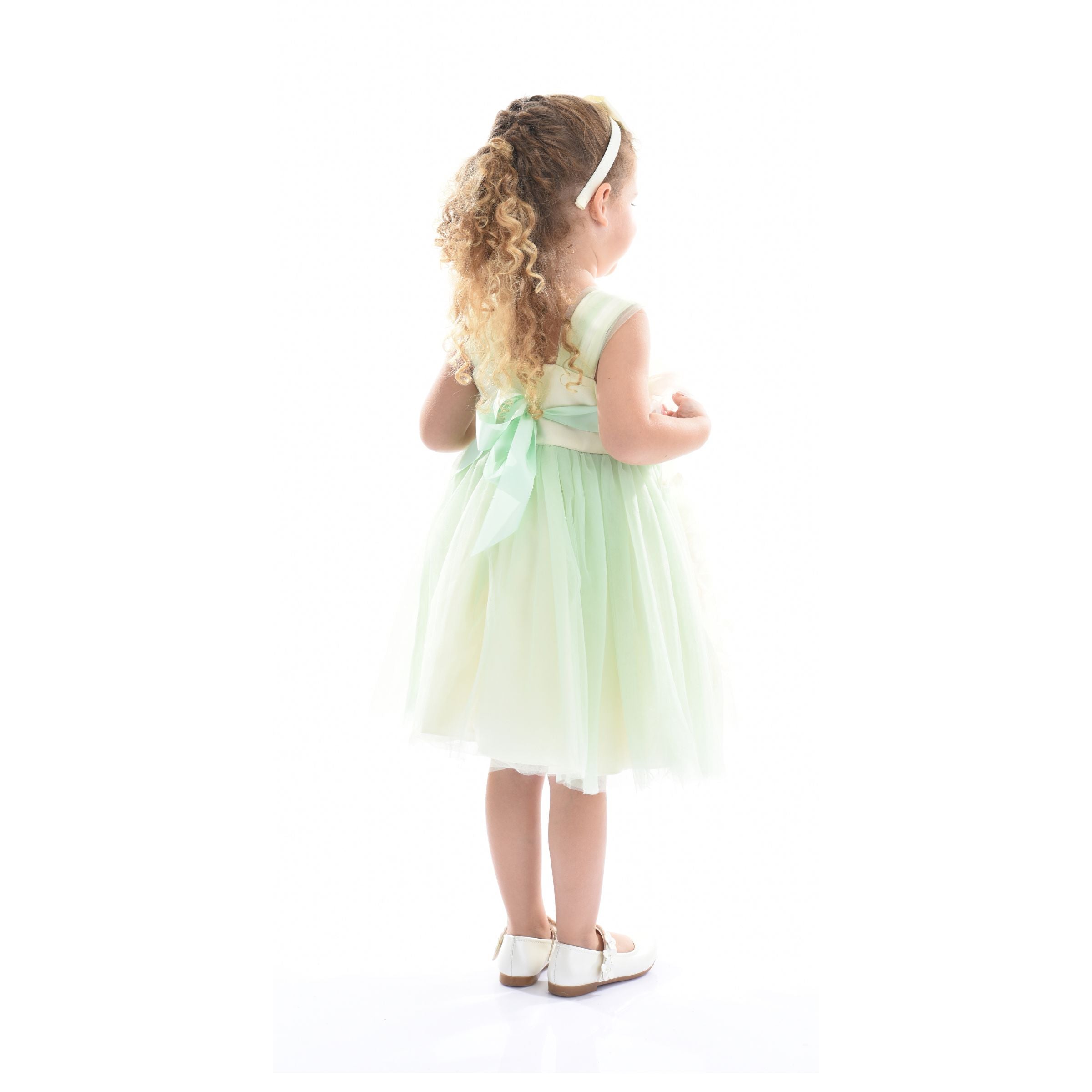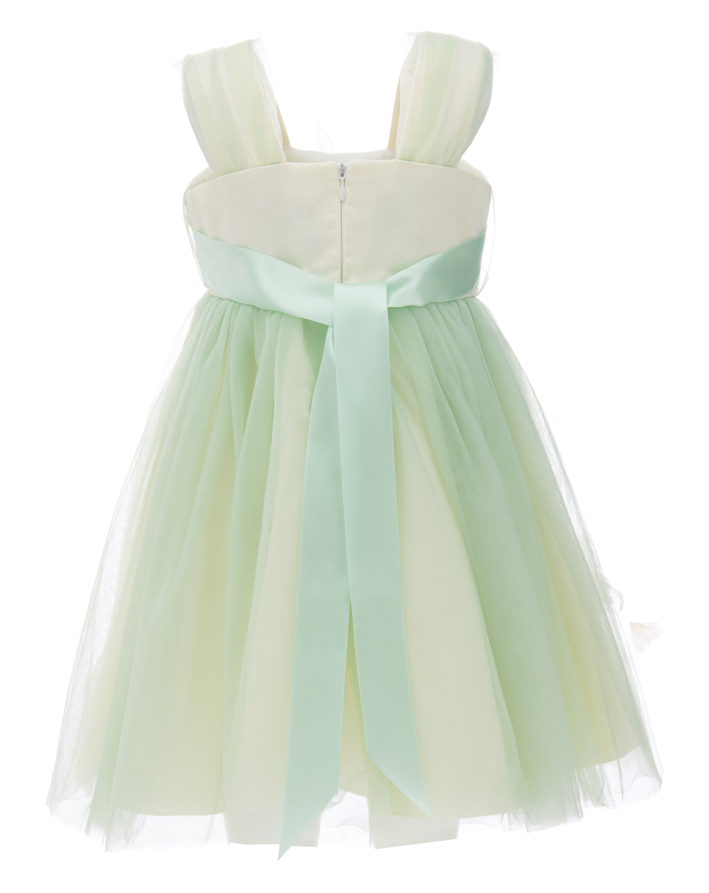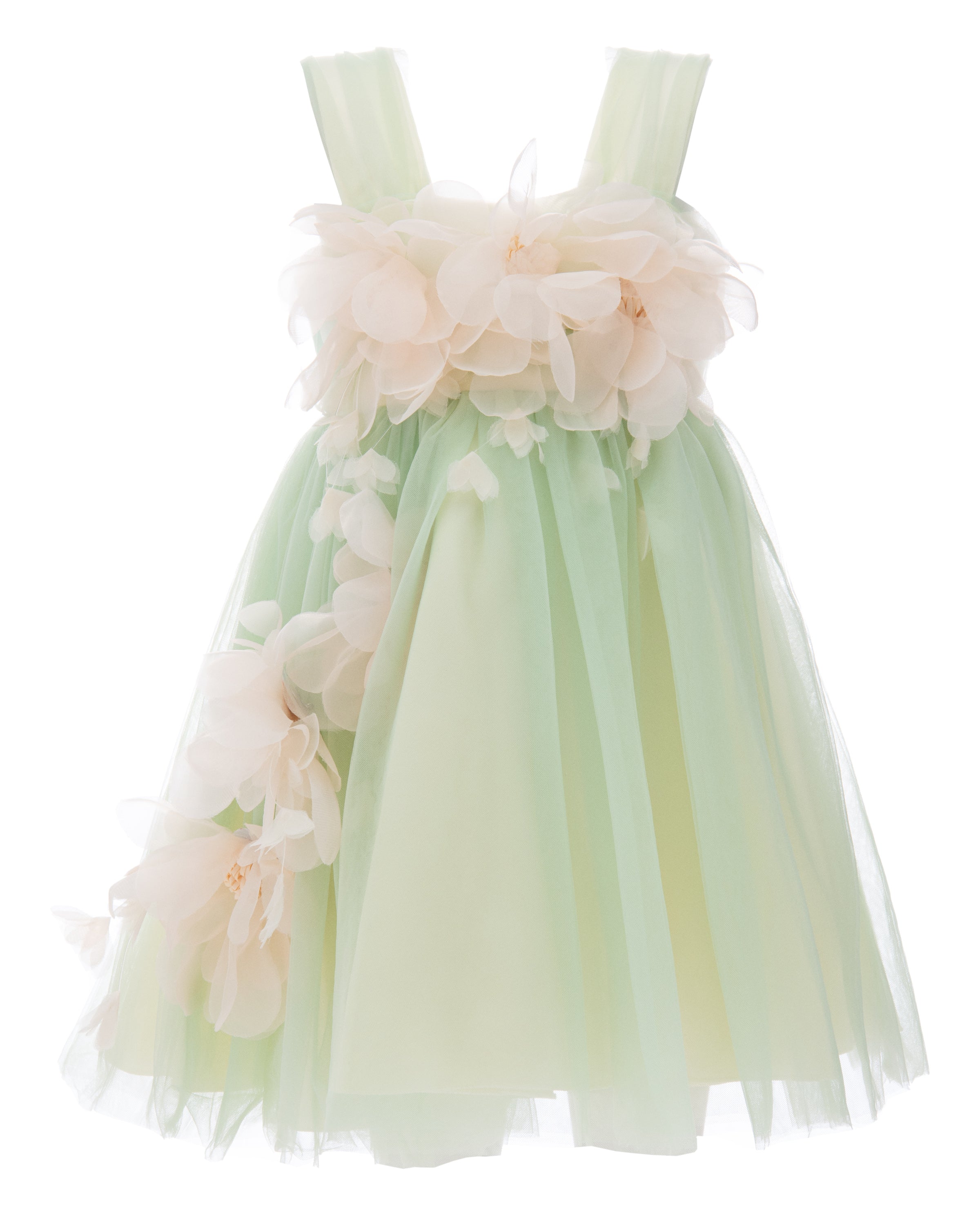 Additionally, the voluminous tulle skirt in hues of green and white enhances the dress's playful and graceful appearance. Made from a blend of 65% polyester and 35% viscose, this dress ensures both durability and comfort. The zip closure at the back allows for easy dressing and a secure fit. Designed to be dry cleaned only, this dress maintains its quality and luxurious appearance over time.