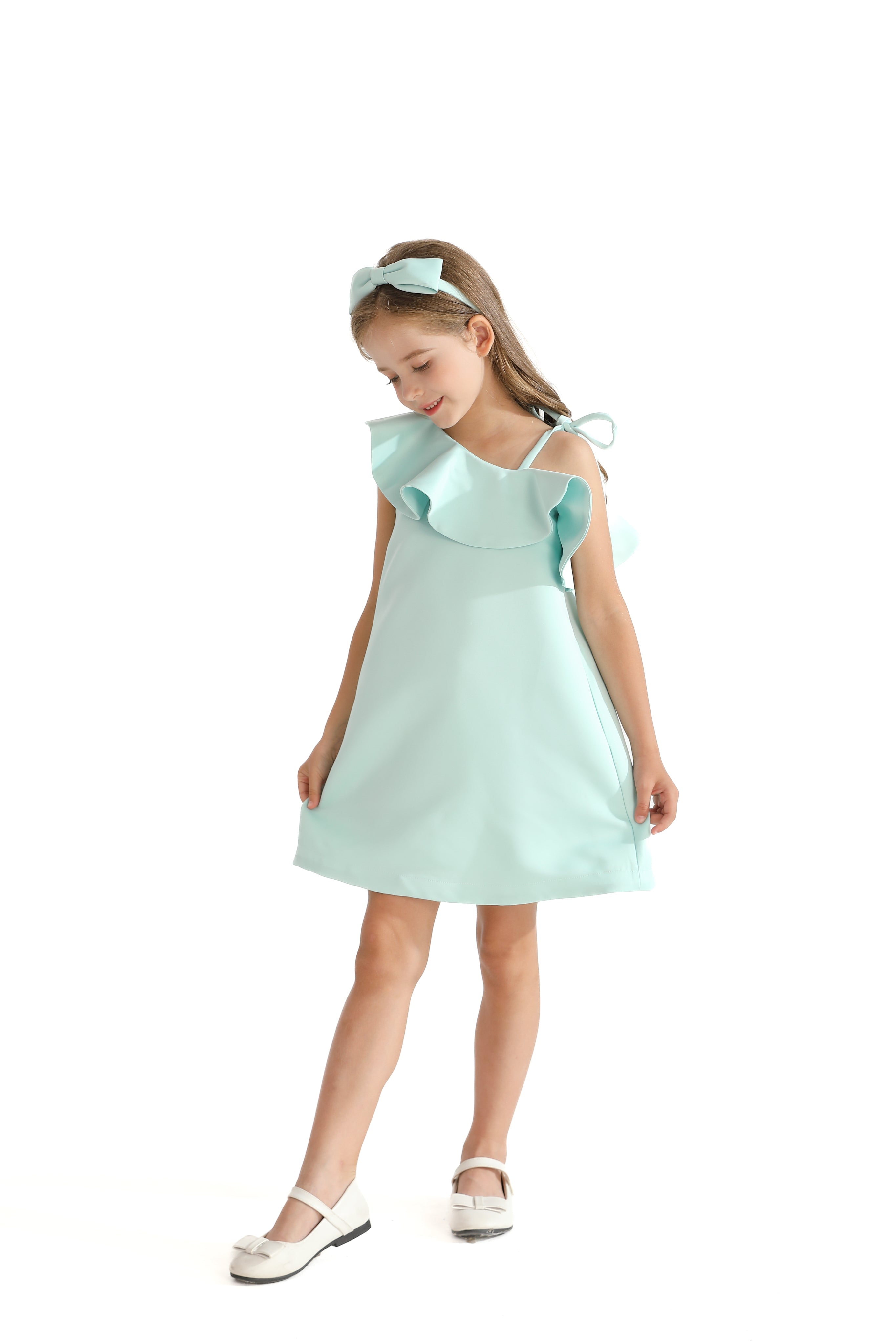 Additionally, the tied closure at the shoulder enhances the dress's delicate appearance. Made from 100% polyester with a 100% cotton lining, this dress ensures both durability and comfort. Furthermore, the lightweight fabric allows for ease of movement, making it perfect for twirling and dancing.