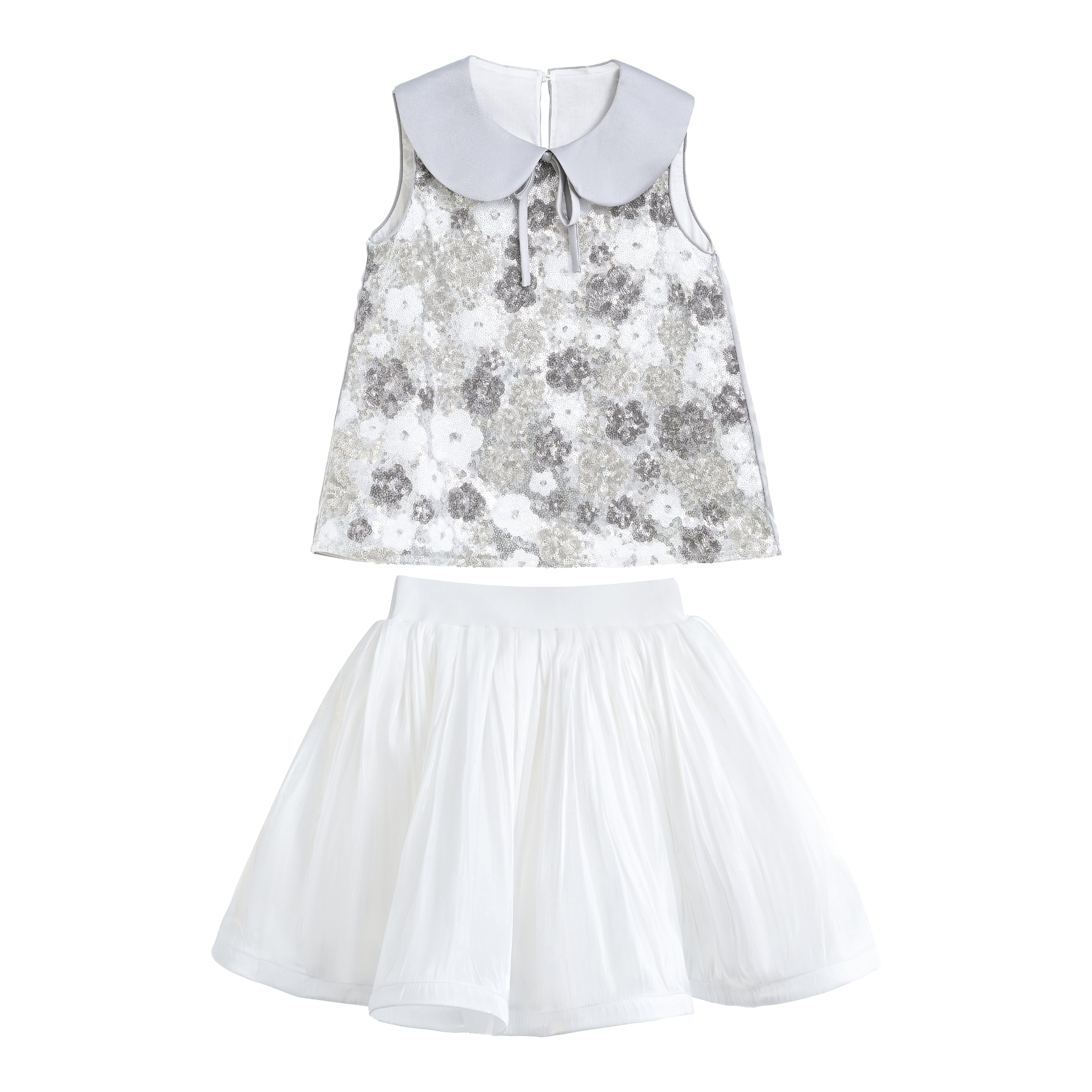 - Includes sleeveless top and matching skirt