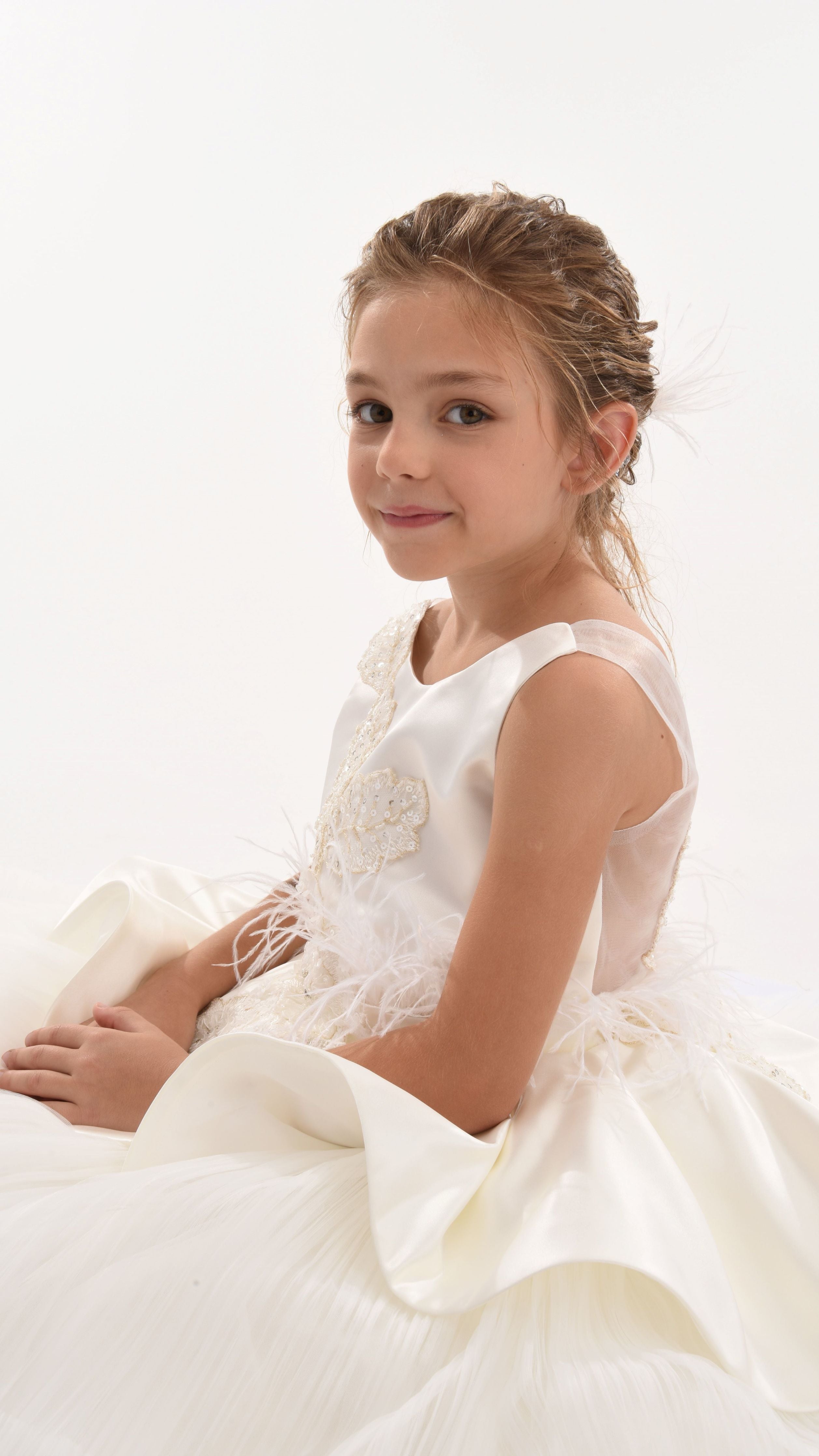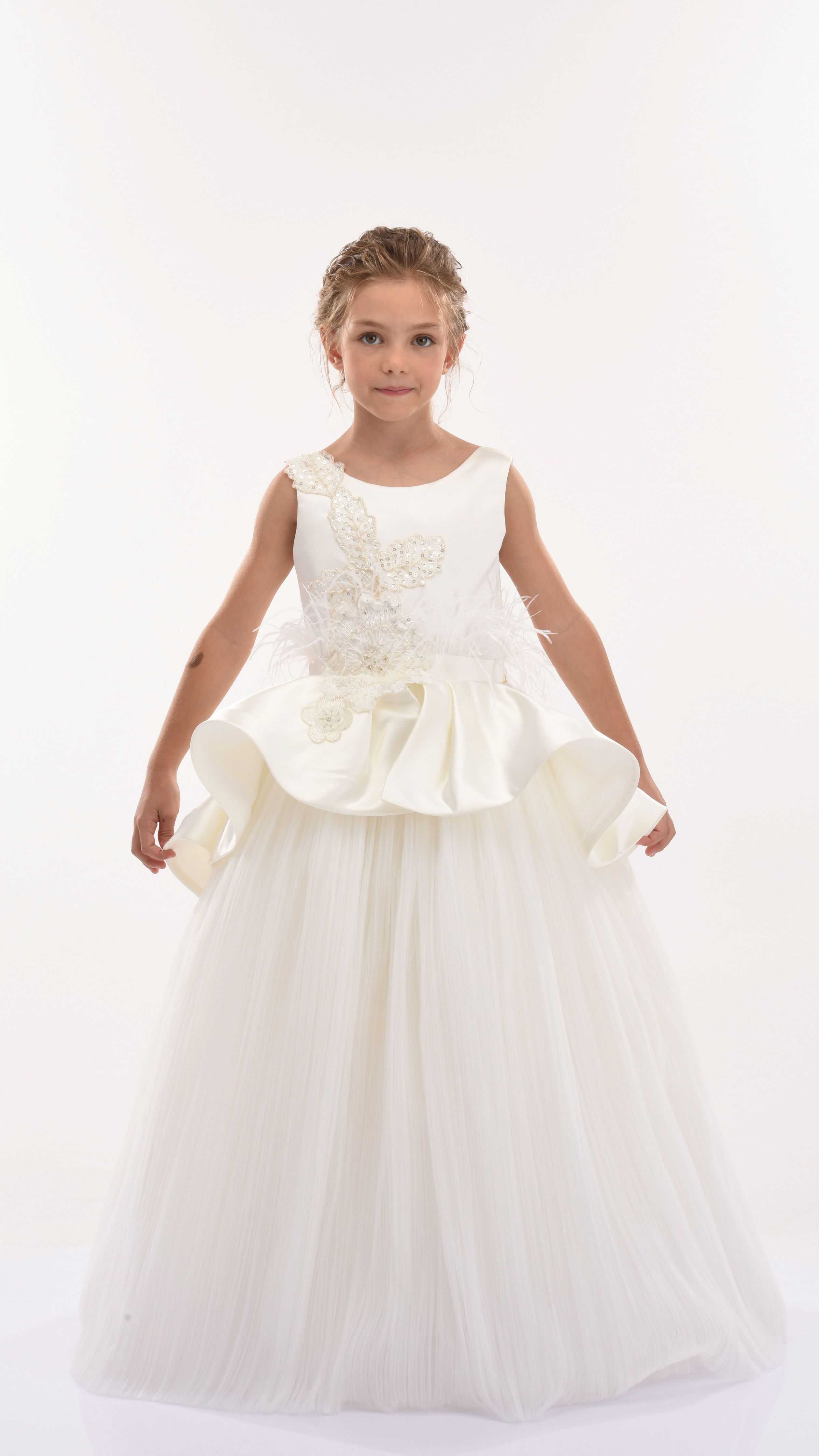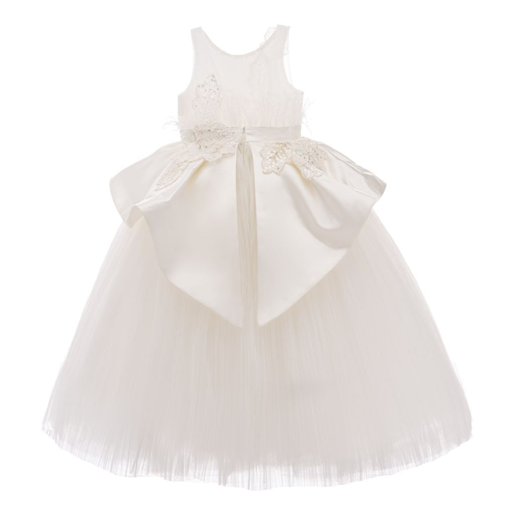 The Ivory Belridge Floral Cascade Dress for kid girls from Tulleen is a breathtaking piece perfect for special occasions. This gown features a sleeveless bodice adorned with a beaded floral design, adding a touch of elegance and sophistication. The floral design cascades into a soft satin-like overlay, creating a seamless and enchanting look.