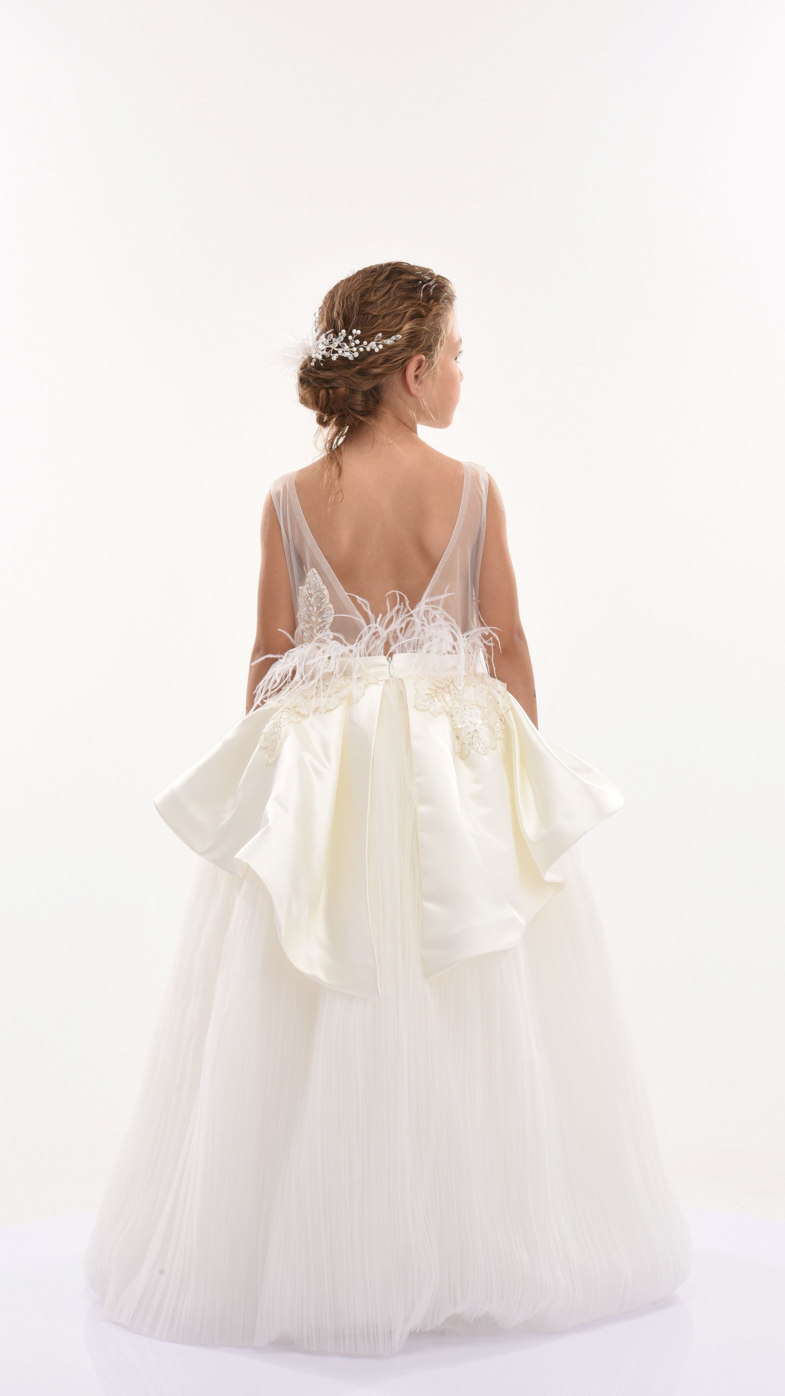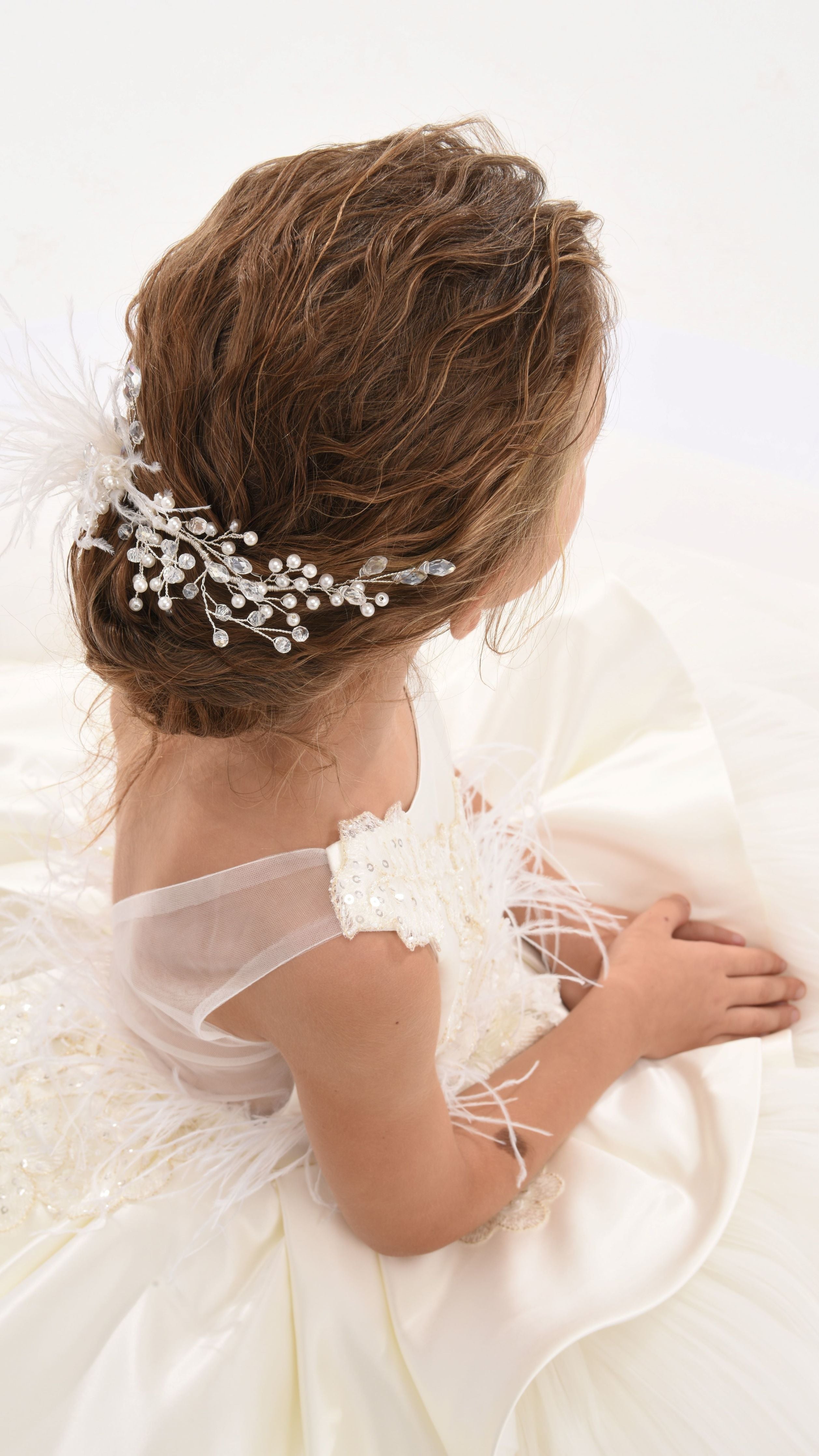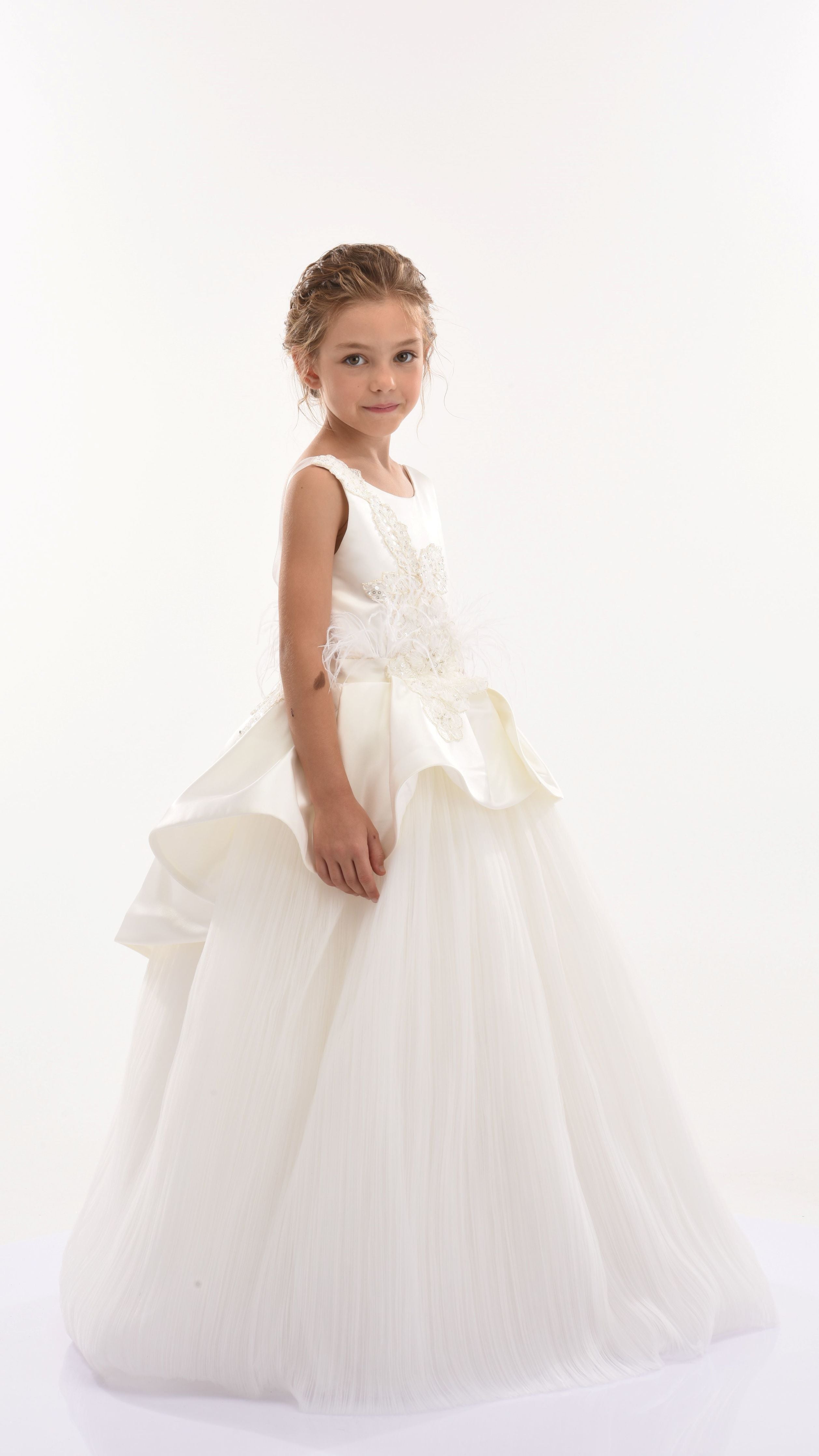 The Ivory Belridge Floral Cascade Dress for kid girls from Tulleen is a breathtaking piece perfect for special occasions. This gown features a sleeveless bodice adorned with a beaded floral design, adding a touch of elegance and sophistication. The floral design cascades into a soft satin-like overlay, creating a seamless and enchanting look.