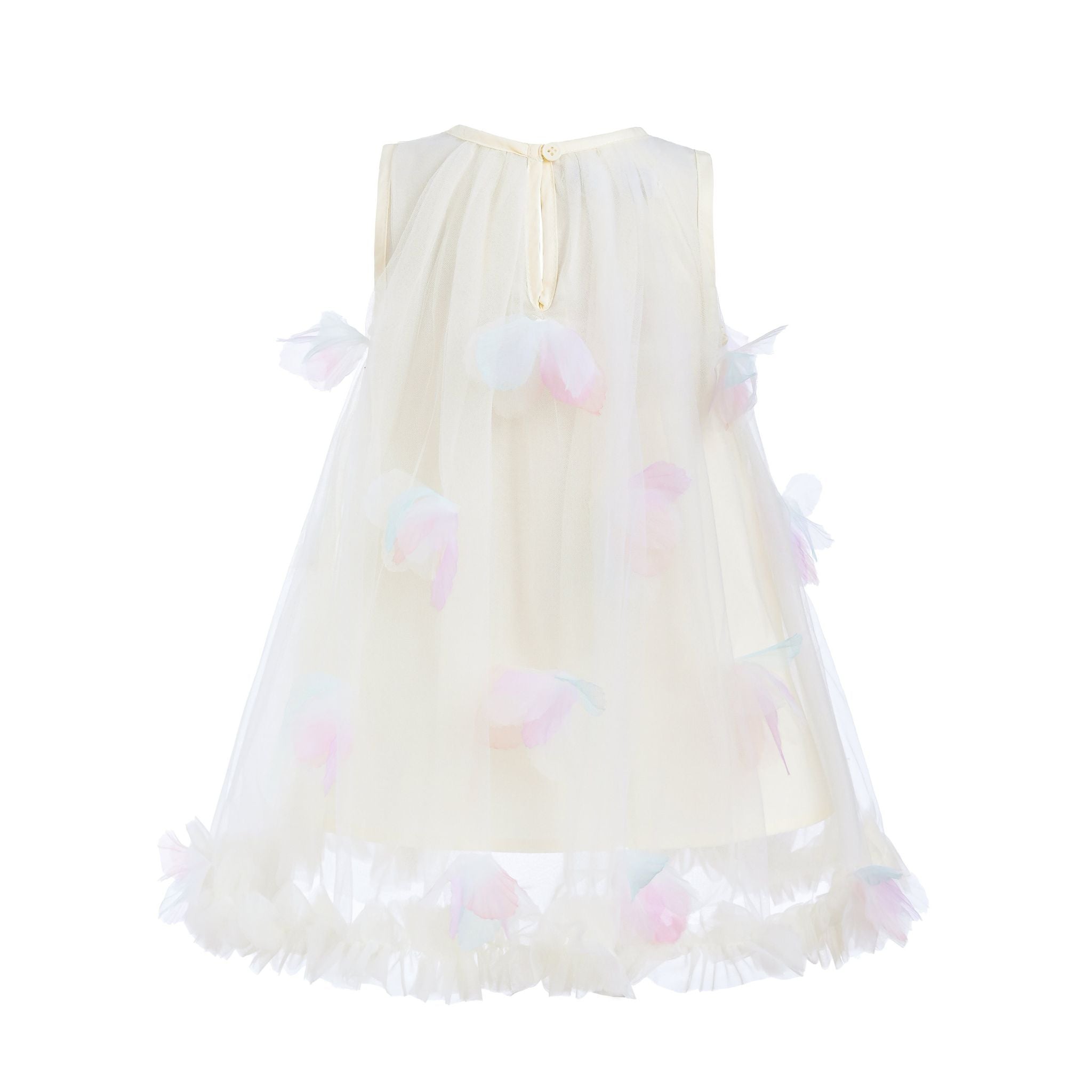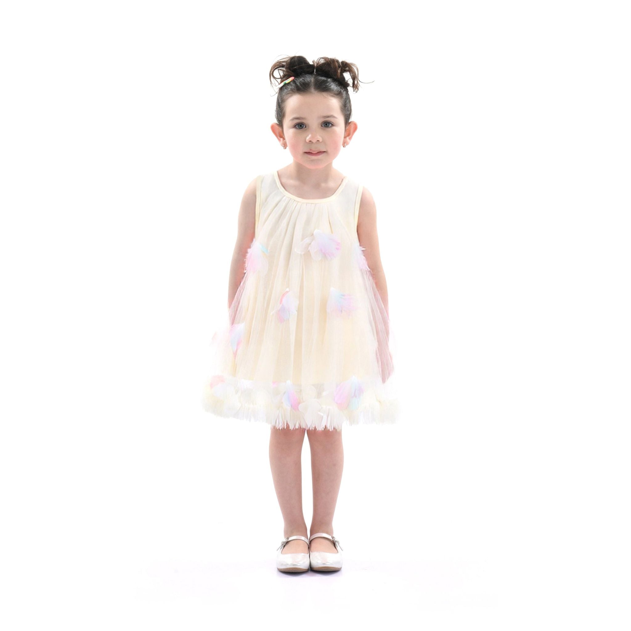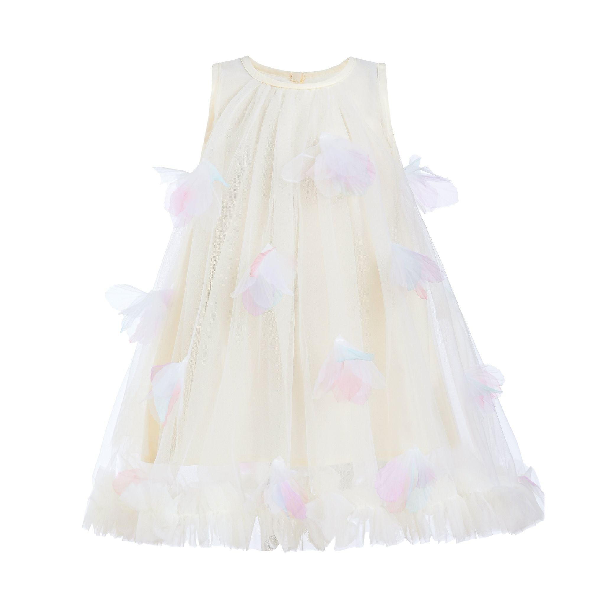 The Ivory Blooming Tulle Sleeveless Dress radiates delicate elegance with its soft ivory tone and layers of airy tulle. The floral accents at the hem bring a touch of whimsy, creating a graceful yet playful look.