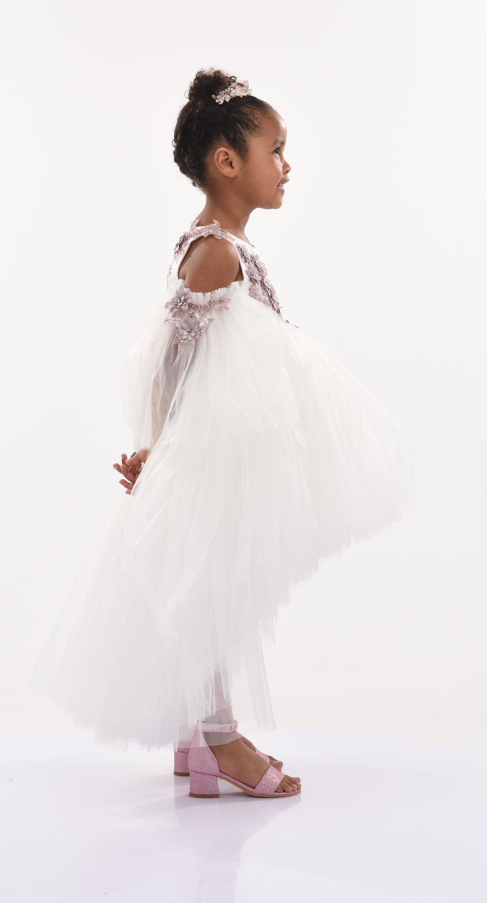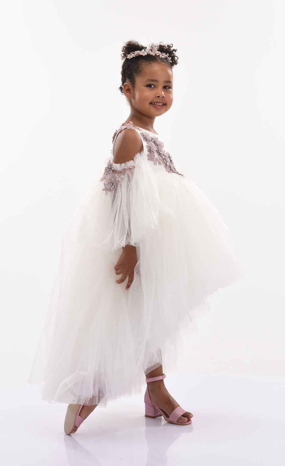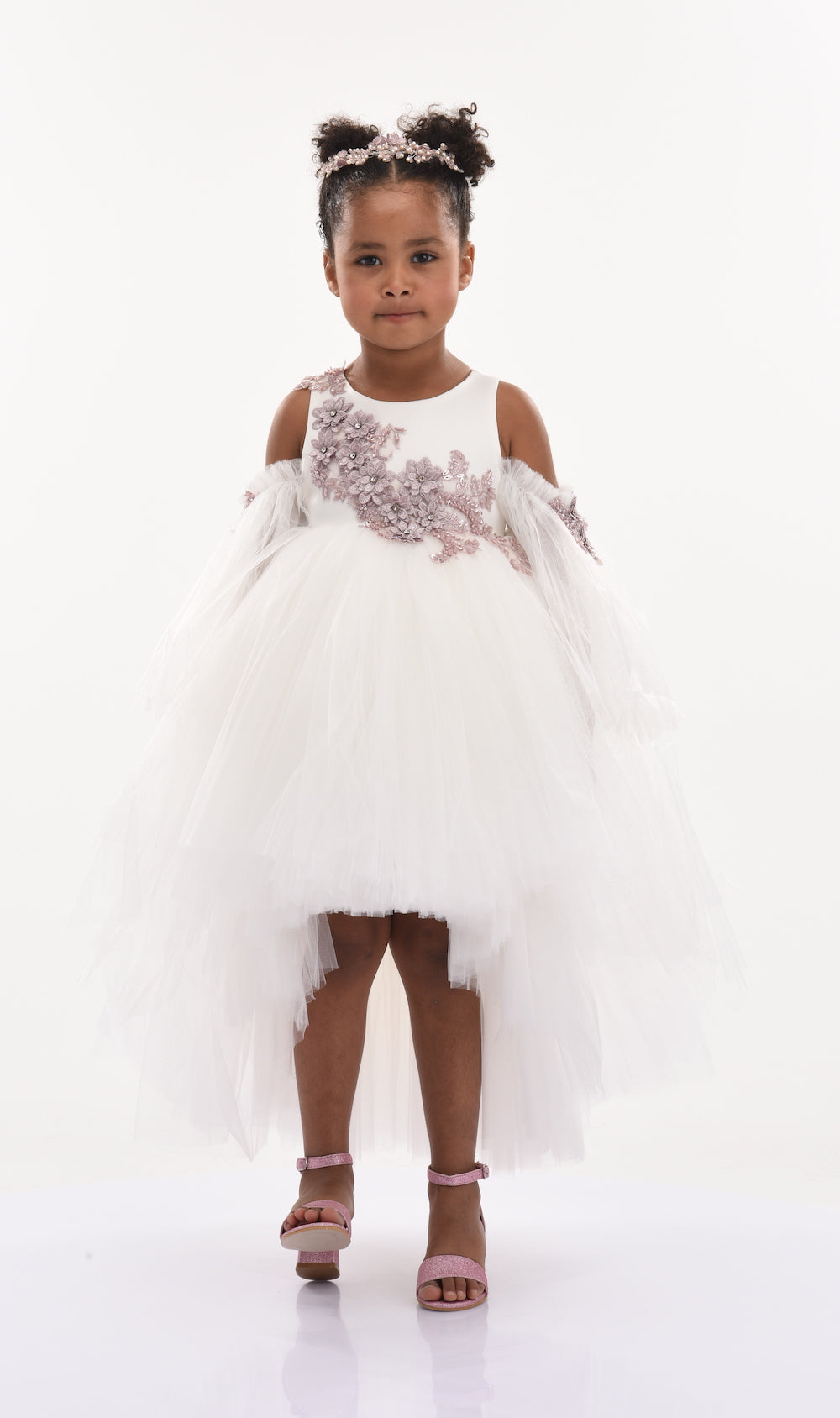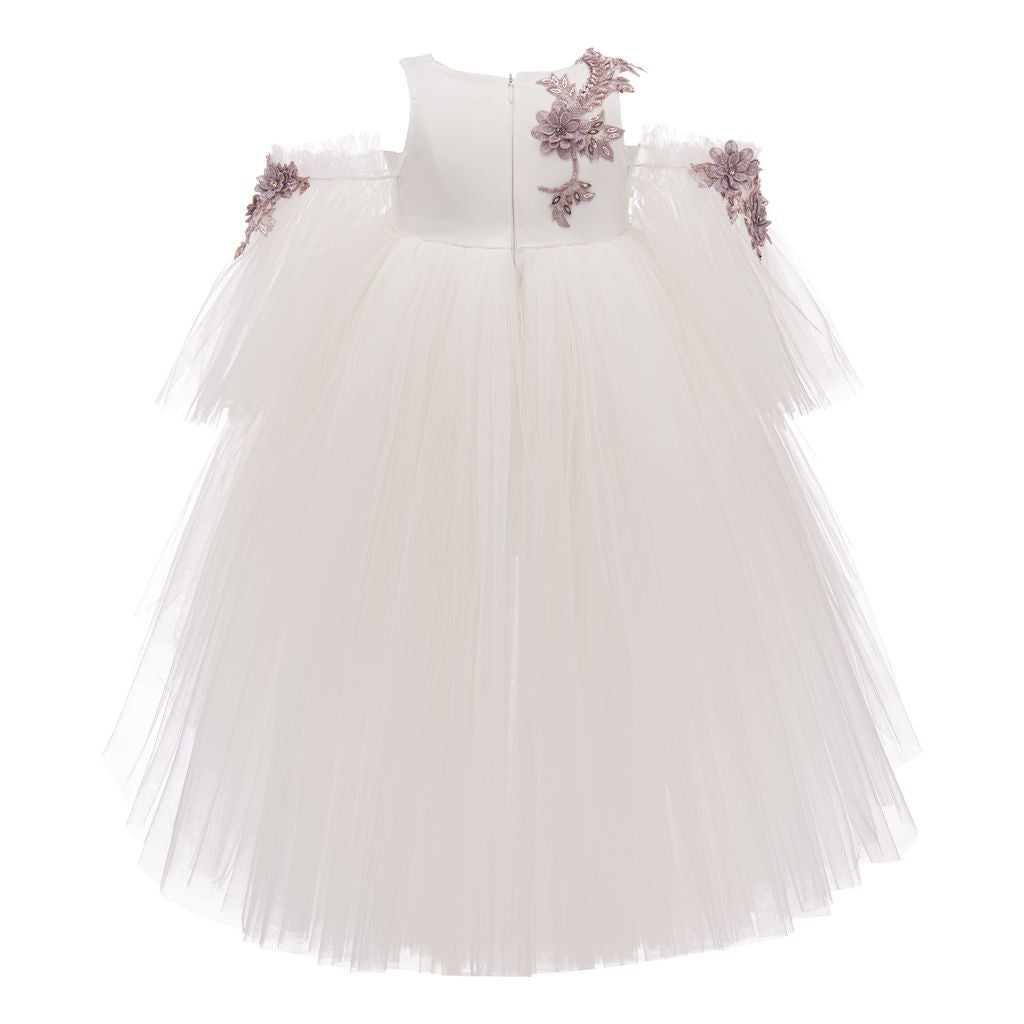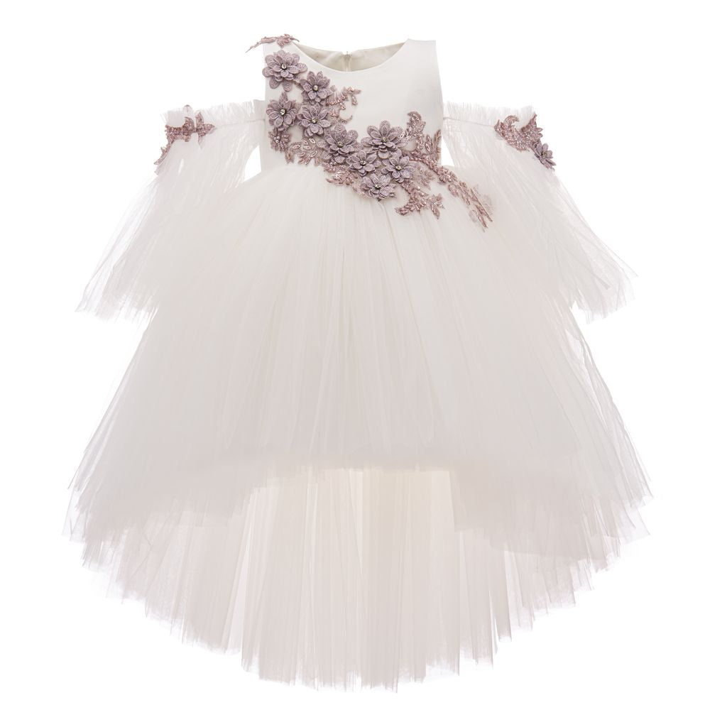 The Ivory Cerro Vista Floral Embroidered Semi Sleeve Dress for kid girls from Tulleen is a beautiful and sophisticated piece perfect for special occasions. This dress features a sleeveless bodice adorned with delicate purple floral embroidery, adding a touch of elegance and charm. The semi-cut sleeves also showcase small purple floral embroidery, complementing the bodice and creating a cohesive look.