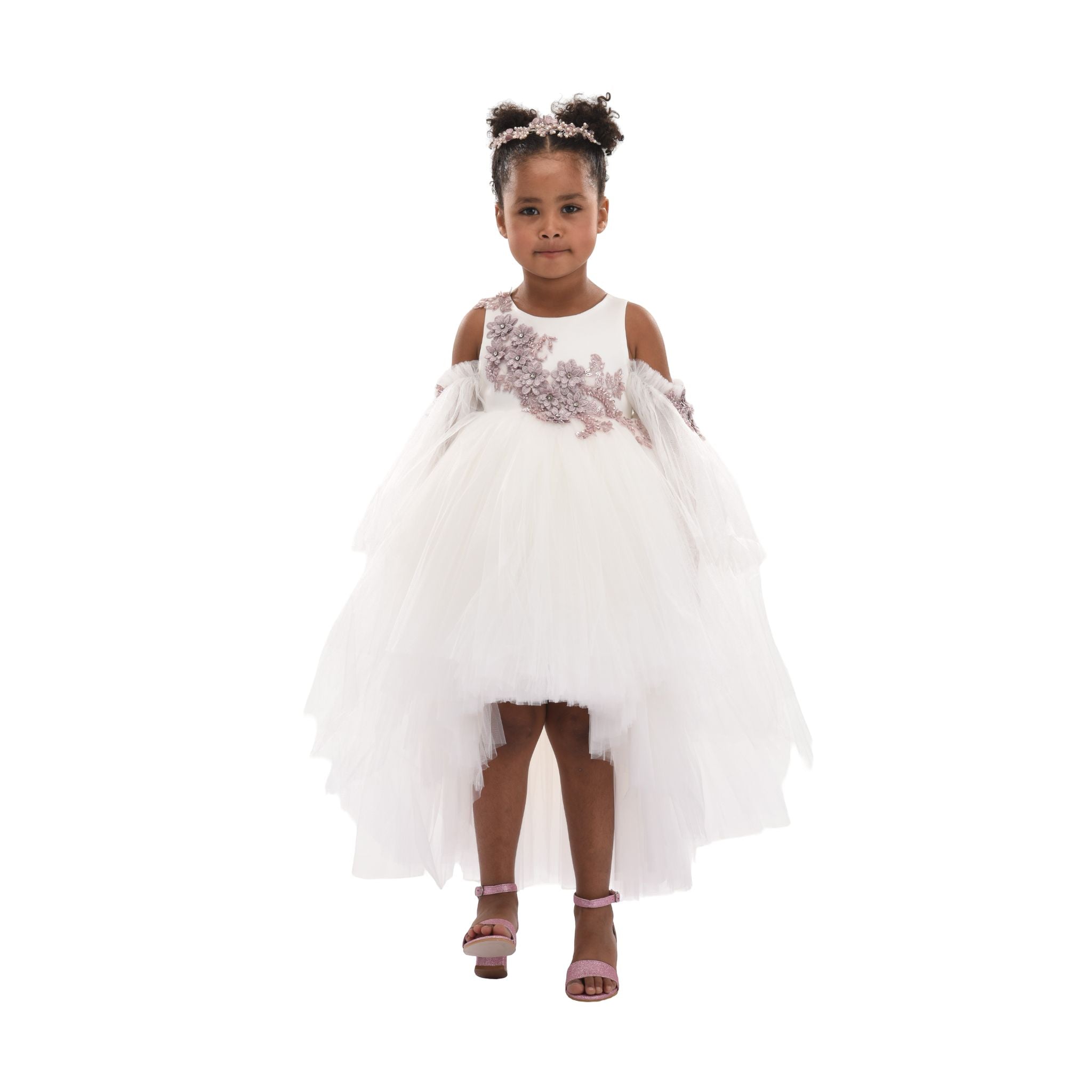 The Ivory Cerro Vista Floral Embroidered Semi Sleeve Dress for kid girls from Tulleen is a beautiful and sophisticated piece perfect for special occasions. This dress features a sleeveless bodice adorned with delicate purple floral embroidery, adding a touch of elegance and charm. The semi-cut sleeves also showcase small purple floral embroidery, complementing the bodice and creating a cohesive look.