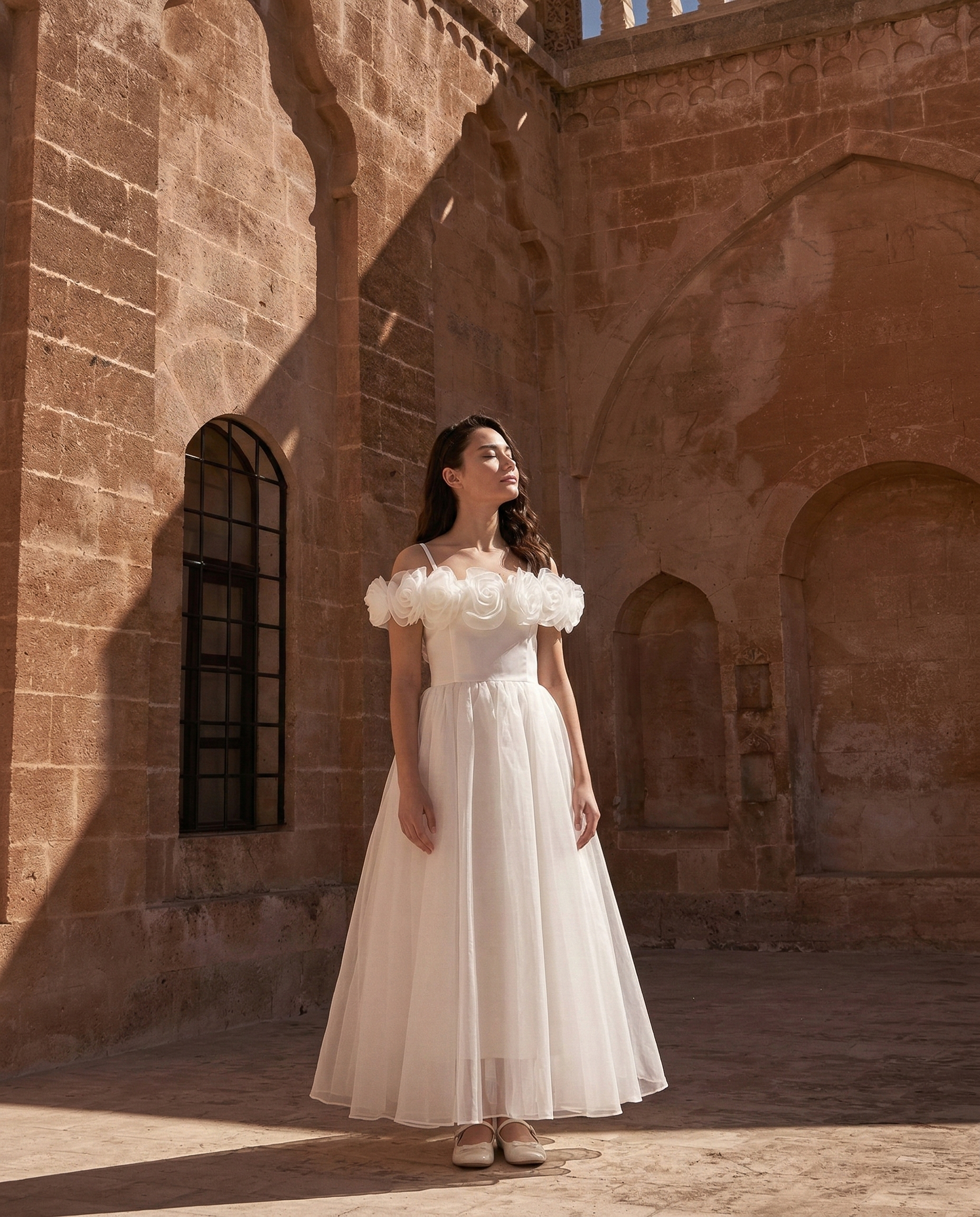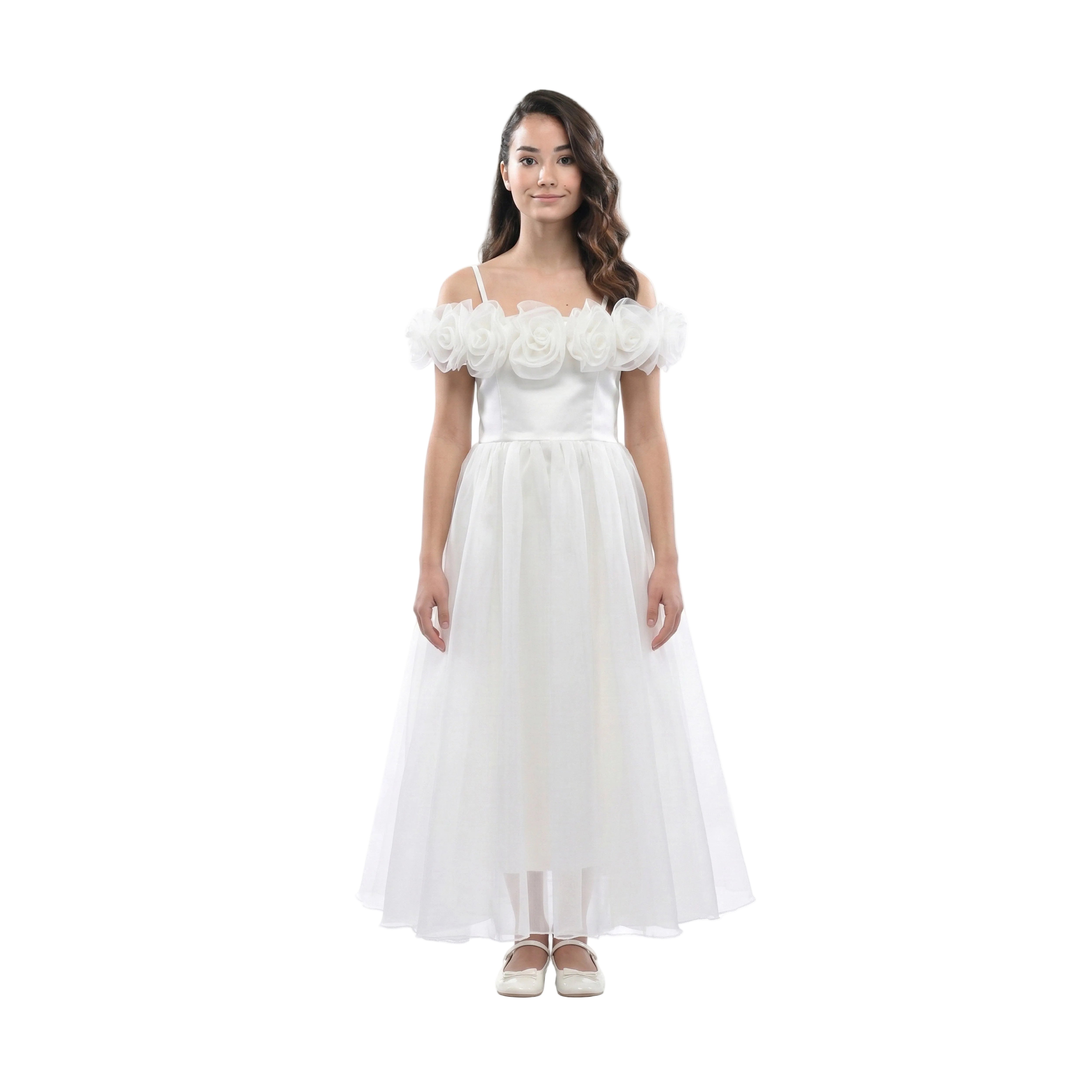 A dreamy silhouette for special occasions, this white dress enchants with its sculptural floral neckline and airy tulle skirt. Designed to make little ones feel like royalty, it’s perfect for weddings, birthdays, or any moment worth celebrating.