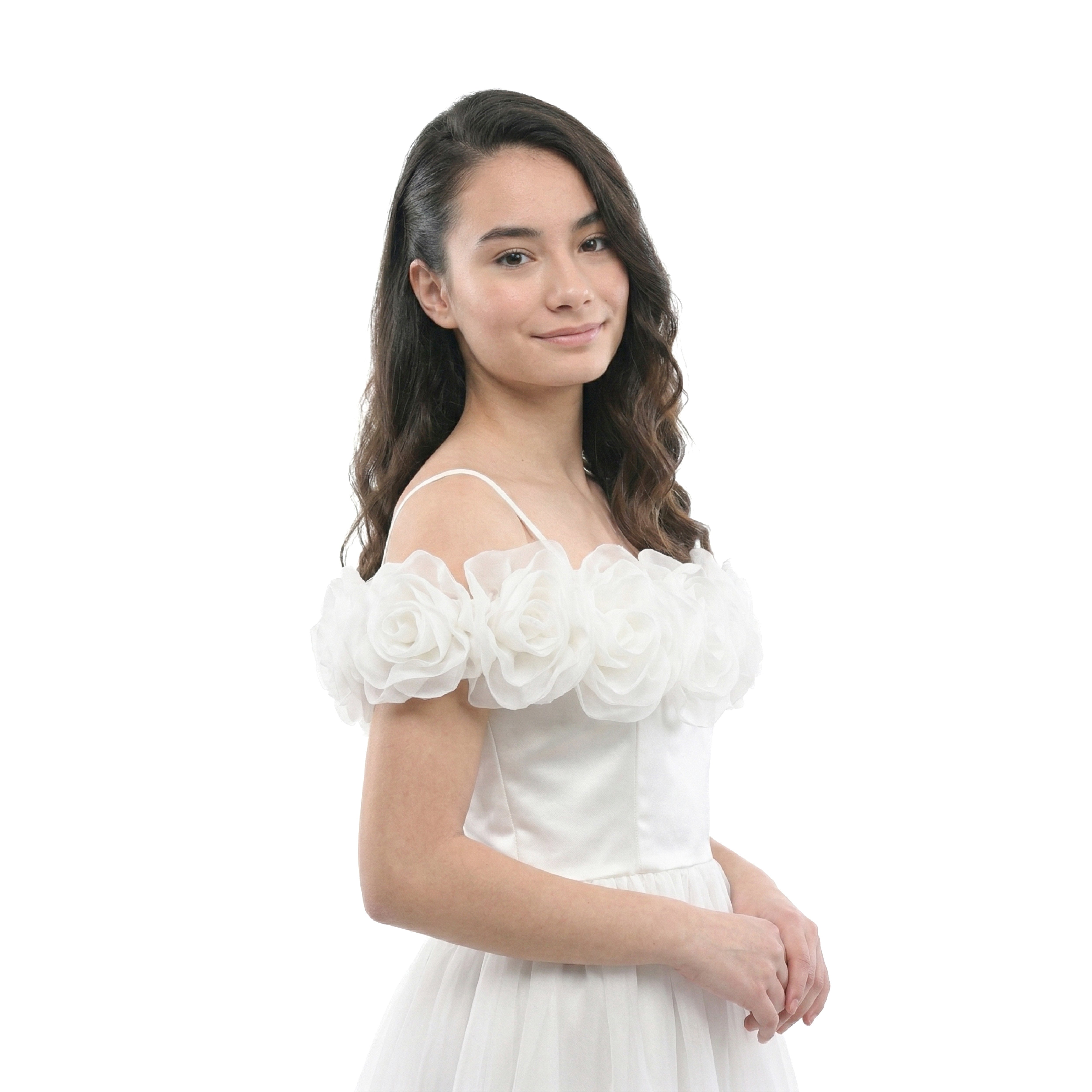 - 3D rose appliqués frame the neckline for a couture-inspired finish