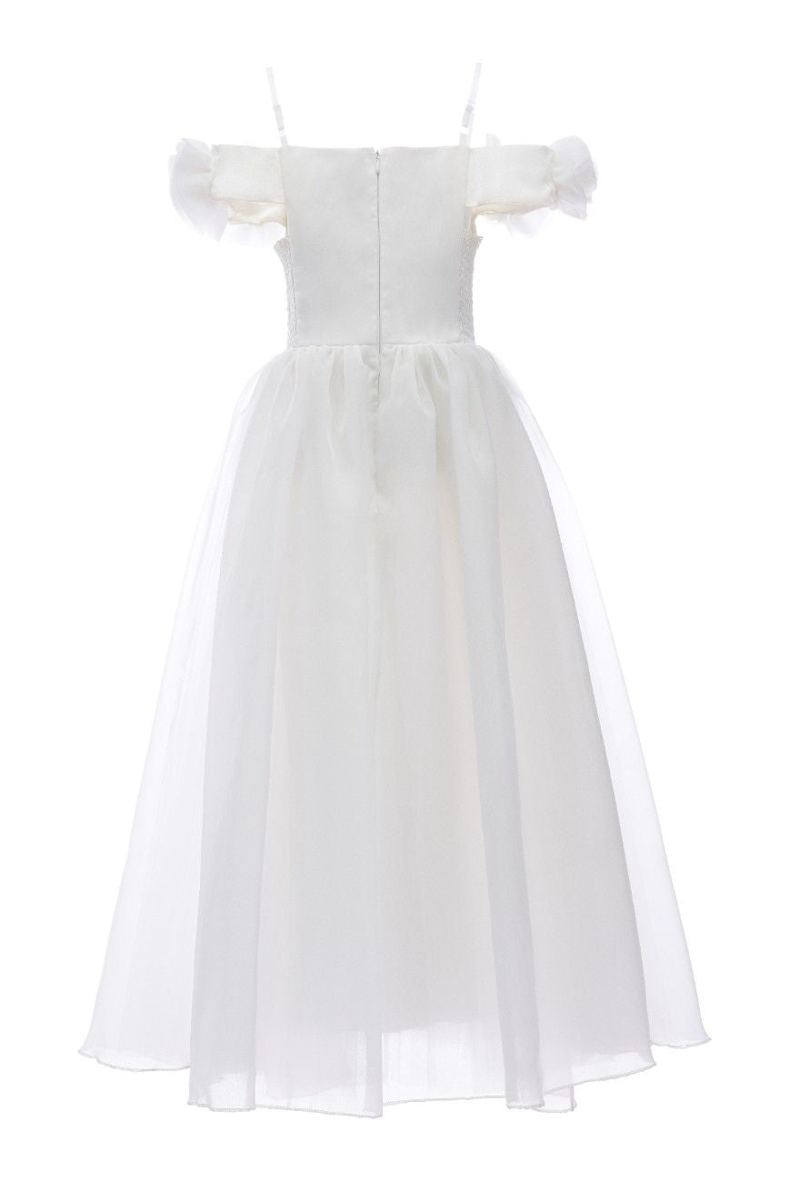A dreamy silhouette for special occasions, this white dress enchants with its sculptural floral neckline and airy tulle skirt. Designed to make little ones feel like royalty, it’s perfect for weddings, birthdays, or any moment worth celebrating.