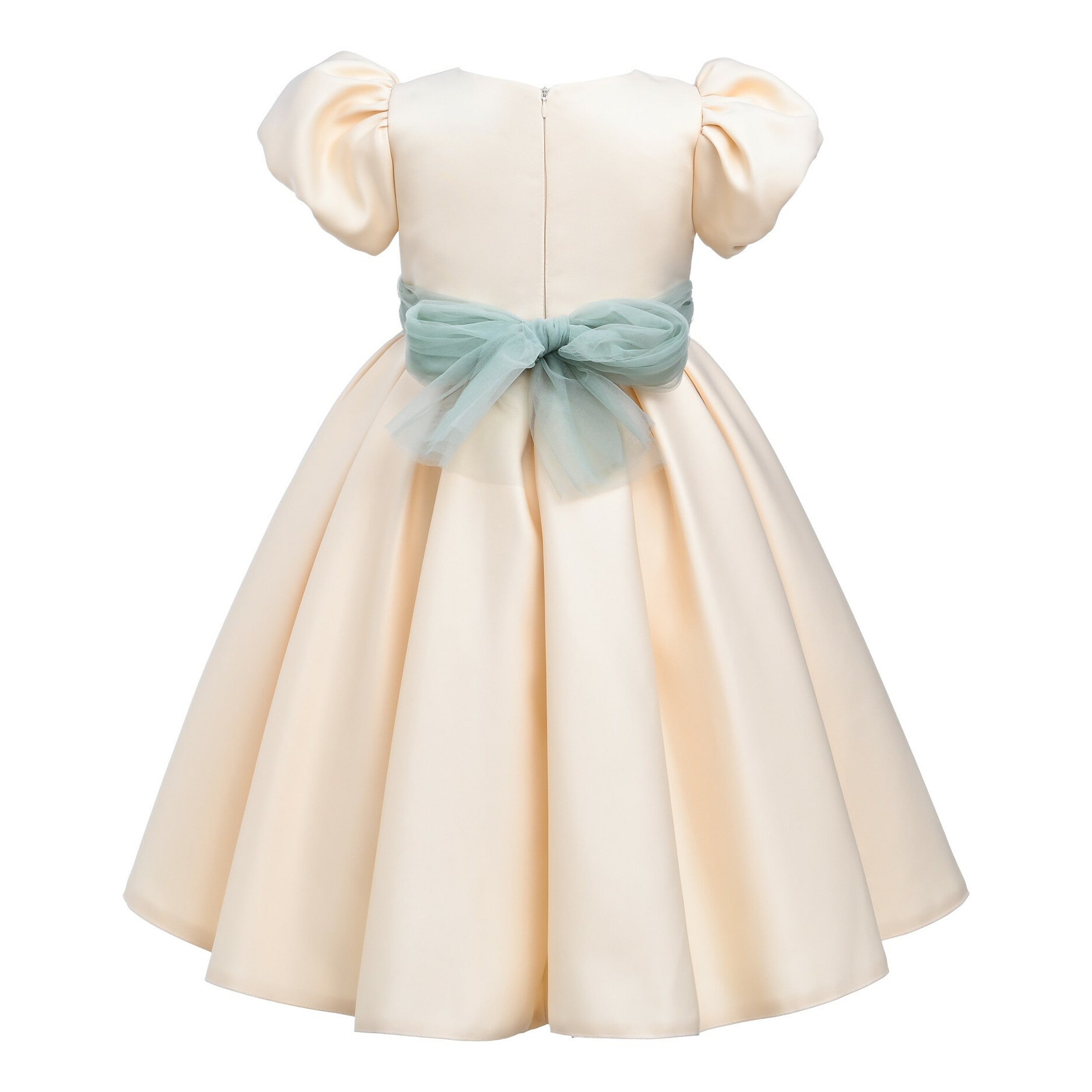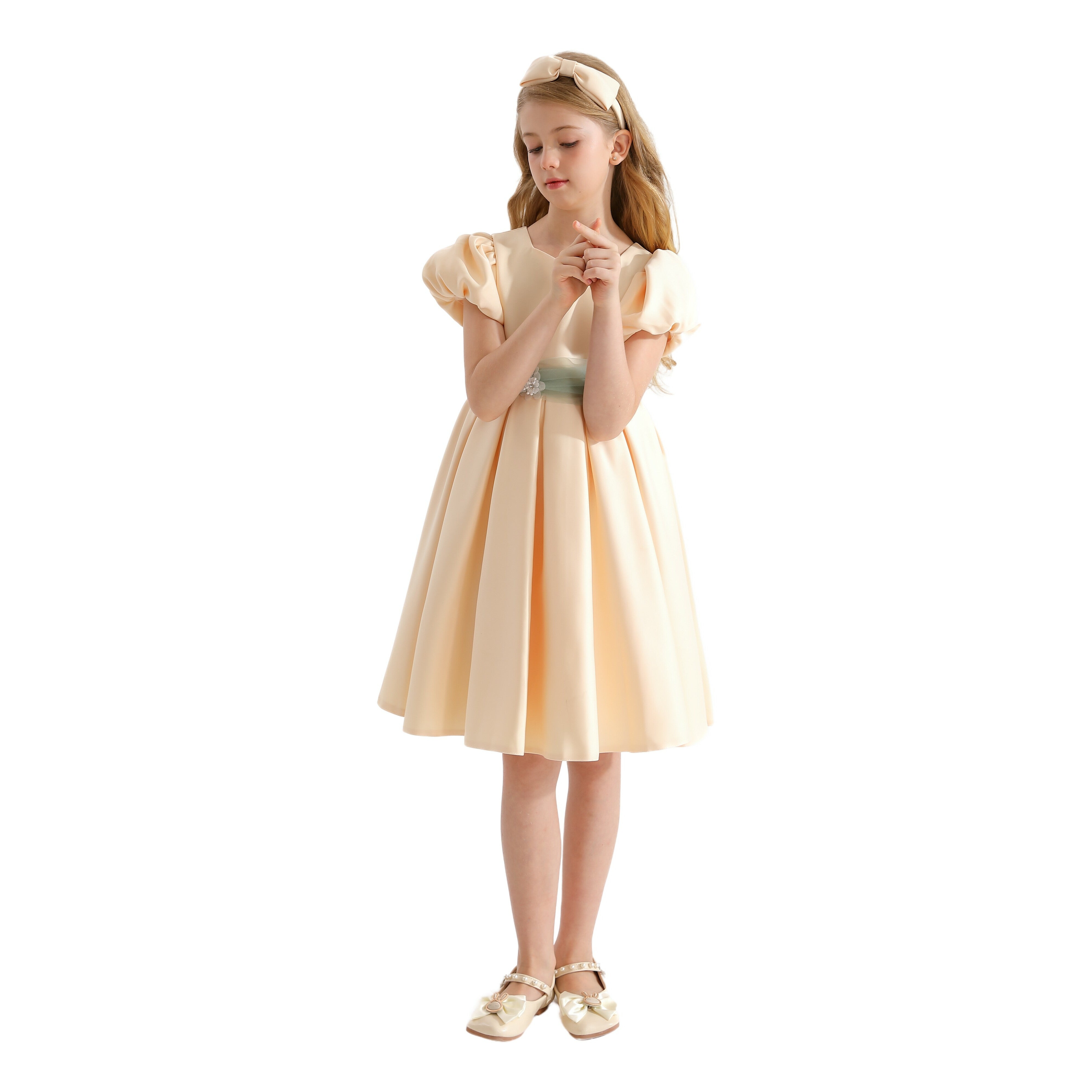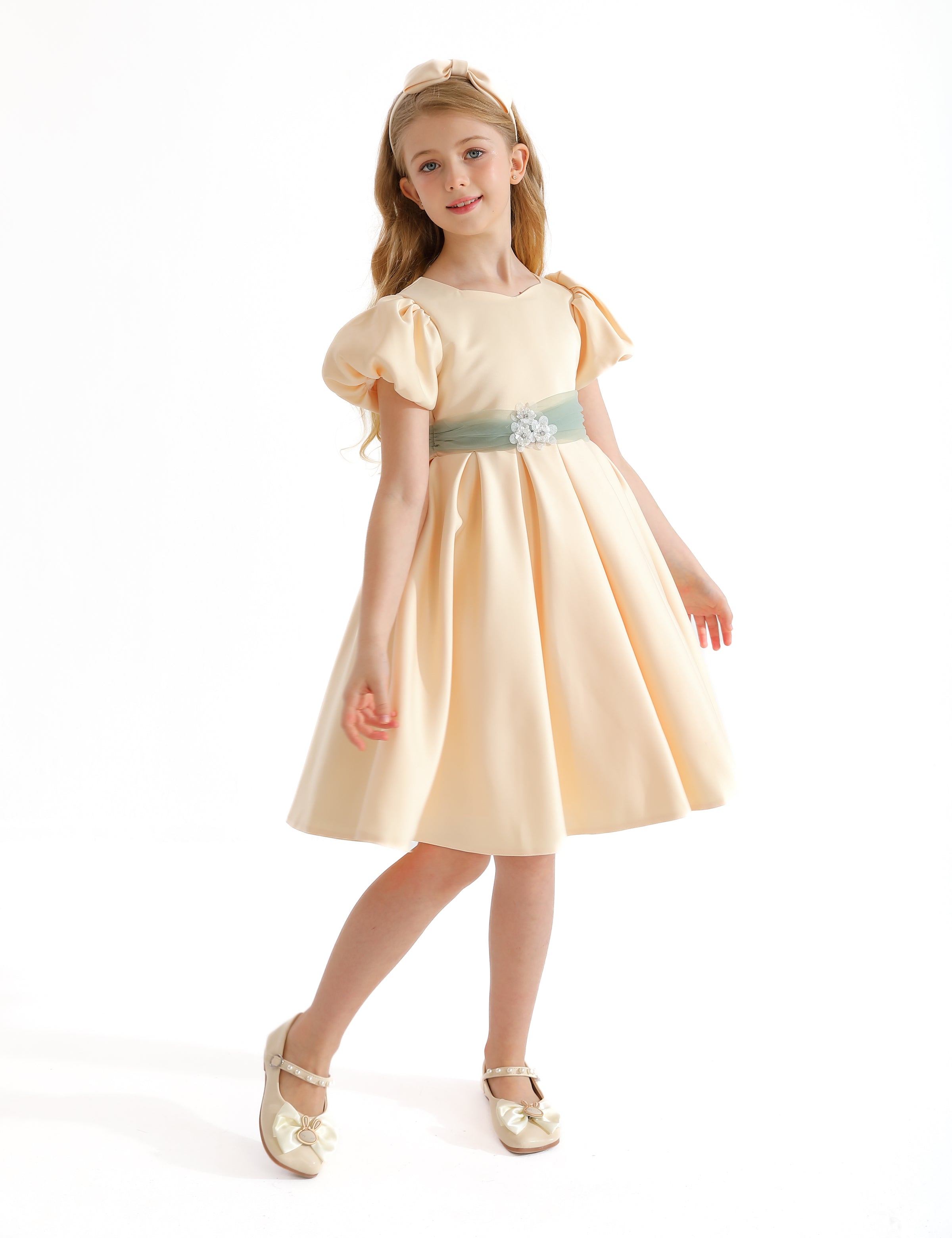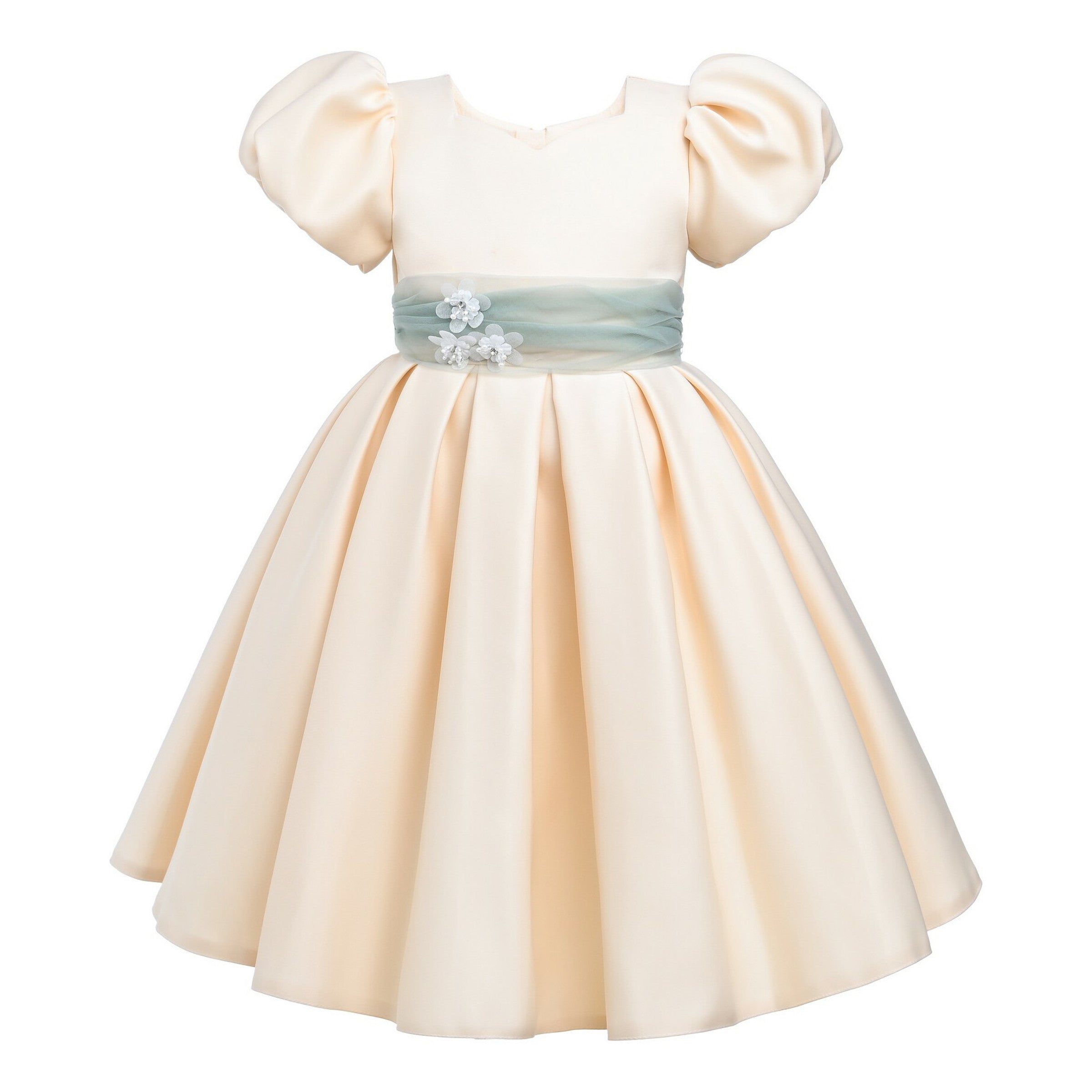 The Ivory Easton Teacup Belt Dress for kid girls from Tulleen is a beautifully designed piece that exudes elegance and charm, perfect for any special occasion. This dress features a sophisticated puff shoulder bodice, adding a touch of vintage-inspired flair.