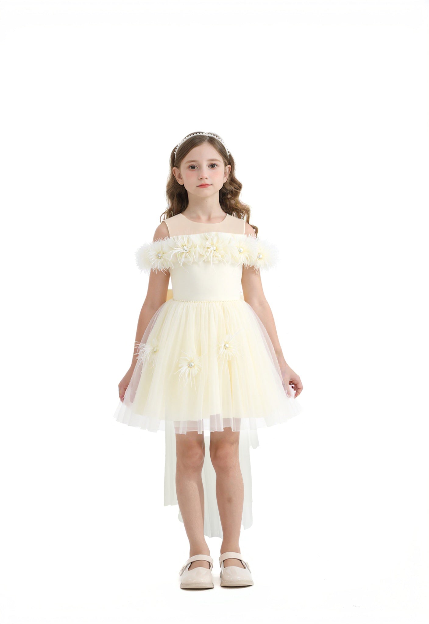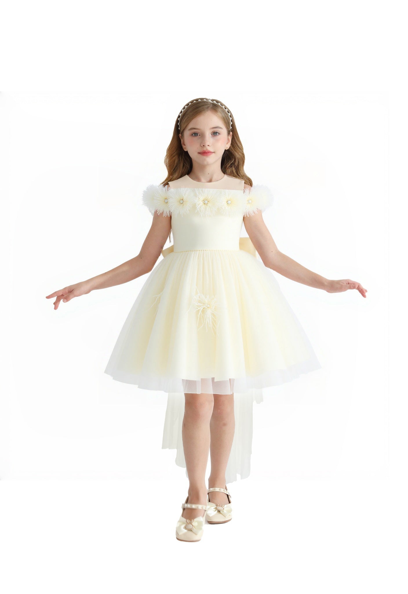 A breathtaking choice for formal occasions, this cream dress features a layered tulle skirt, floral appliqués, and a dramatic sheer train. The puff sleeves and oversized back bow add a regal touch to its fairytale charm.