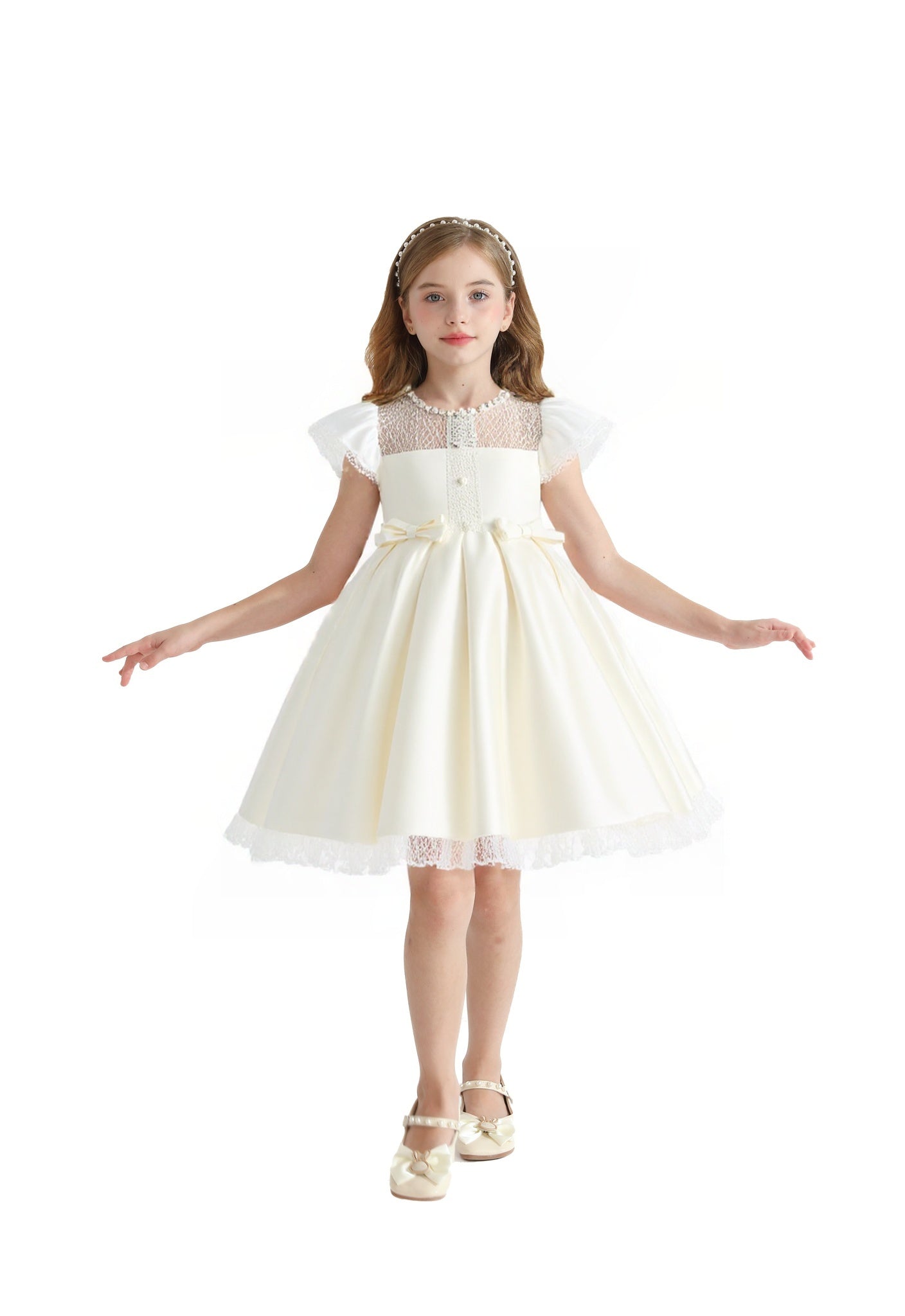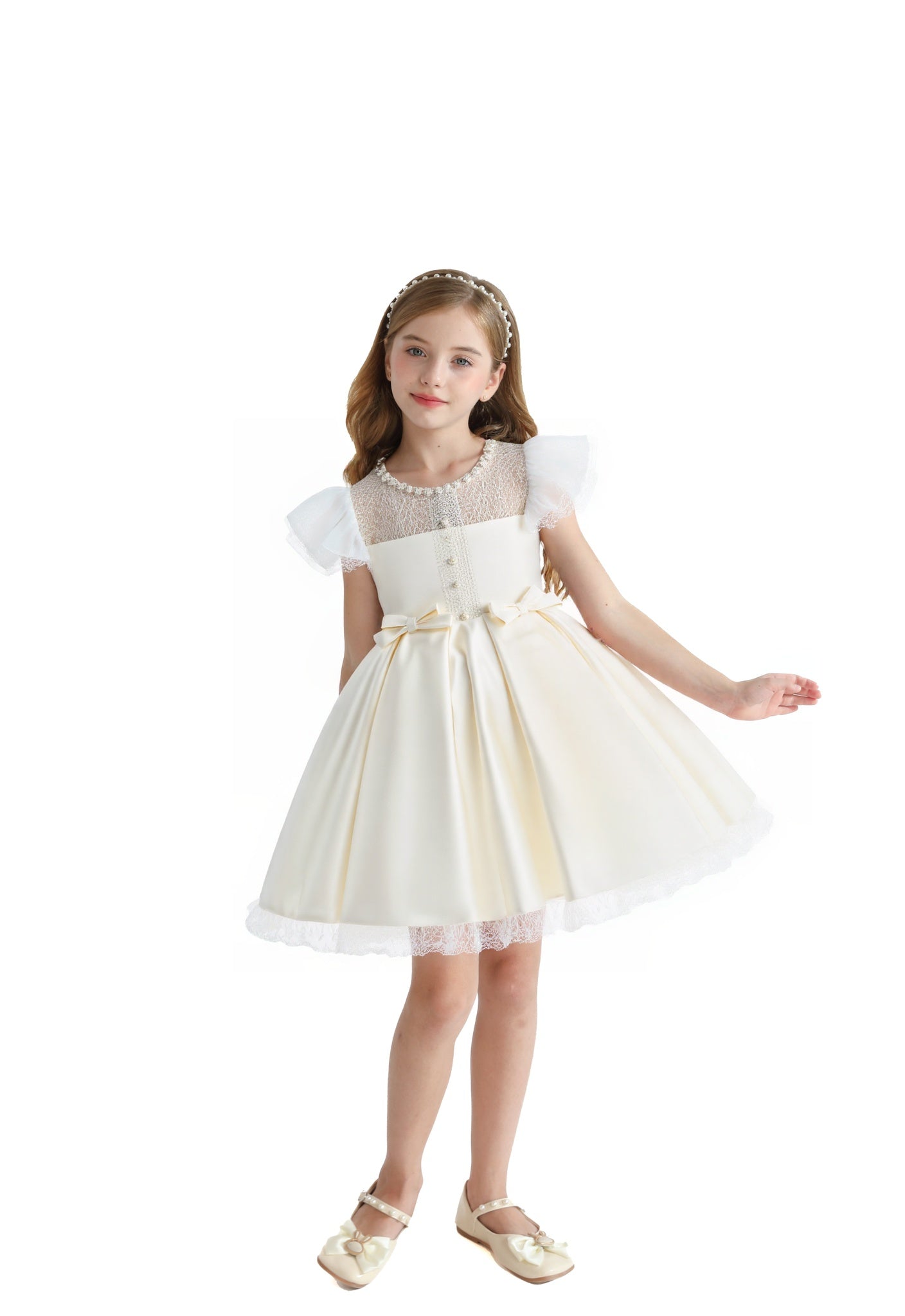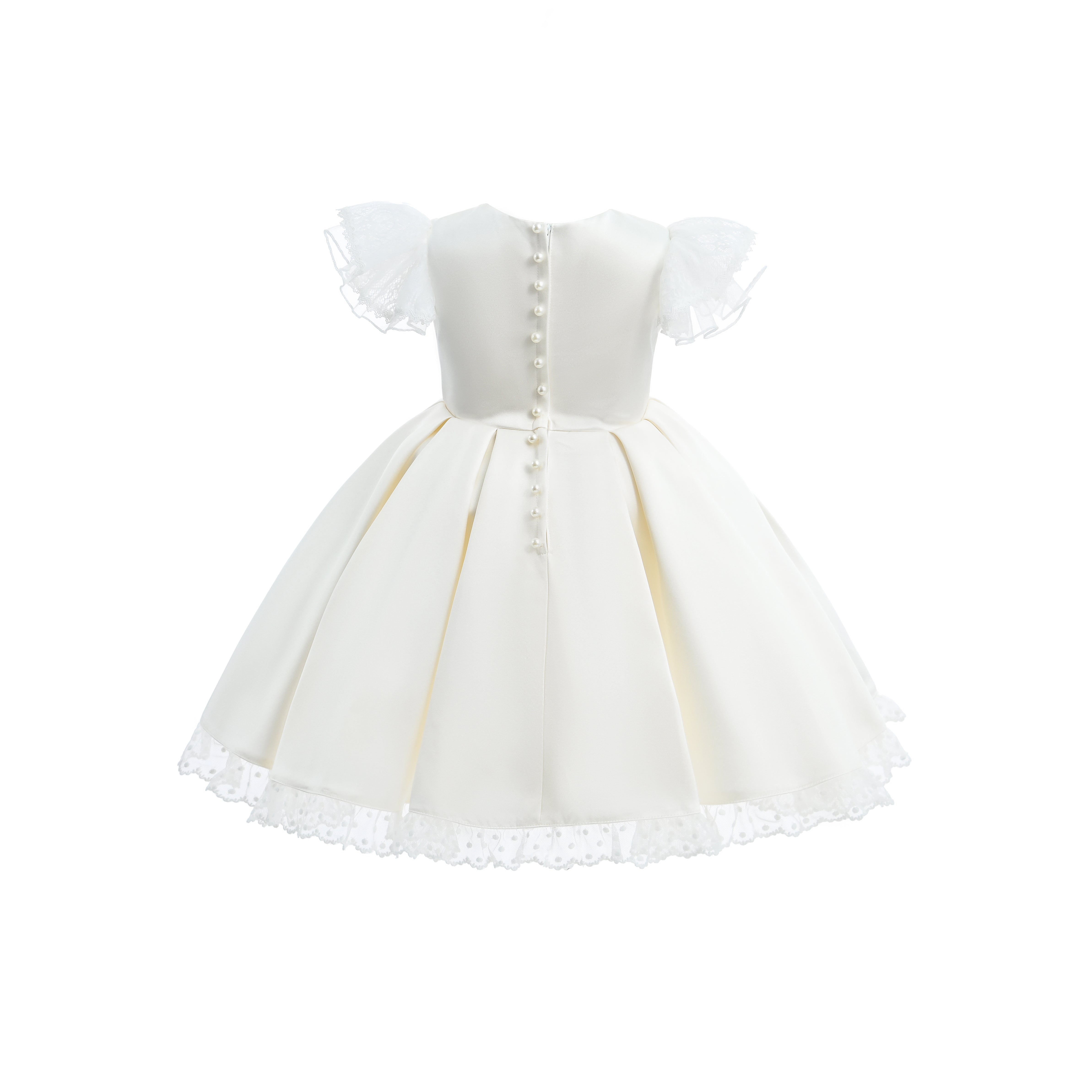 This timeless formal dress blends classic charm with delicate detailing. From its pearl-accented bodice to the pleated skirt and lace hem, every element is crafted for elegance and grace.