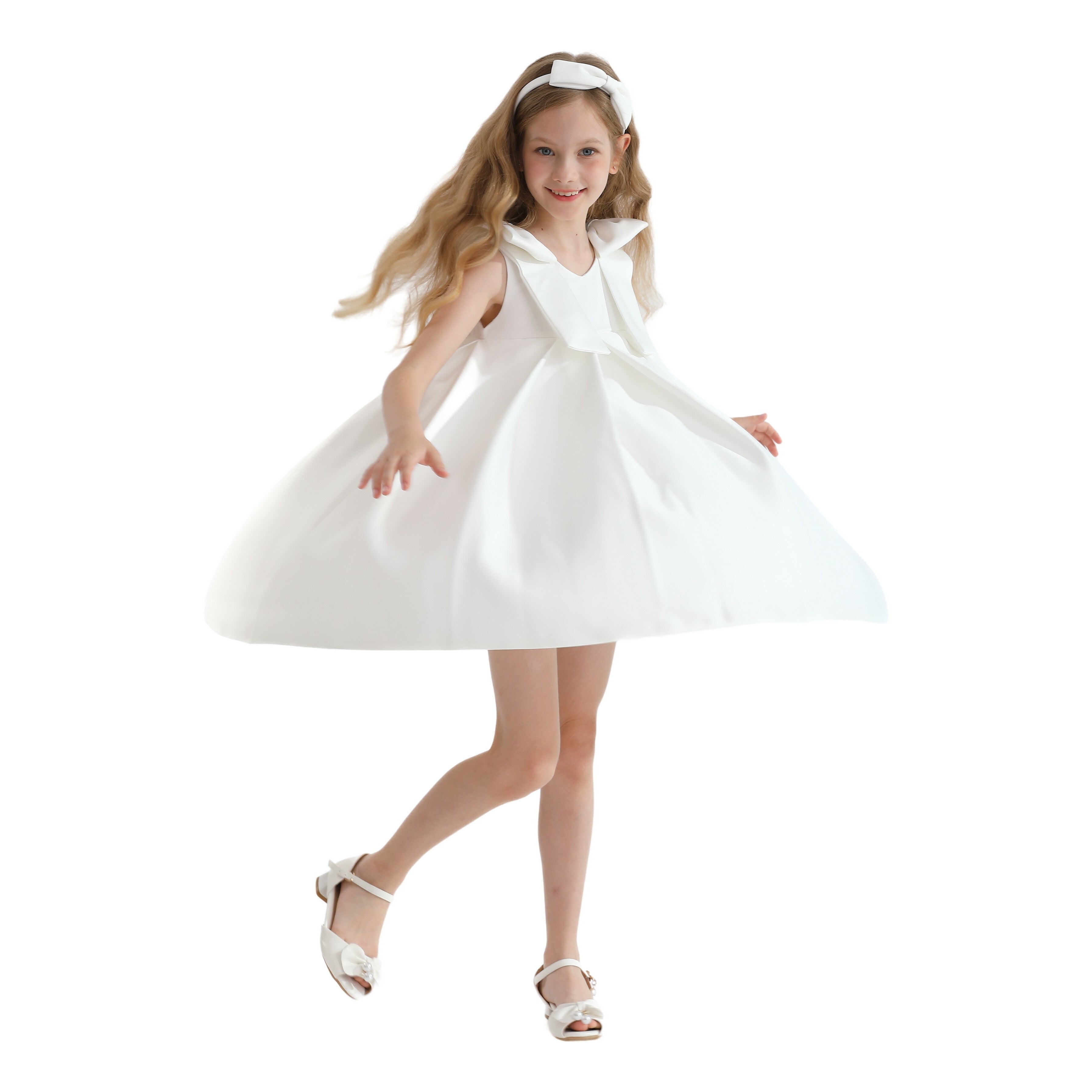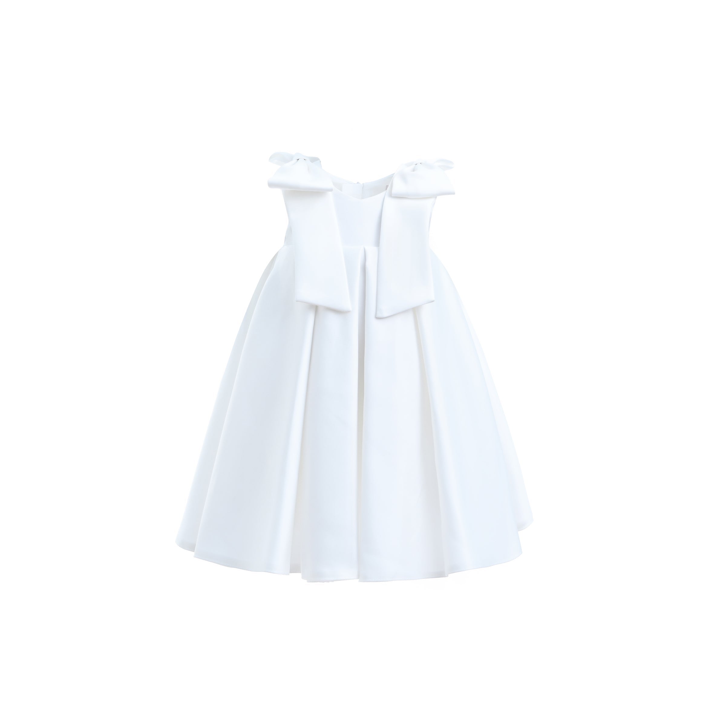 The stylish design elements, combined with the practical and comfortable fit, make it an ideal choice for formal events or special gatherings. Overall, the White Ivory Palermo Satin Bow Pleated Dress combines elegance, comfort, and whimsical design elements, ensuring your child looks and feels special at any event.