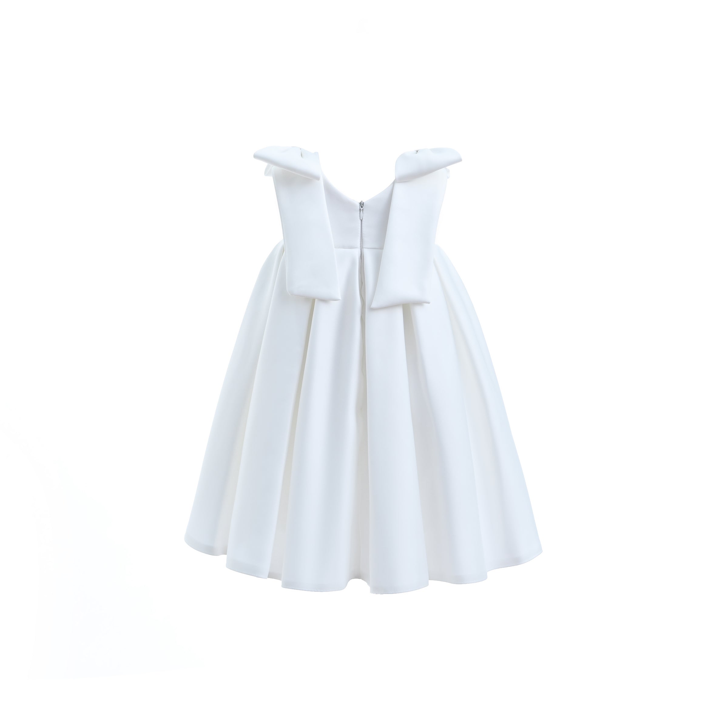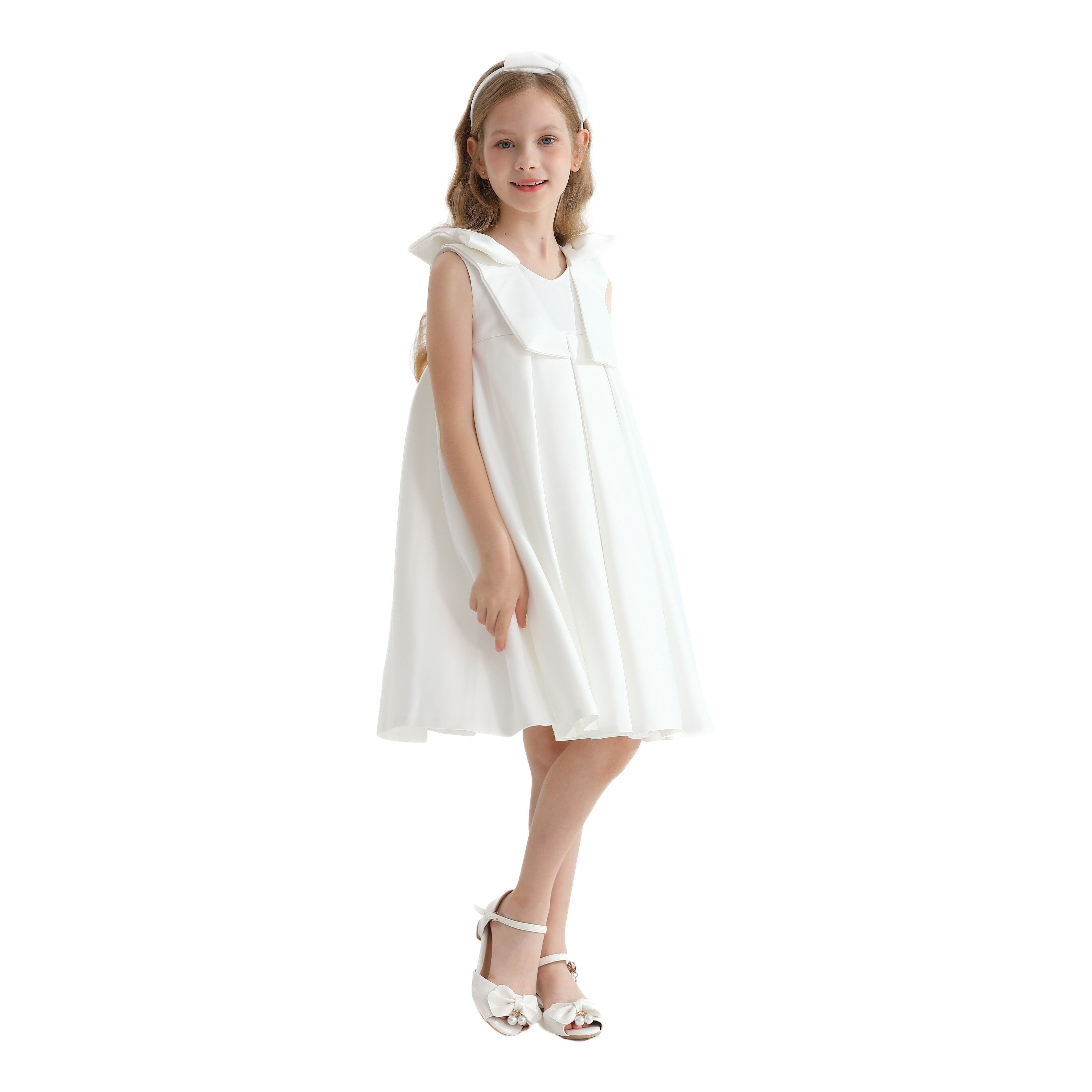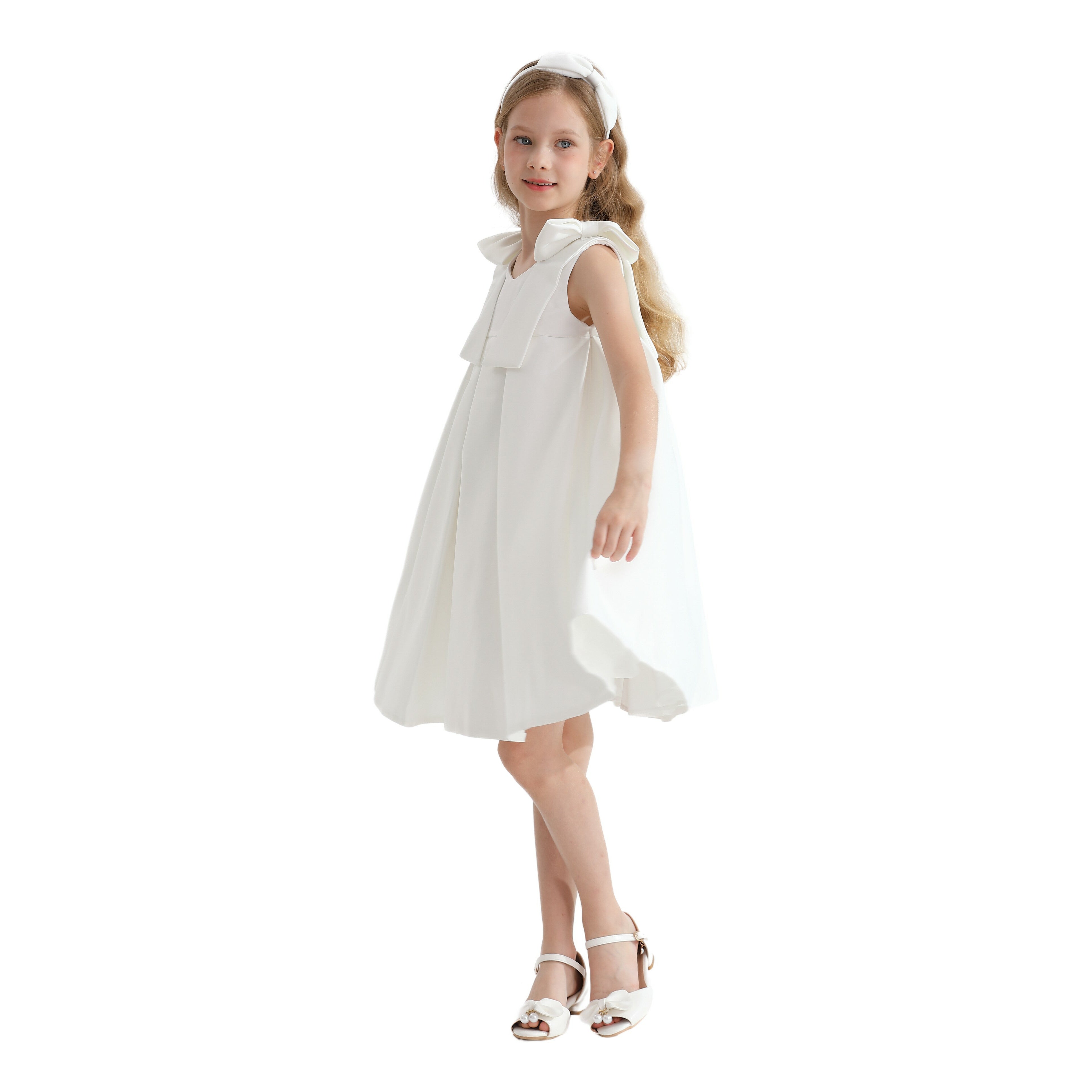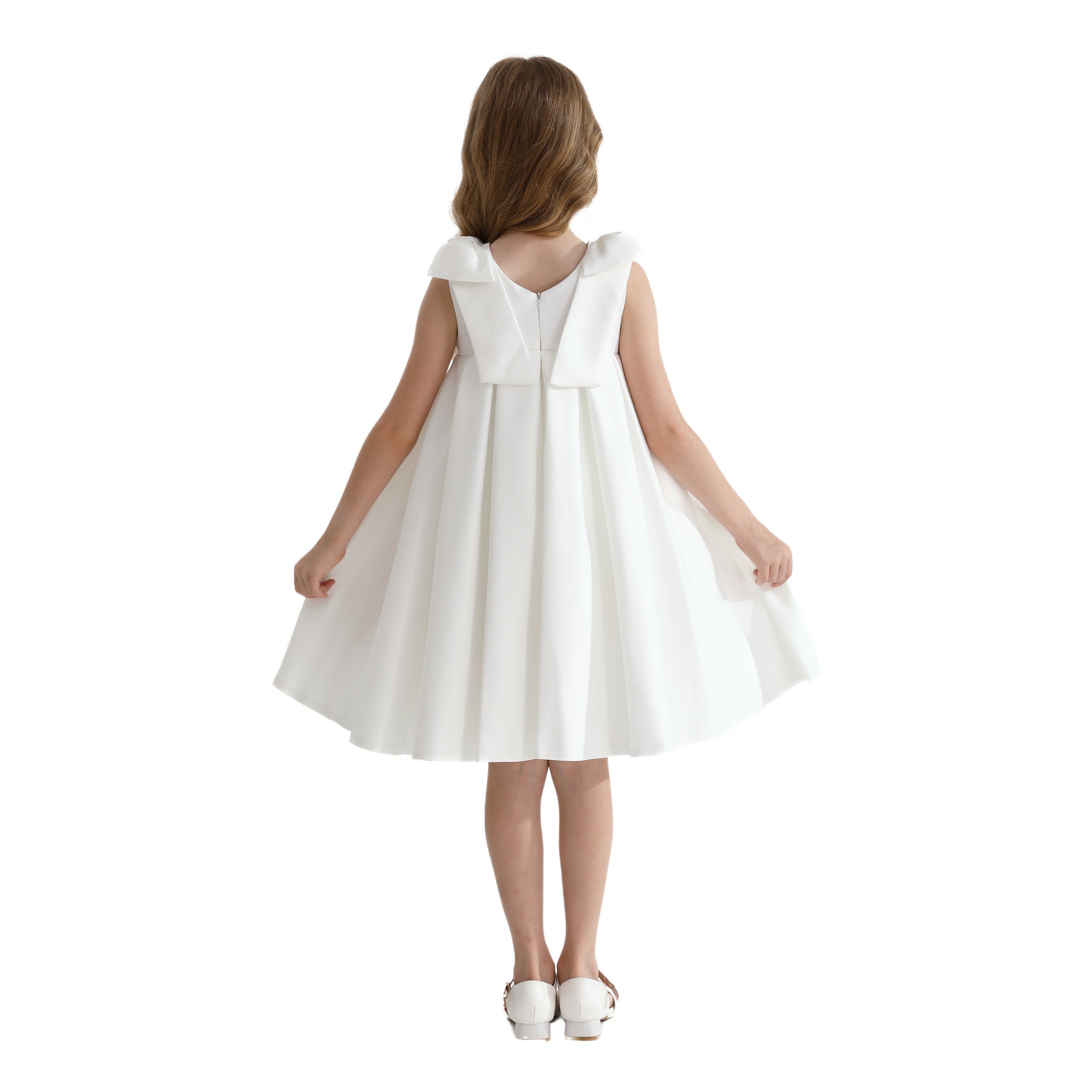 The White Ivory Palermo Satin Bow Pleated Dress for kid and baby girls from Tulleen is enchanting and elegant. This dress features a trapeze silhouette made of soft and lustrous satin. Moreover, the highlight of this dress is the adorable matching bow accents on the shoulders. These dainty bows add a touch of whimsy to the outfit.