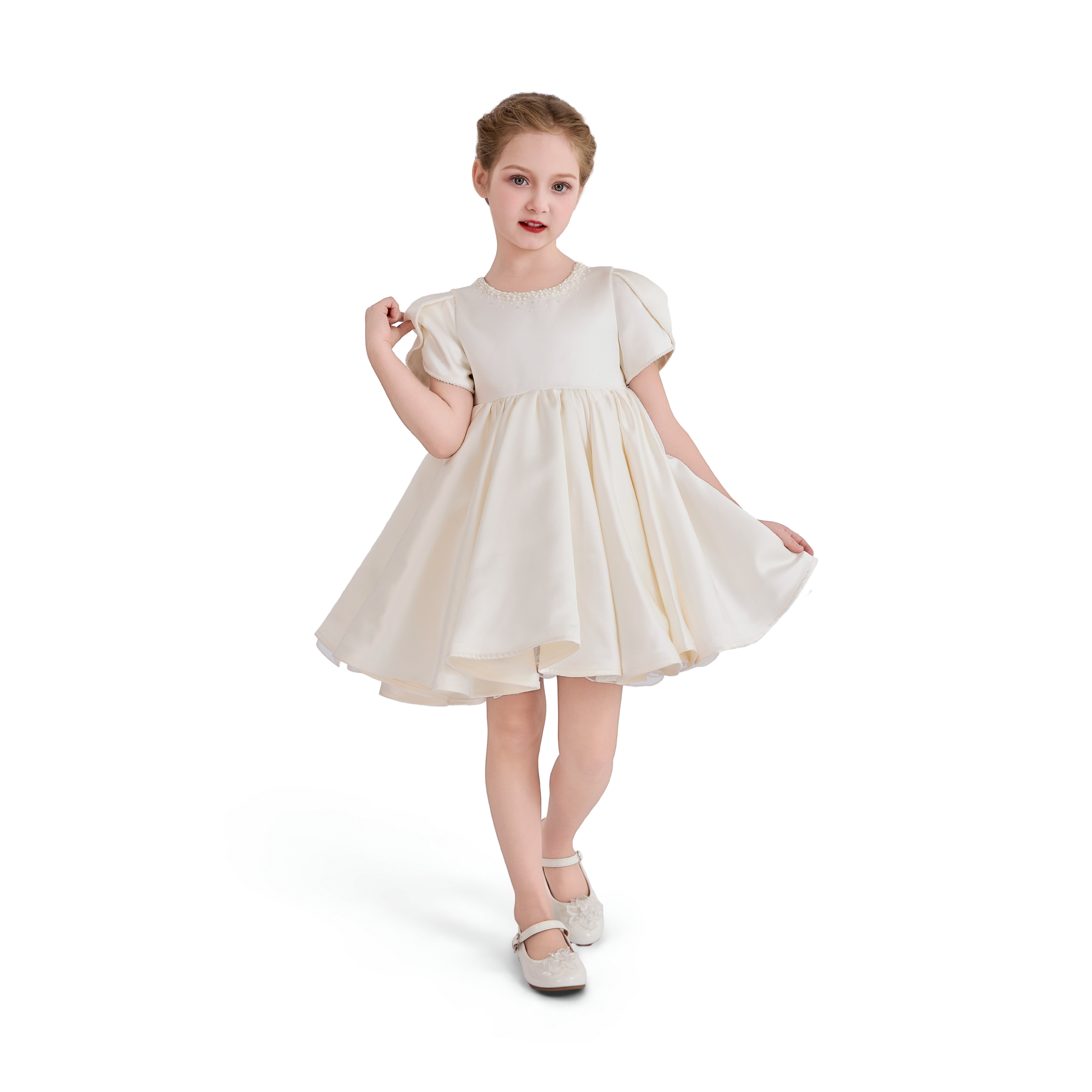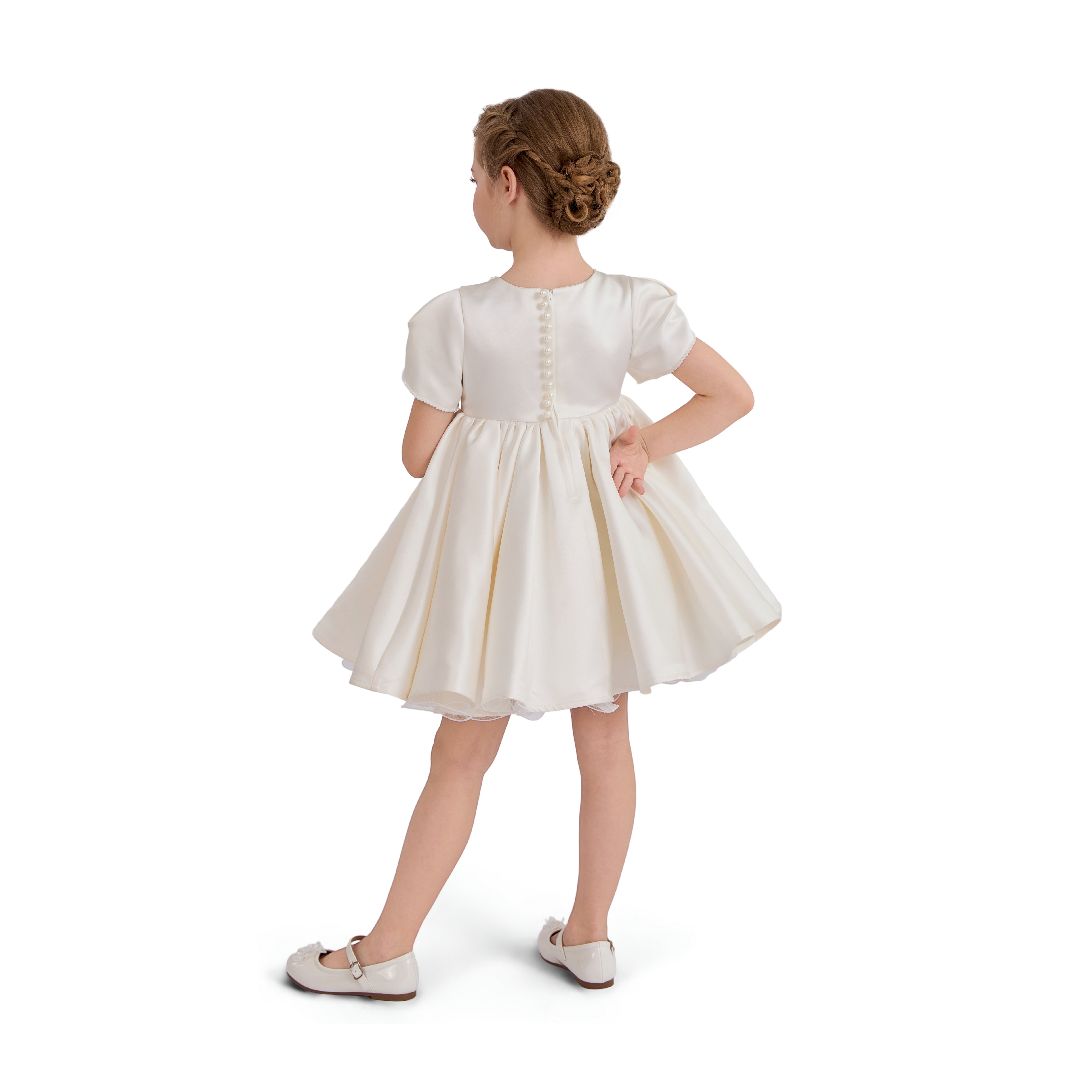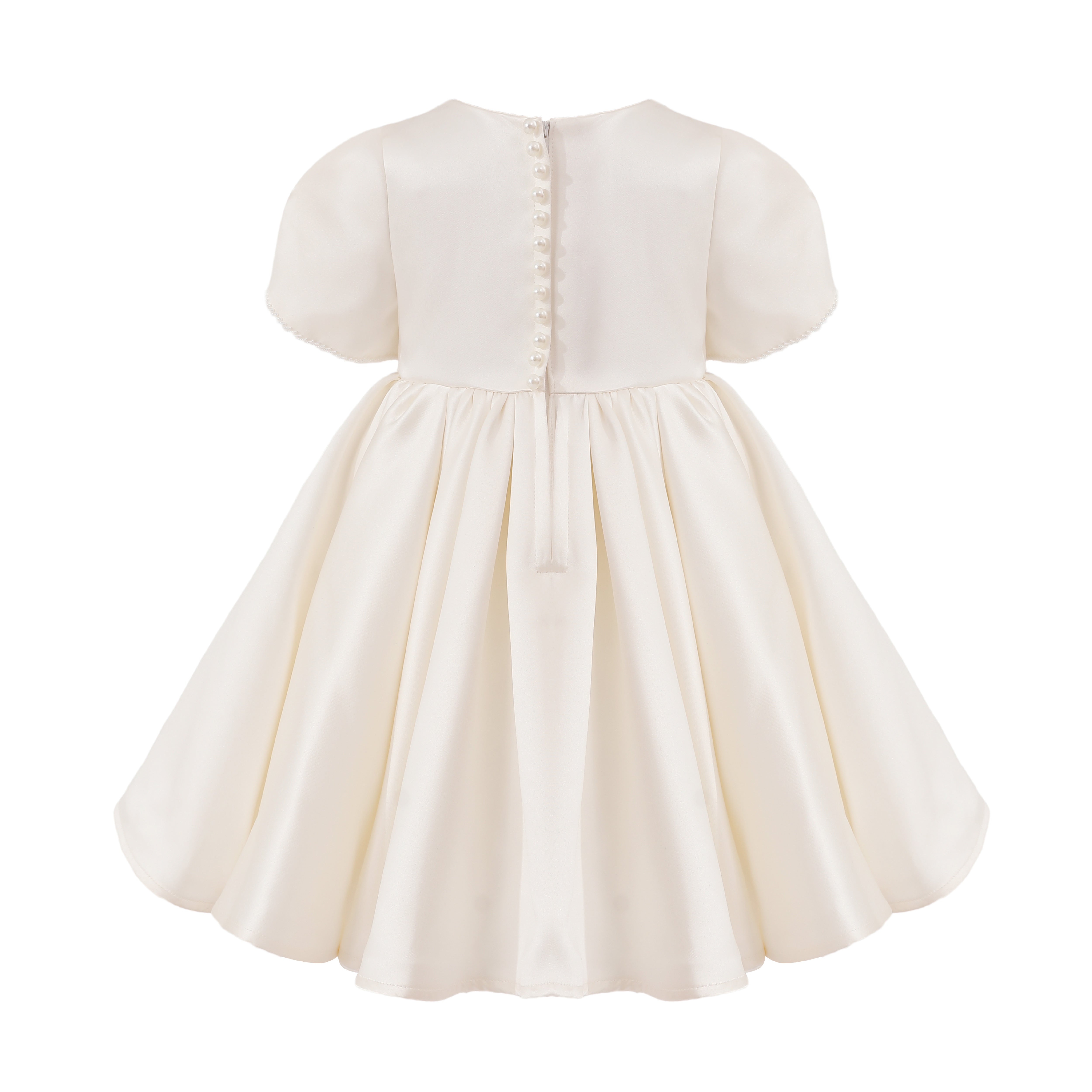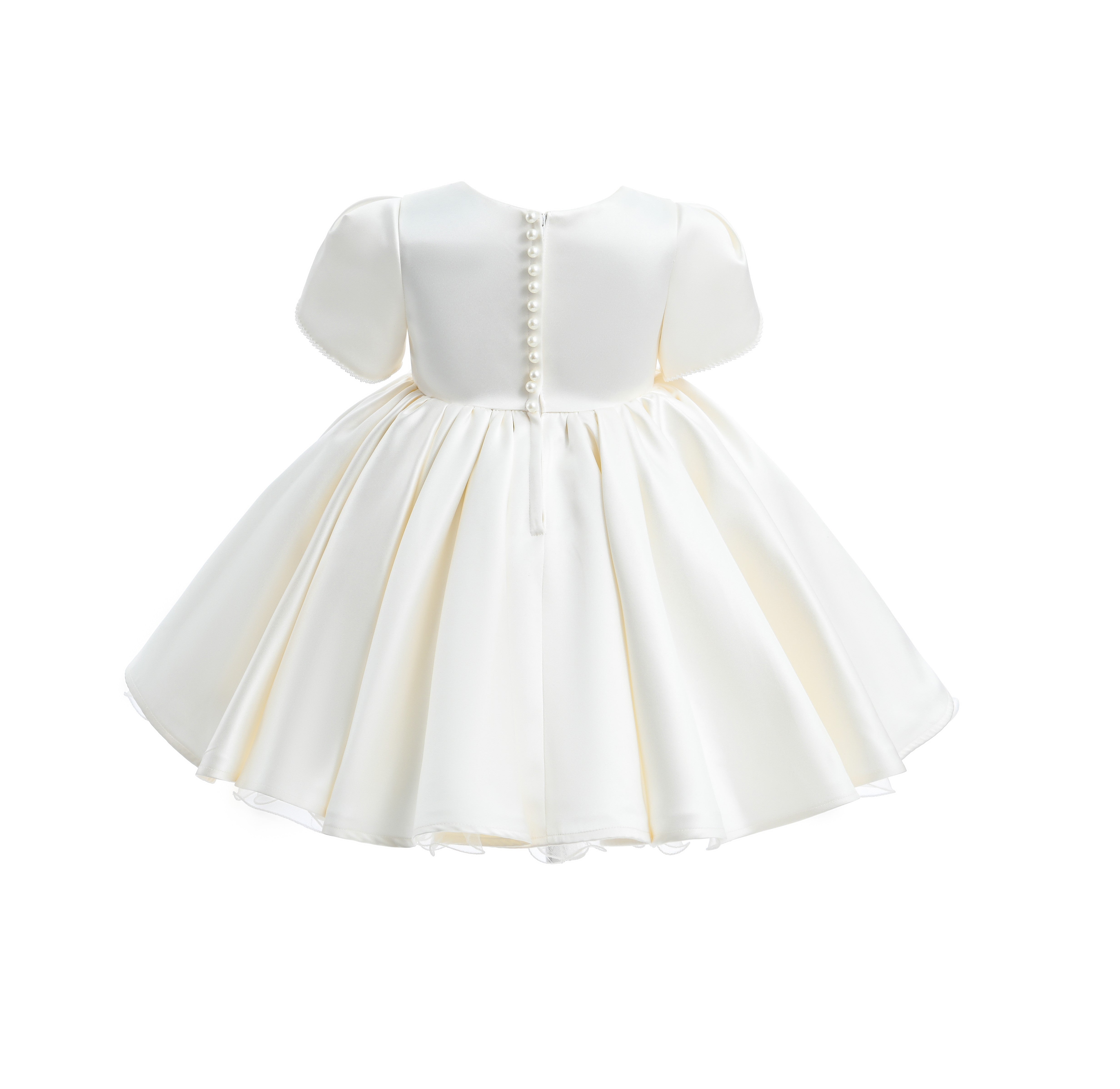 A timeless formal piece crafted for little ones, this elegant dress features a smooth satin finish, delicate puff sleeves, and subtle embellishments at the neckline. Perfect for weddings, christenings, or any special celebration.