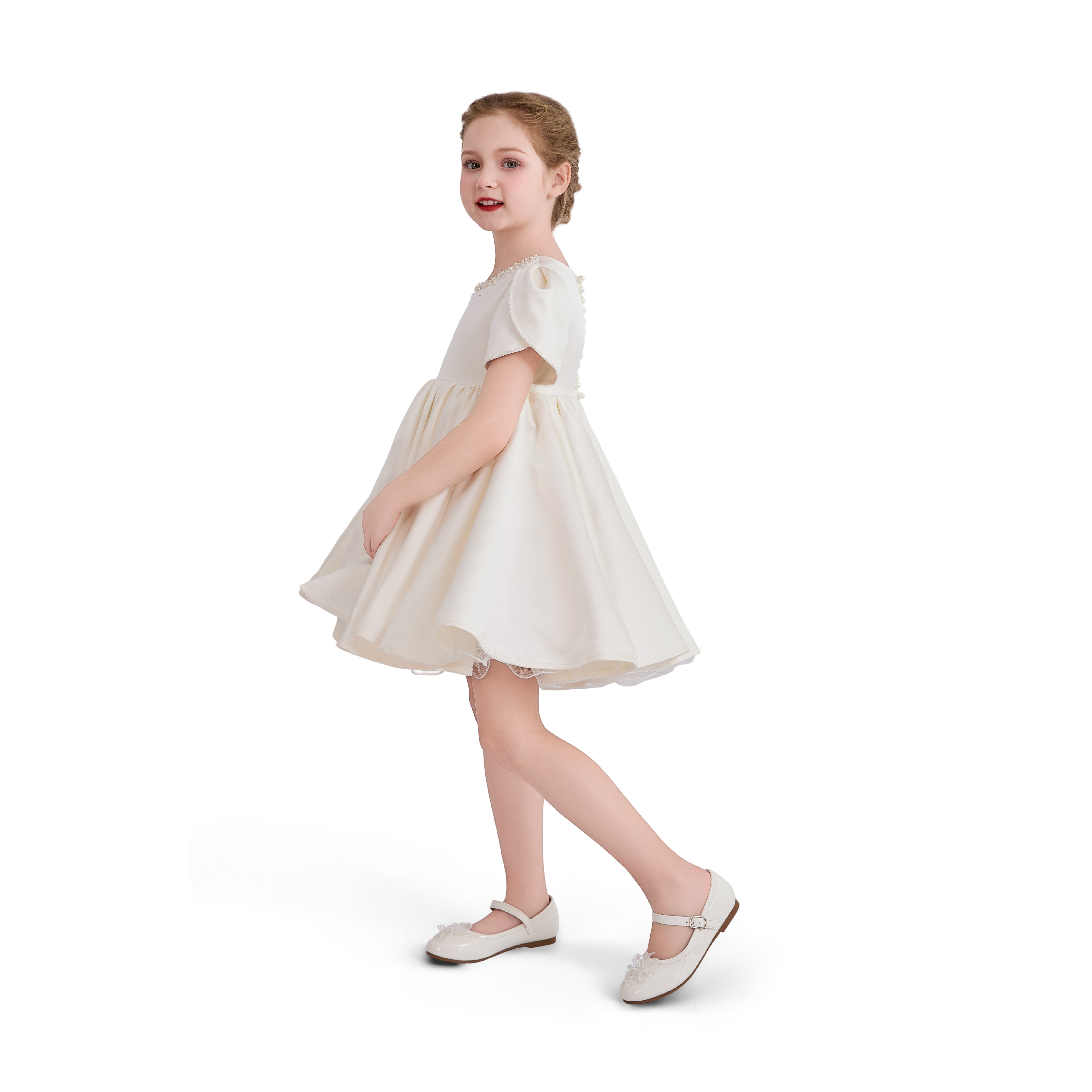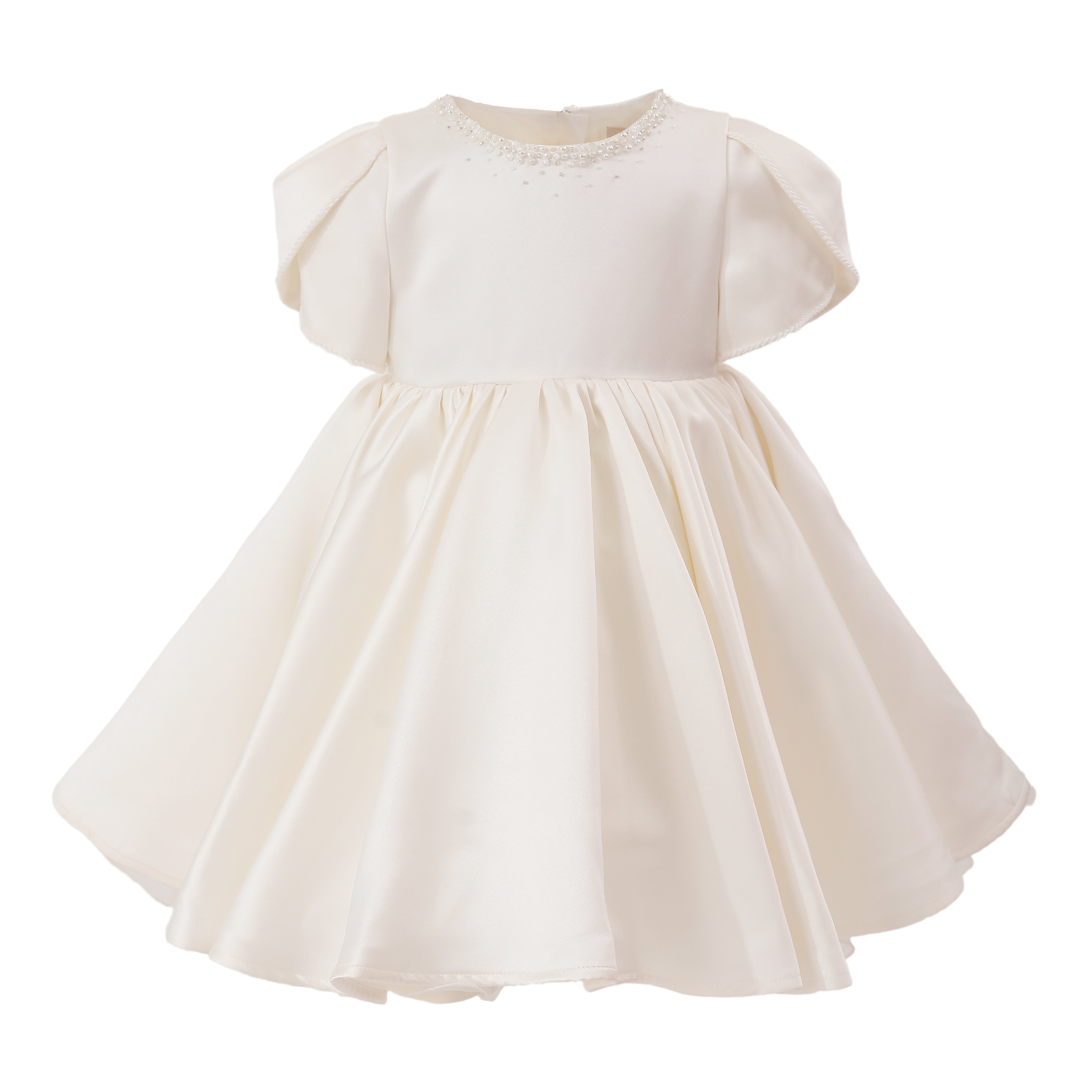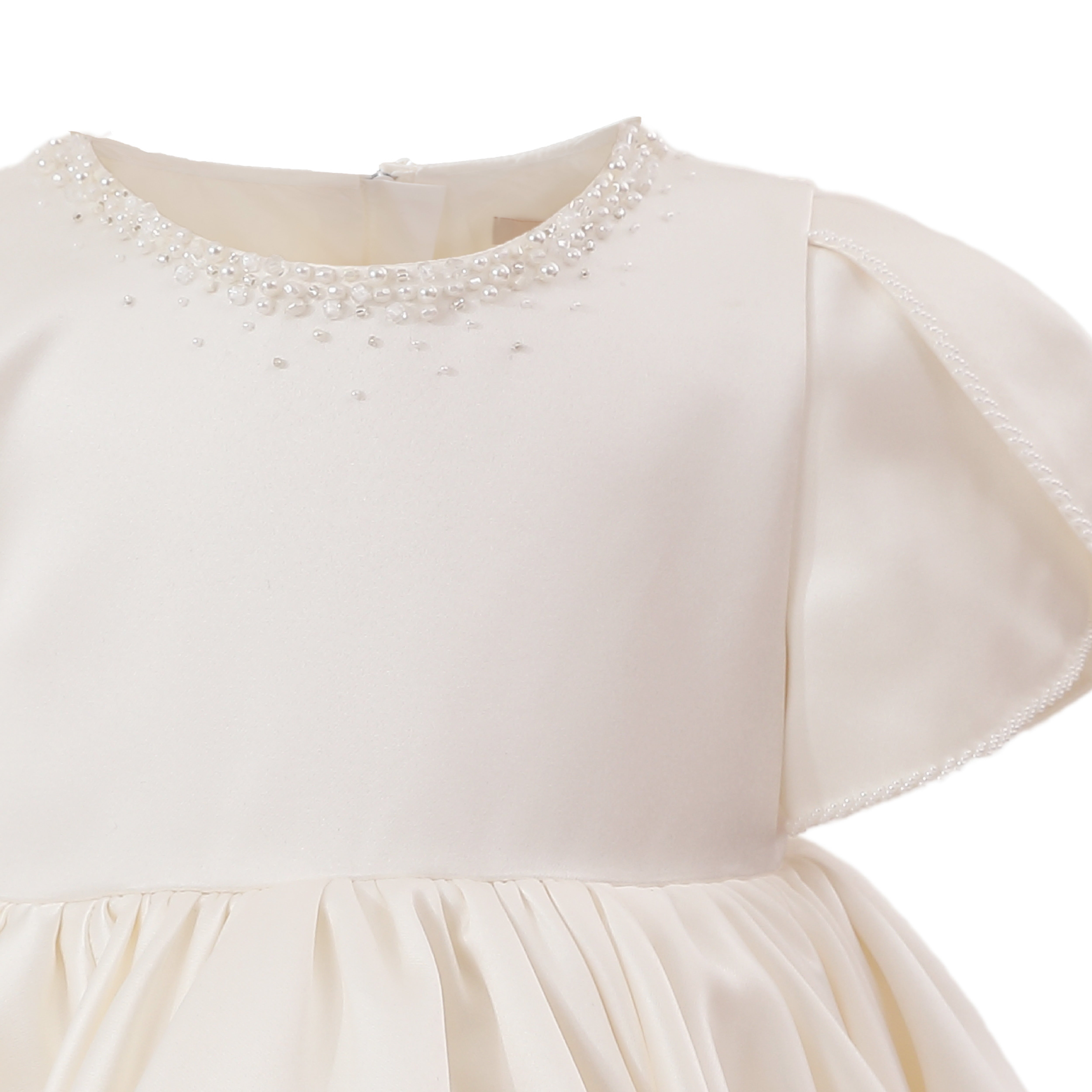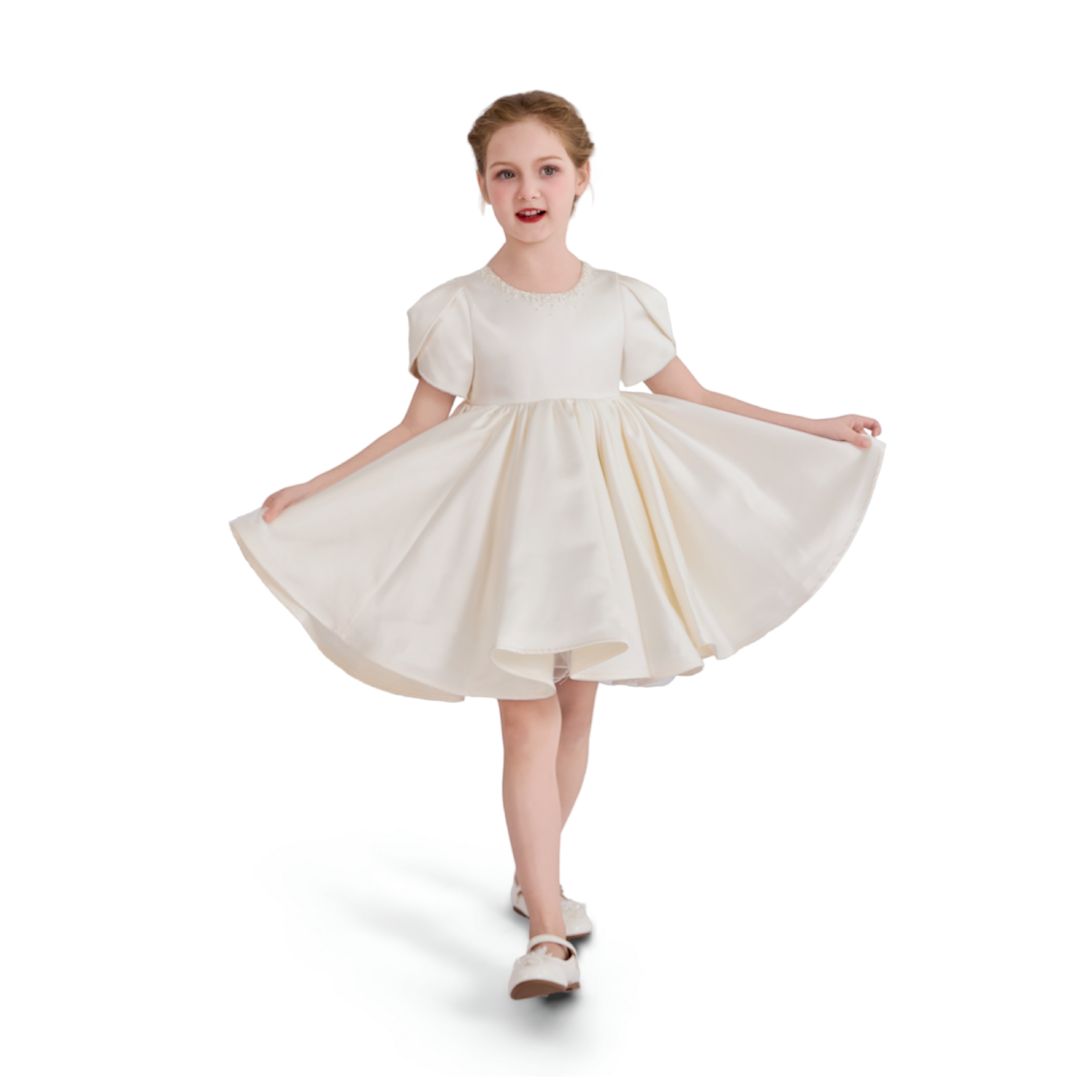 A timeless formal piece crafted for little ones, this elegant dress features a smooth satin finish, delicate puff sleeves, and subtle embellishments at the neckline. Perfect for weddings, christenings, or any special celebration.