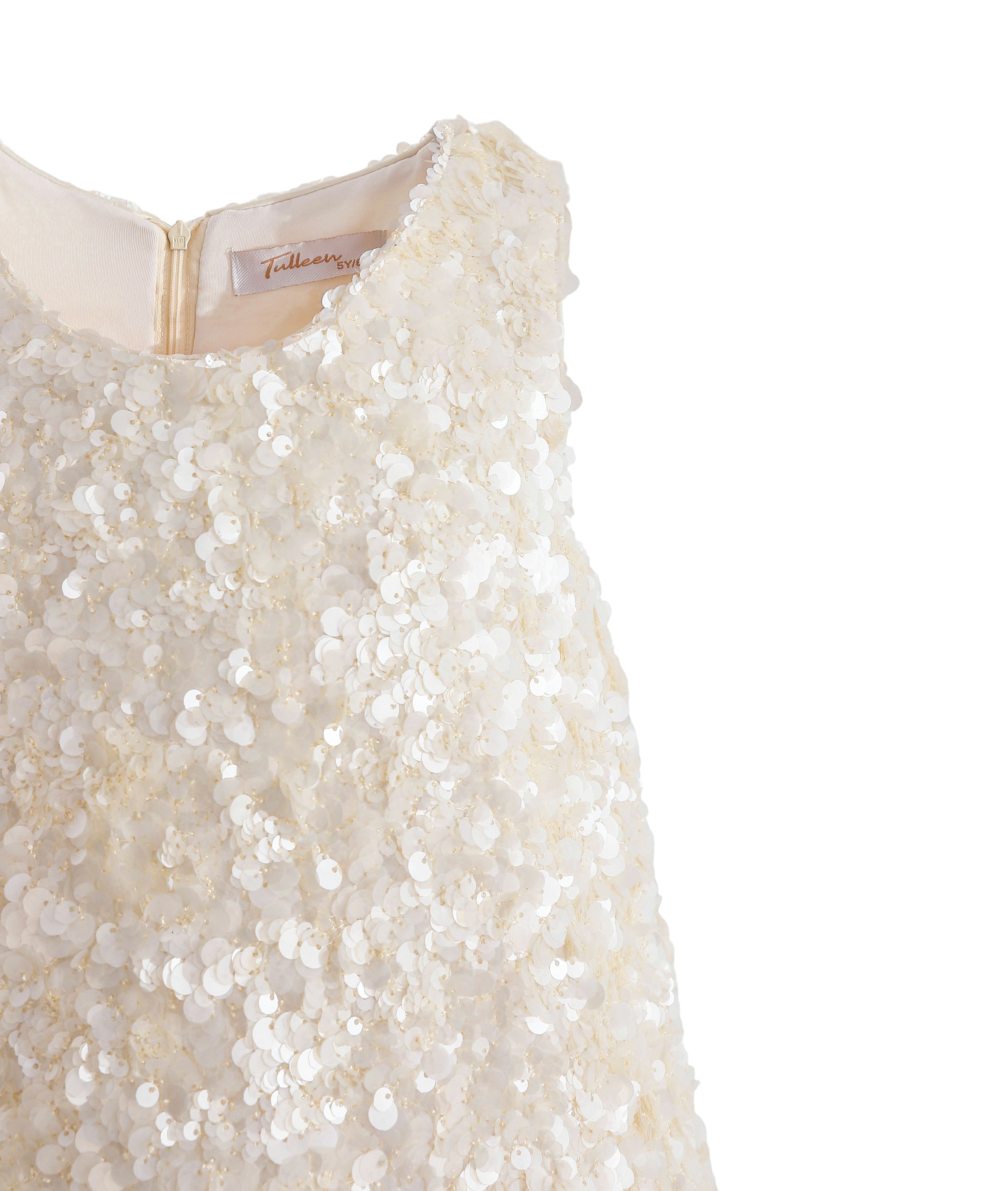 - Allover white and ivory sequins with round neckline and back zipper