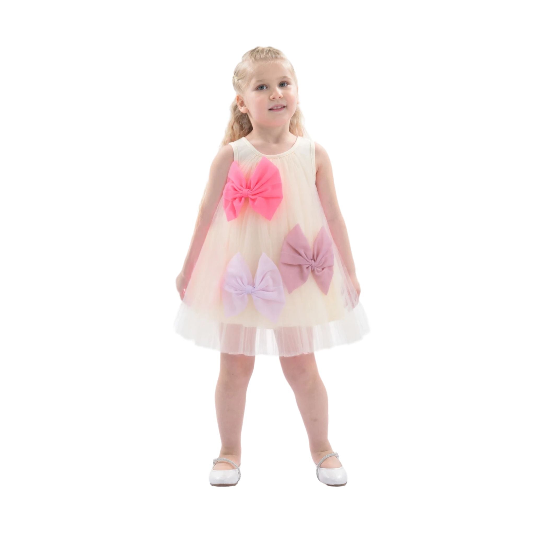 The Ivory Tulle Bow Sleeveless Dress captures delicate elegance with its soft ivory hue and flowing tulle layers. A charming bow detail at the back adds a playful touch, enhancing its graceful silhouette.