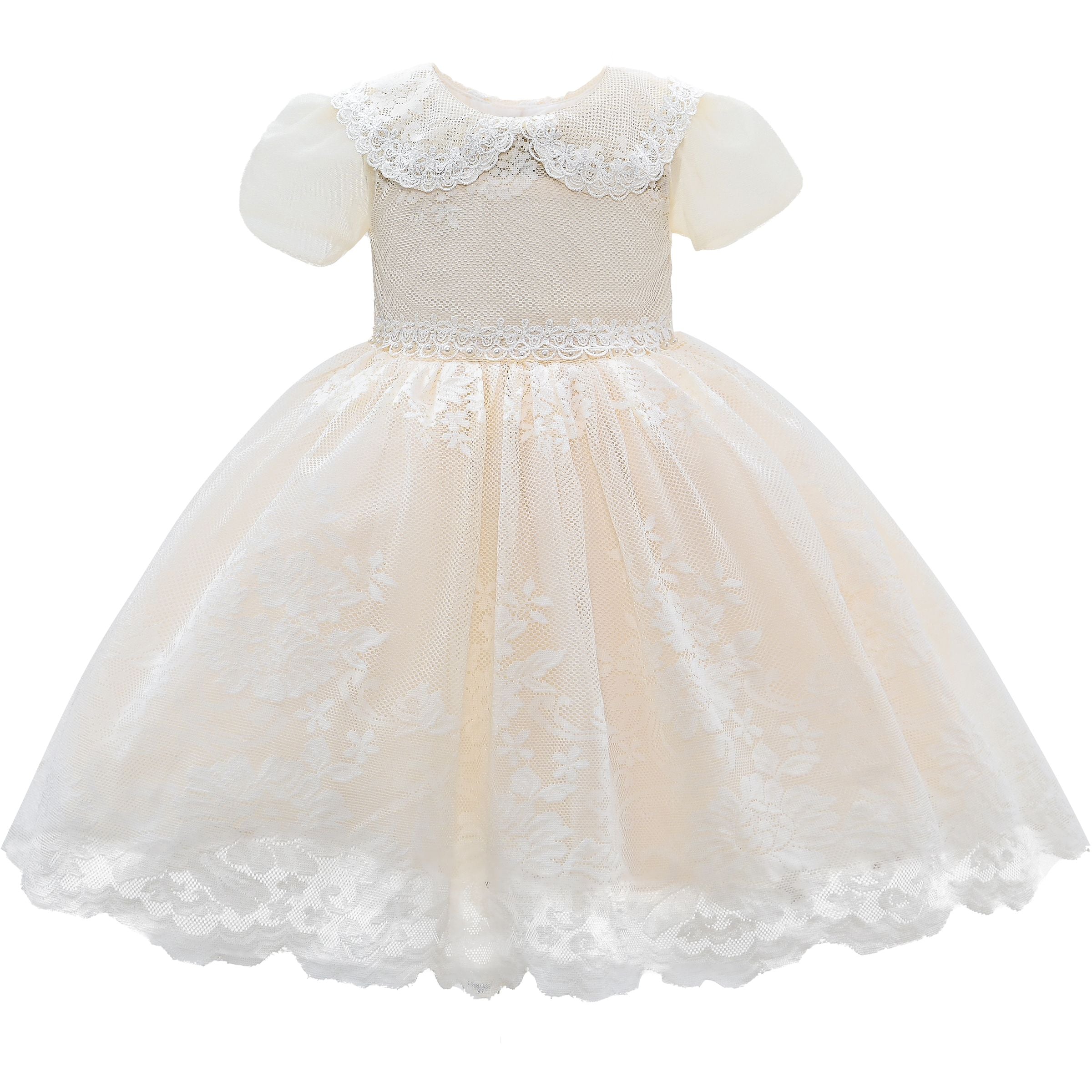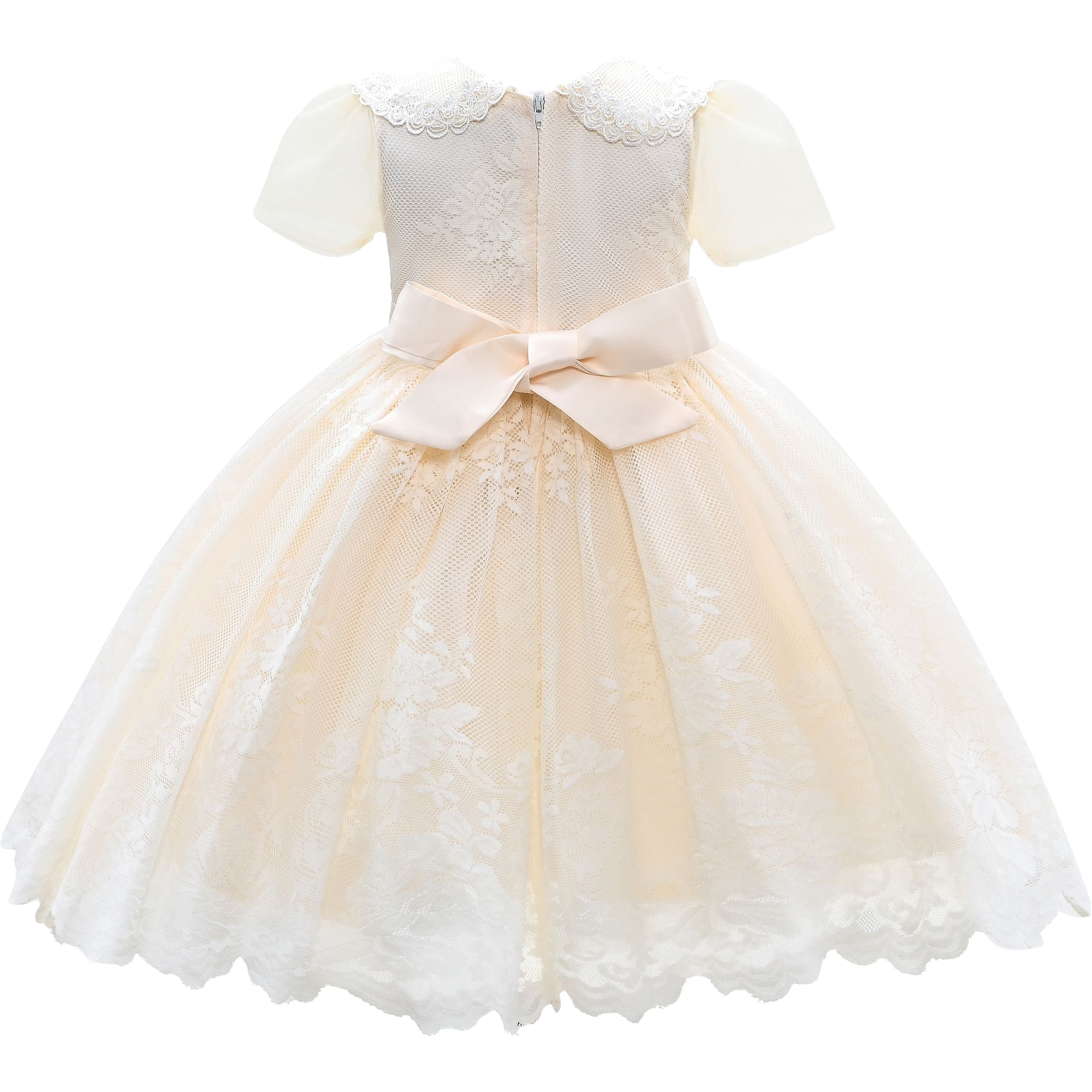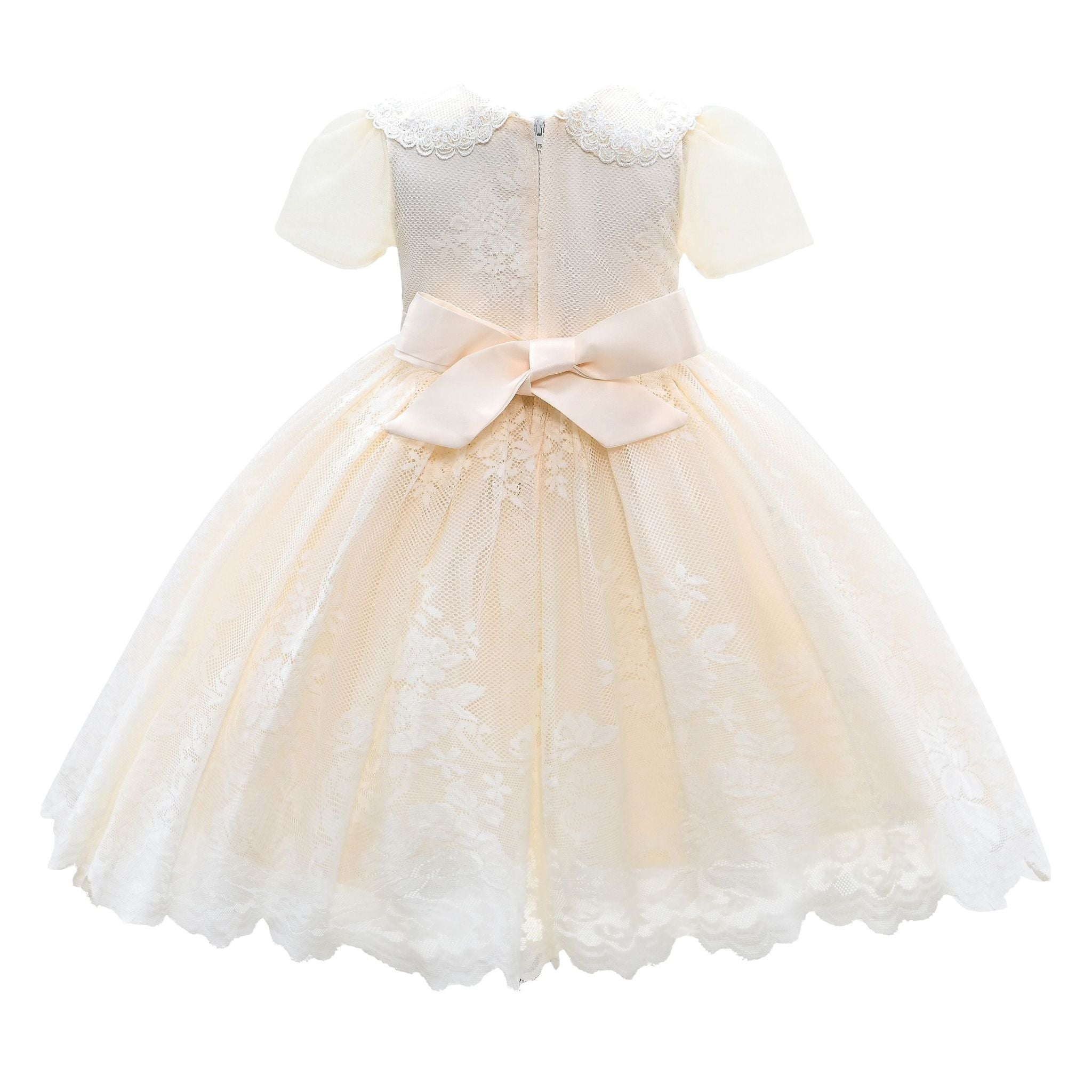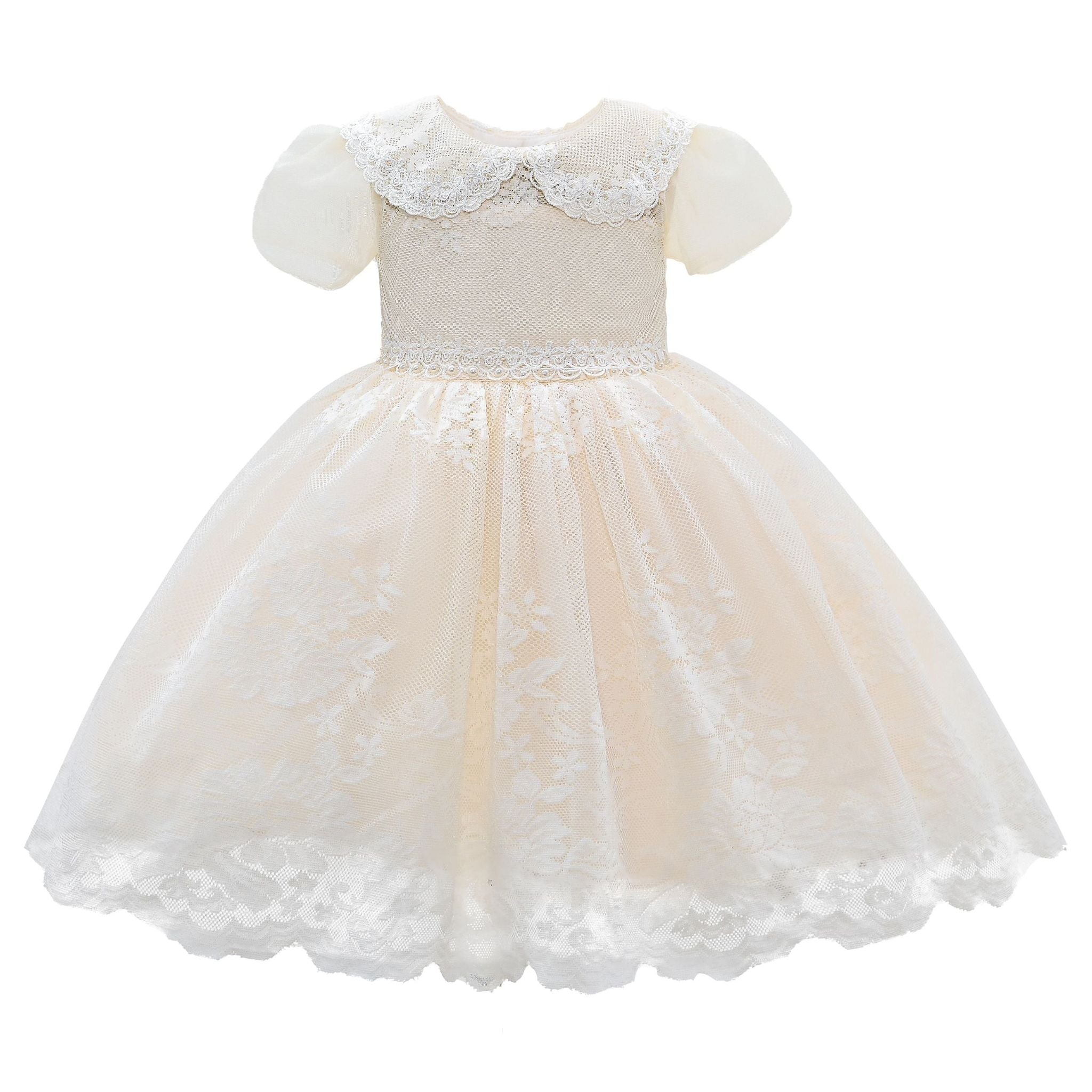 The Ivory White Dolly Lace Embroidered Dress for kid girls from Tulleen is an exquisite choice for any special occasion. Crafted with meticulous attention to detail, this dress features a collared short sleeve bodice adorned with intricate lace embroidery. Moreover, the dainty lace design adds a touch of gracefulness and subtle texture, making the dress stand out.