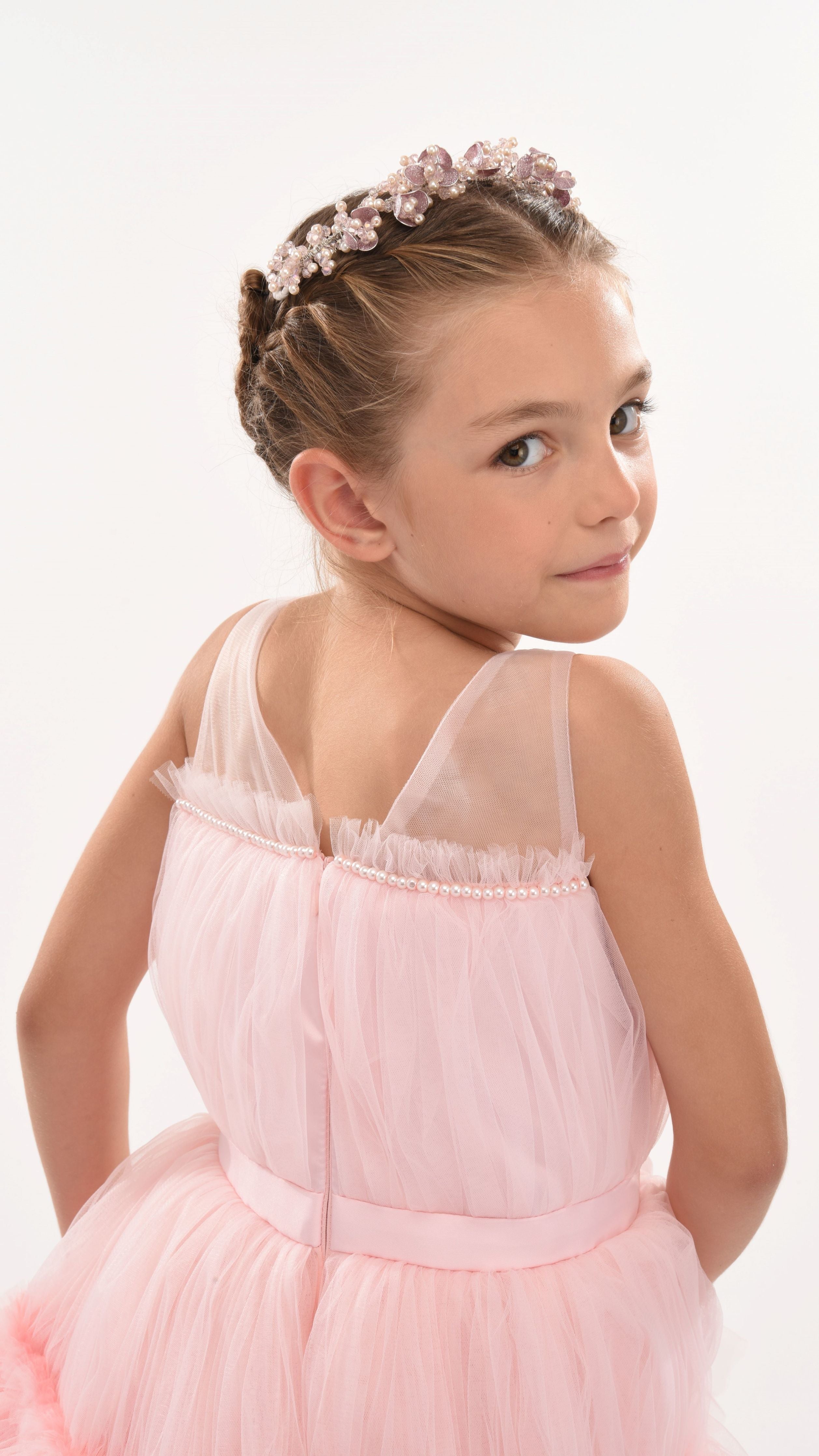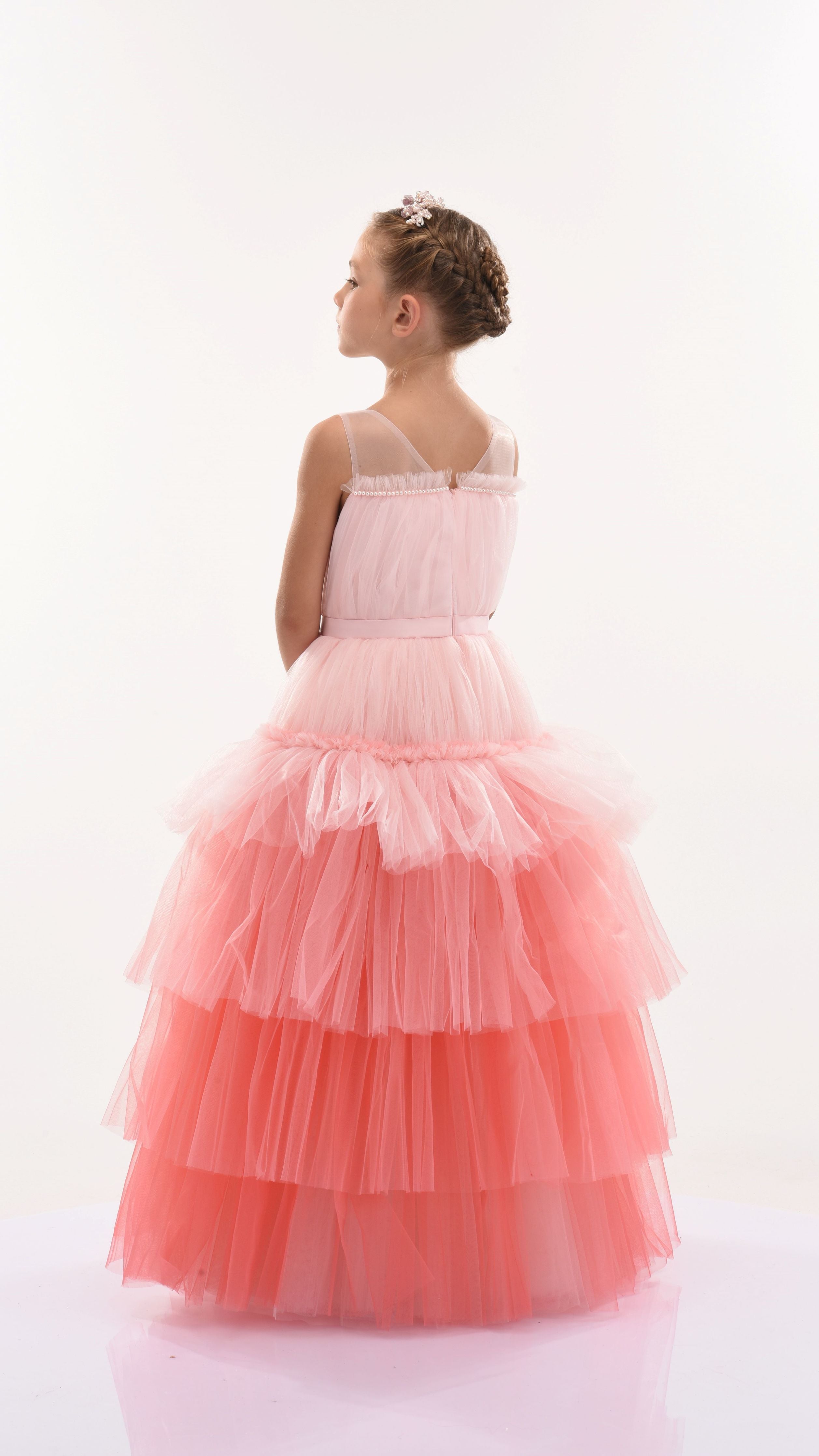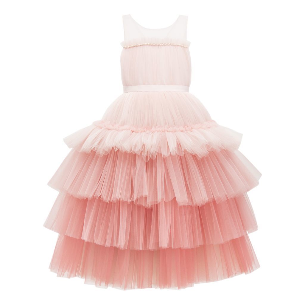 This dress is sure to spark some joy inside you with its amazing tiers with varying hues of pink. These bright tones graciously ombré to a light pink bodice, adorned with tulle. This ruffle tiered cupcake dress is every girl's sweet dream.