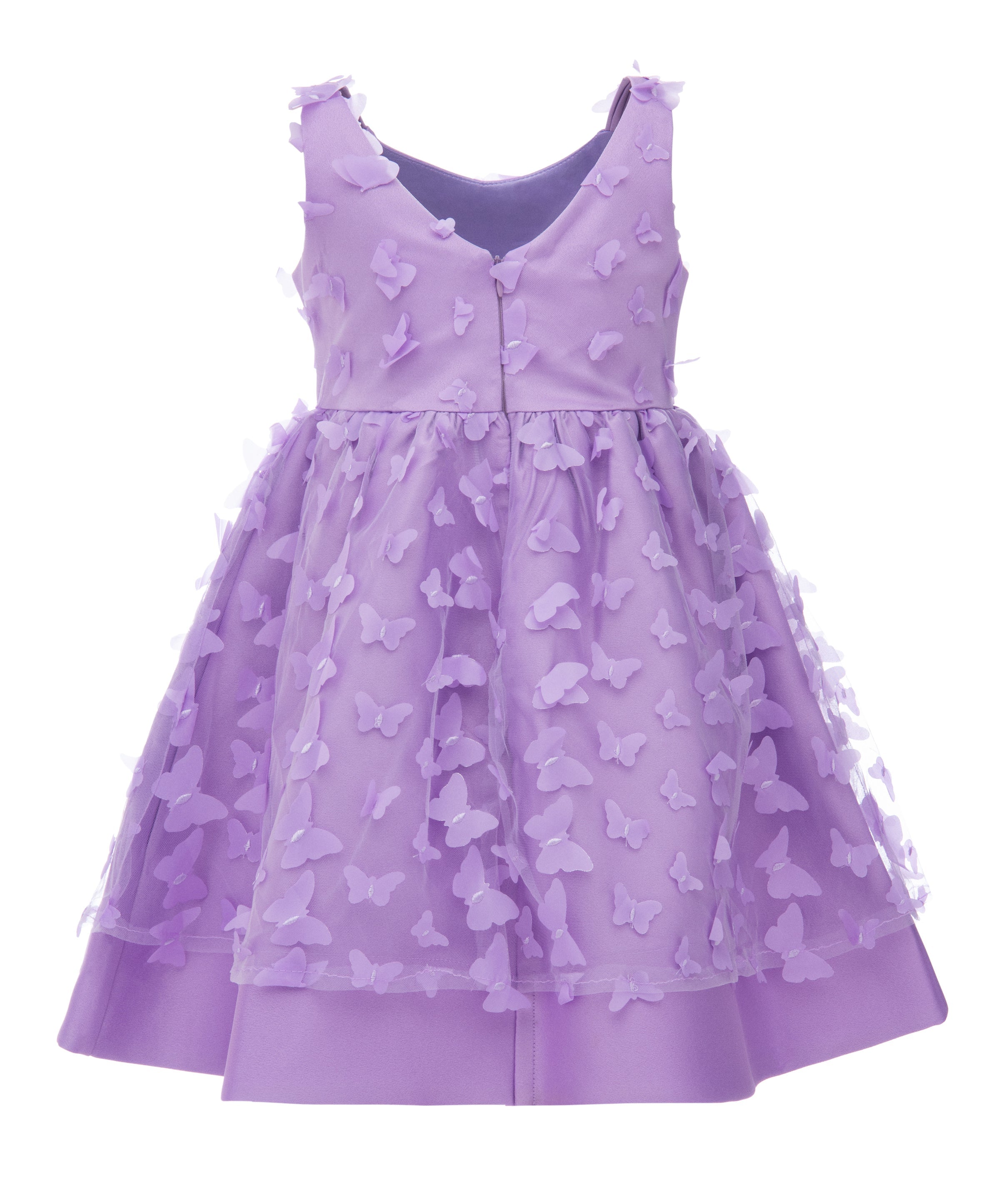 The zip closure at the back allows for easy dressing and a secure fit. Designed to be dry cleaned only, this dress maintains its quality and luxurious appearance over time. Overall, the Lavender Mariposa Tulle Dress combines elegance, comfort, and playful design elements, making it a perfect addition to any young girl's wardrobe. This dress ensures your child looks and feels special at any event.