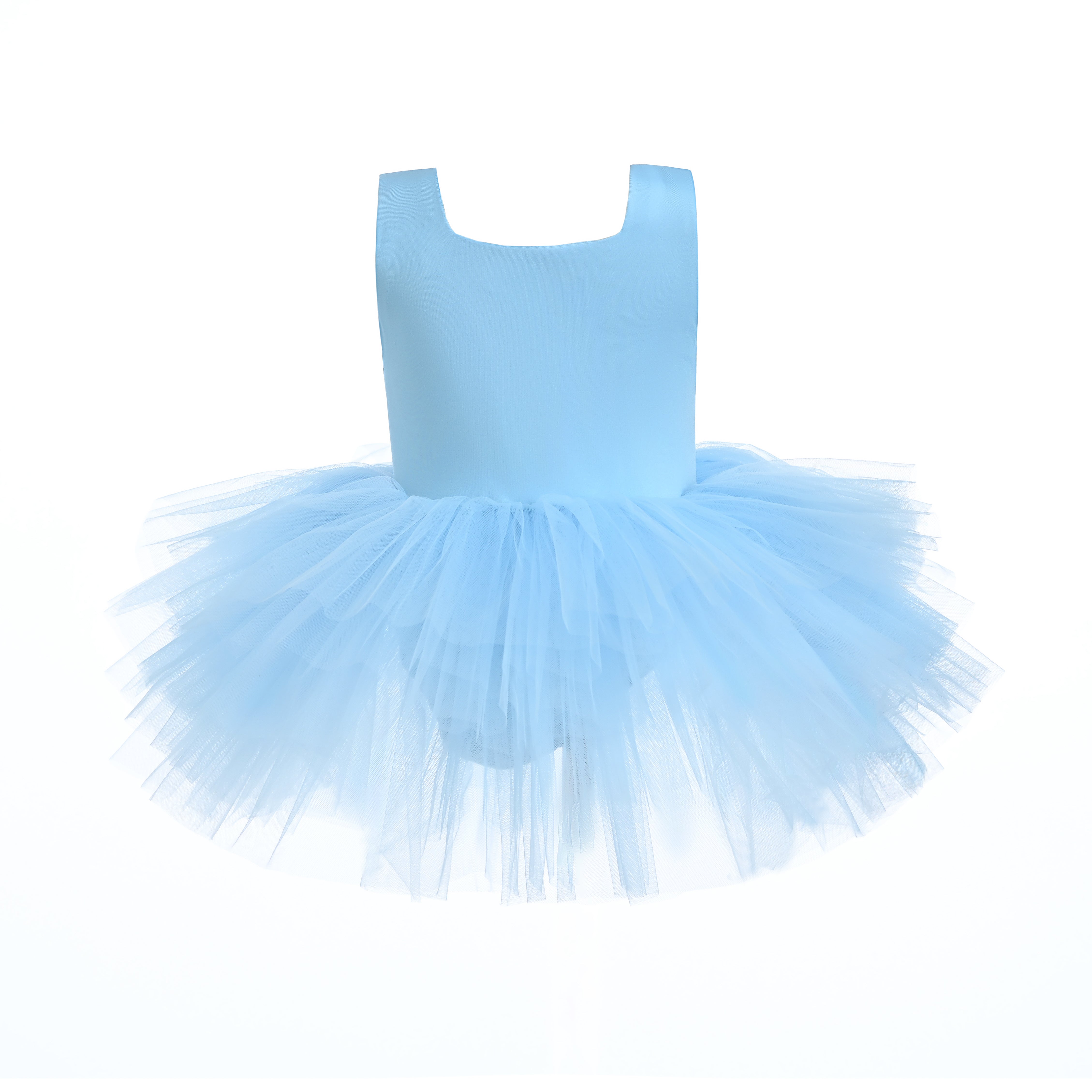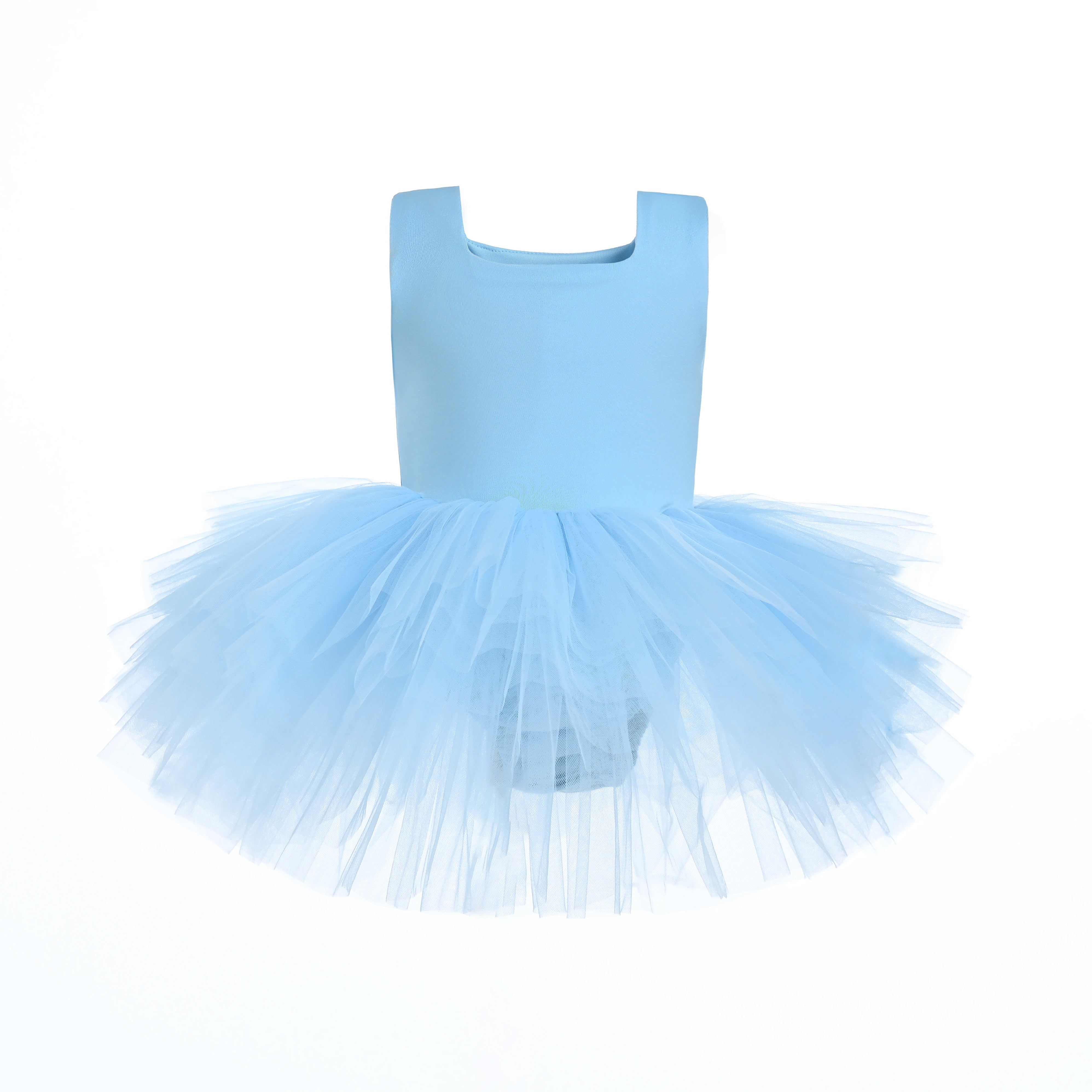 The Light Blue Layered Leotard captures a dreamy elegance with its soft pastel hue and fluid design. Styled with airy layers of tulle cascading from the waist, it creates a light, tutu-like effect that sways beautifully with movement.