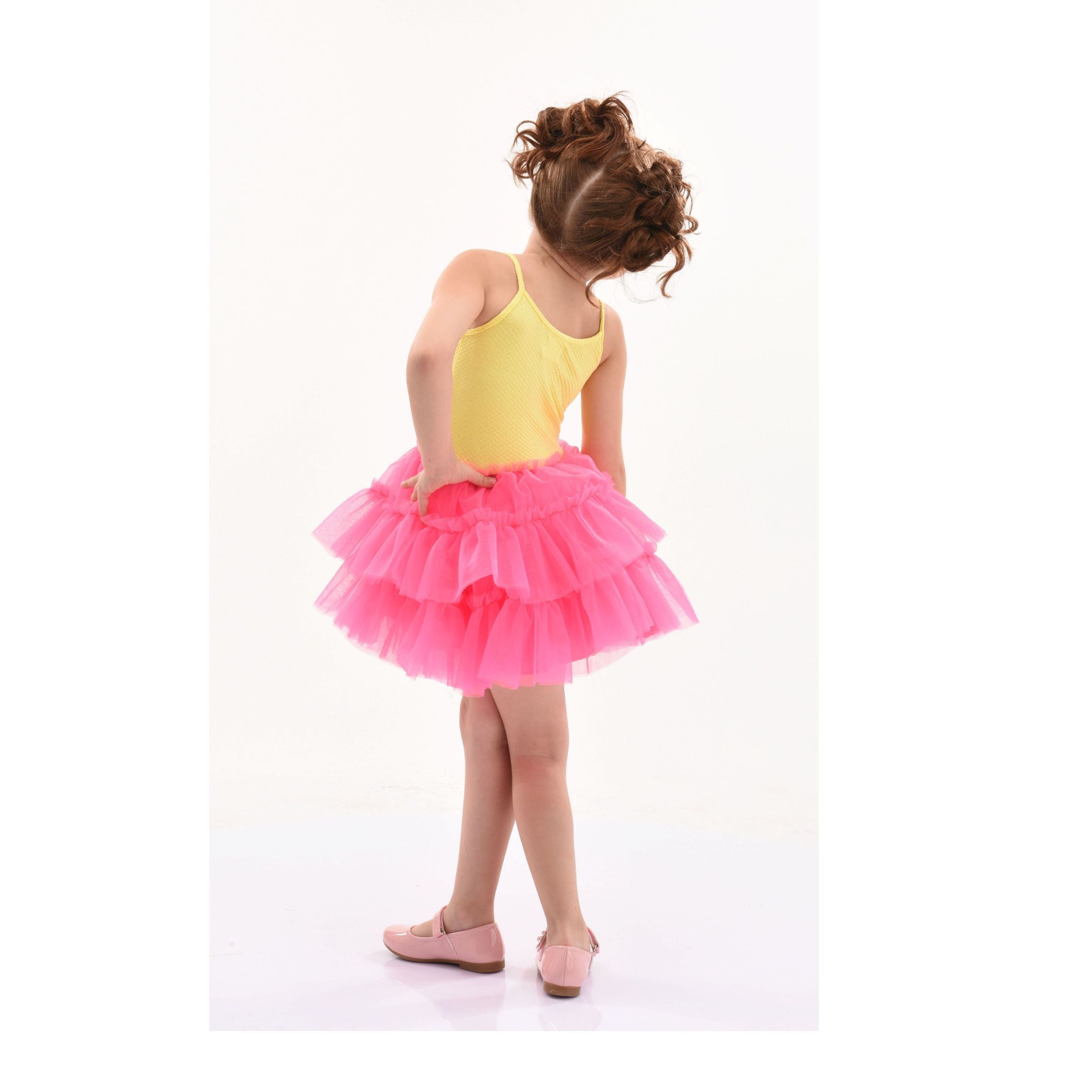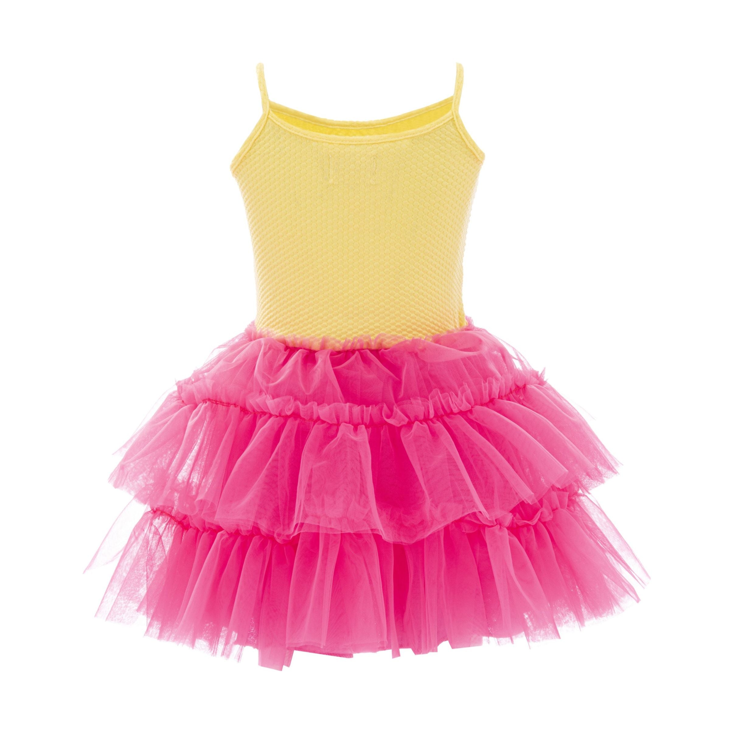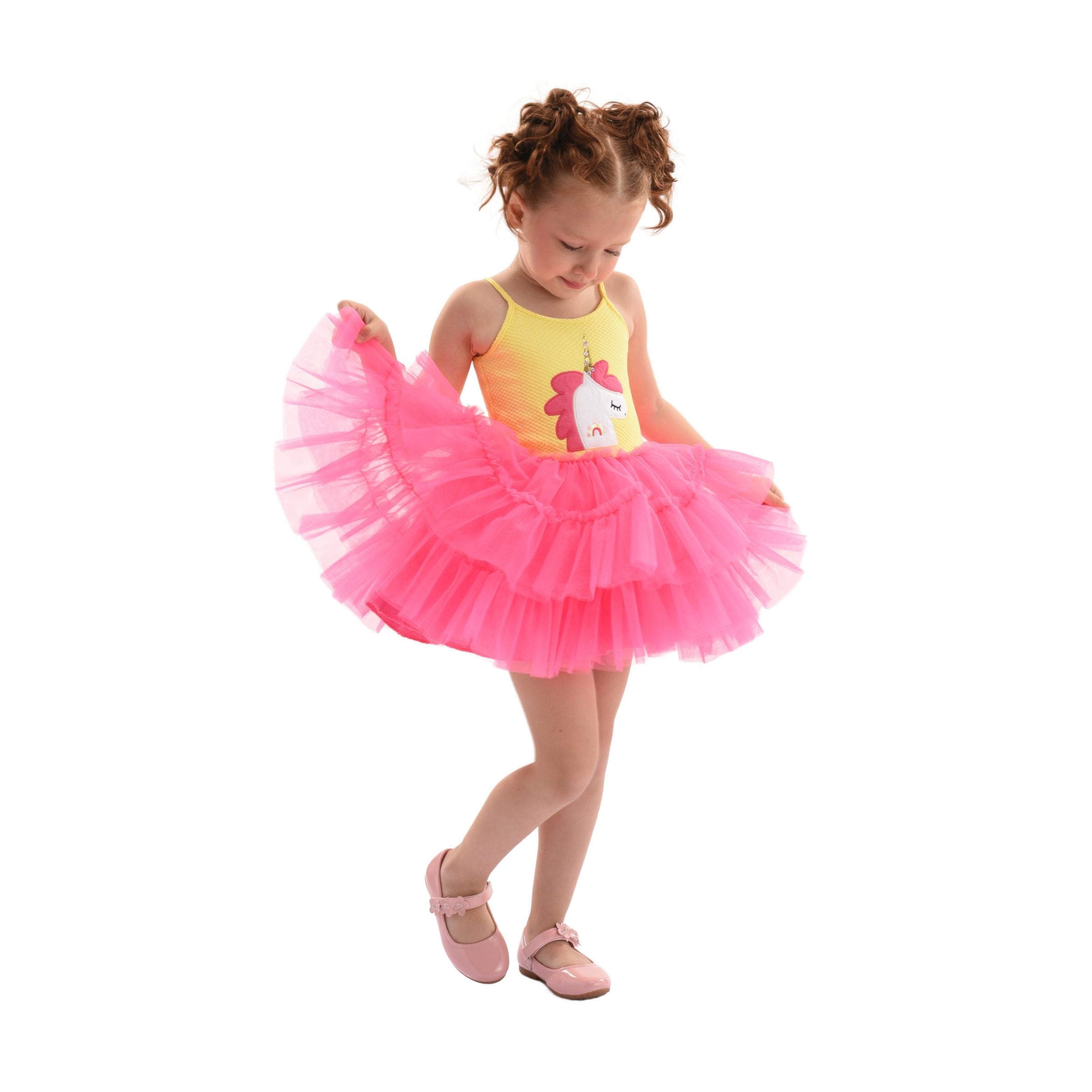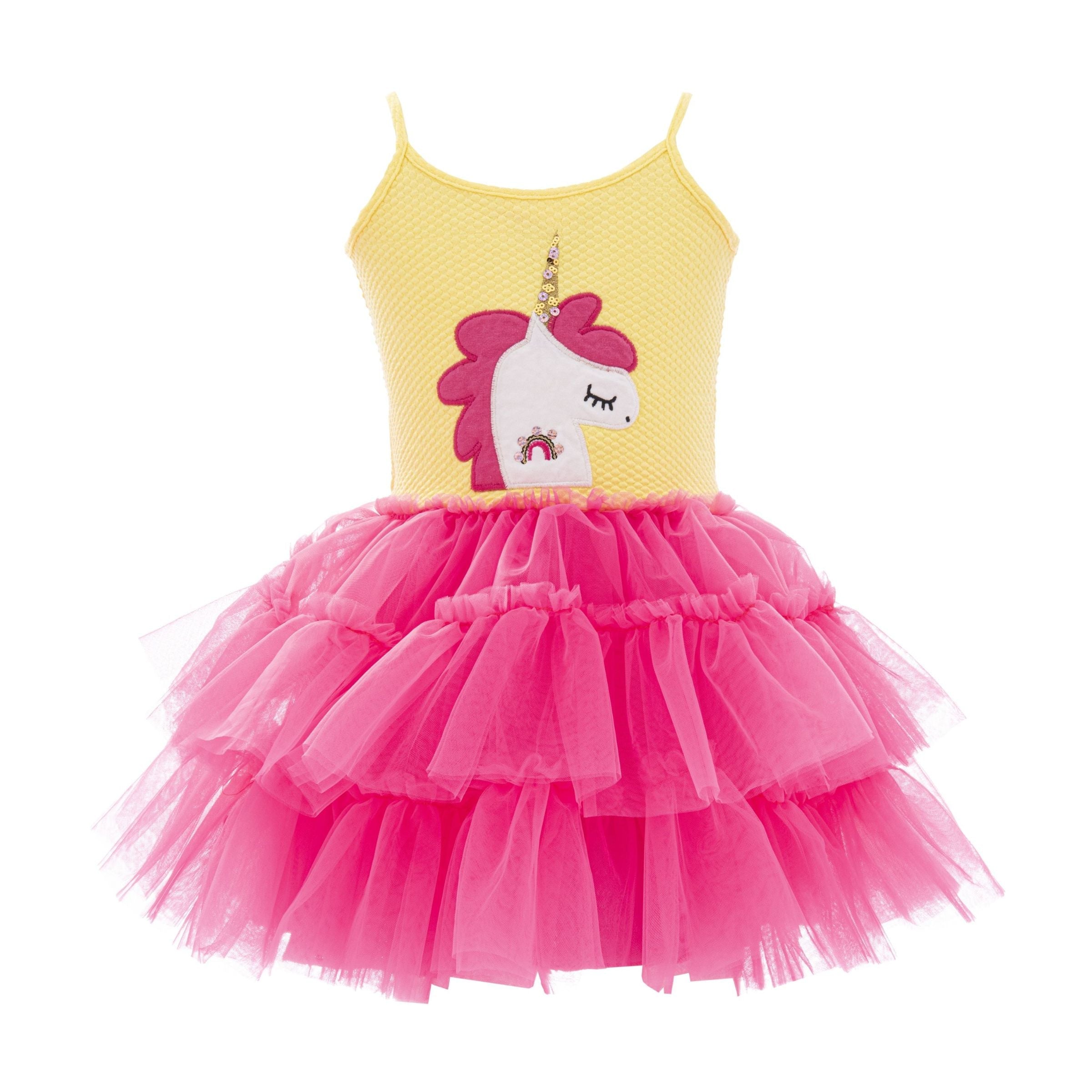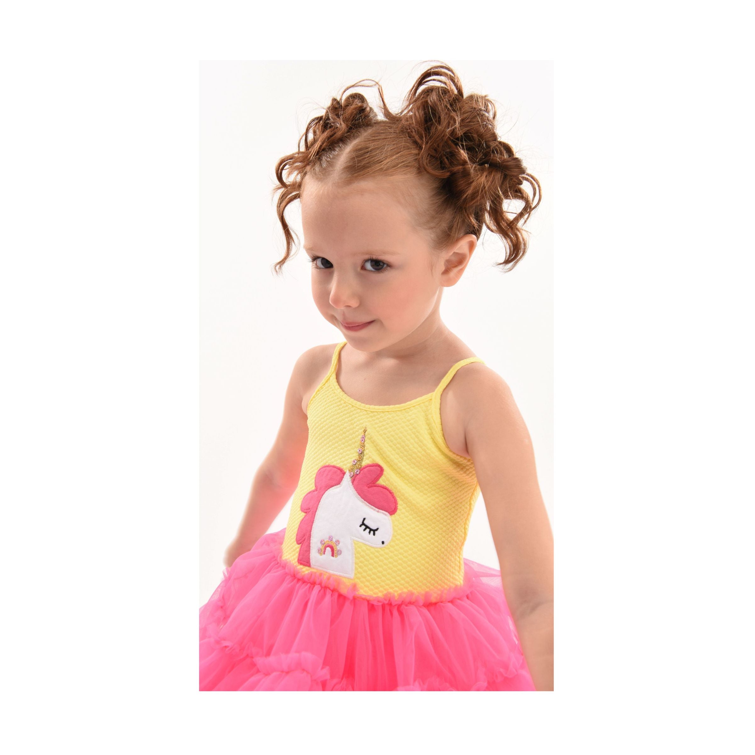 The Fuchsia Jenny Unicorn Tulle Dress for baby girls from Mimi Tutu combines charm and comfort perfectly. The dress features a charming yellow knitted fabric bodice, providing a soft and comfortable fit. Additionally, the highlight of this dress is the adorable unicorn design adorning the front. Meanwhile, the fuchsia pink layered tulle skirt is crafted with multiple layers of soft tulle fabric, creating a voluminous and graceful silhouette.