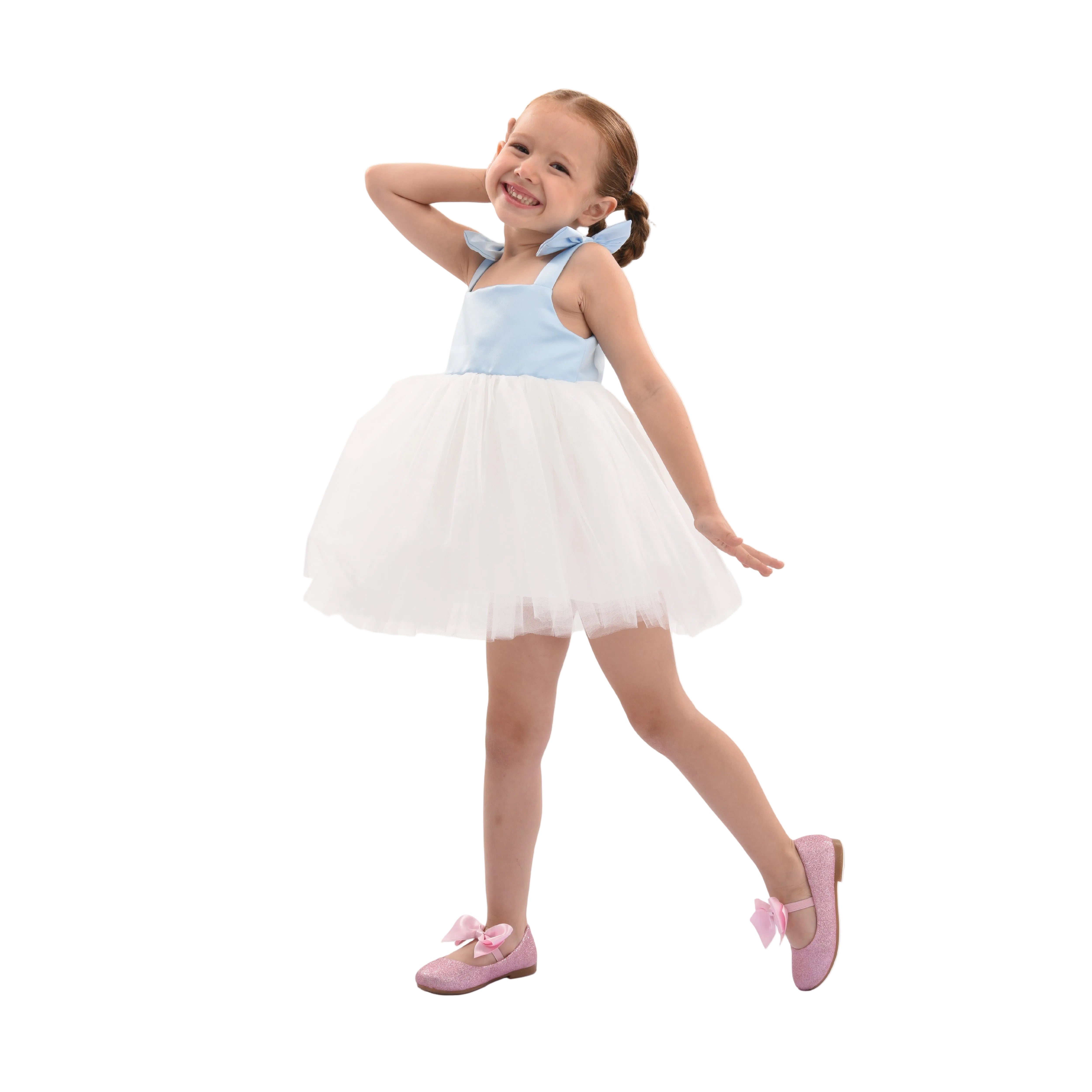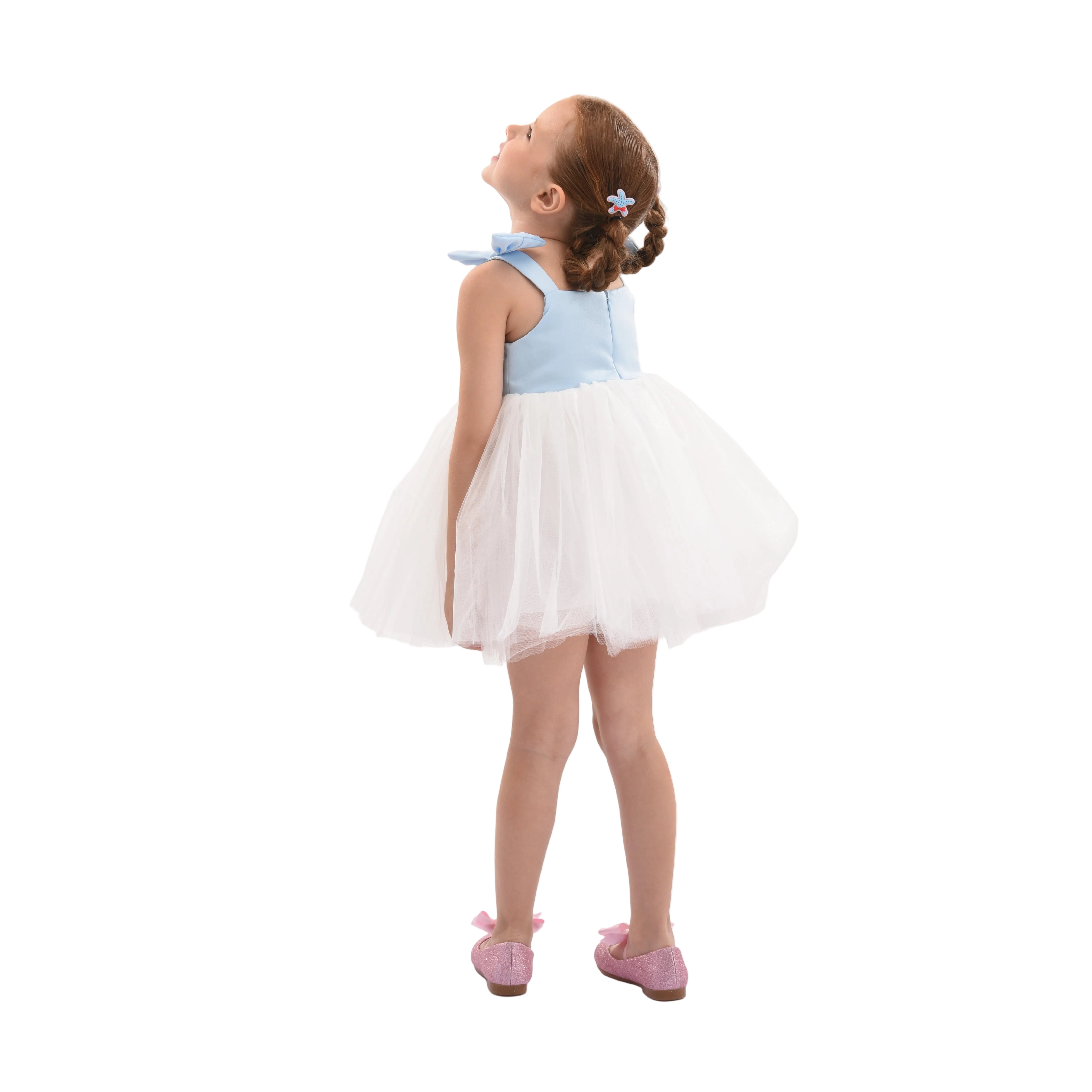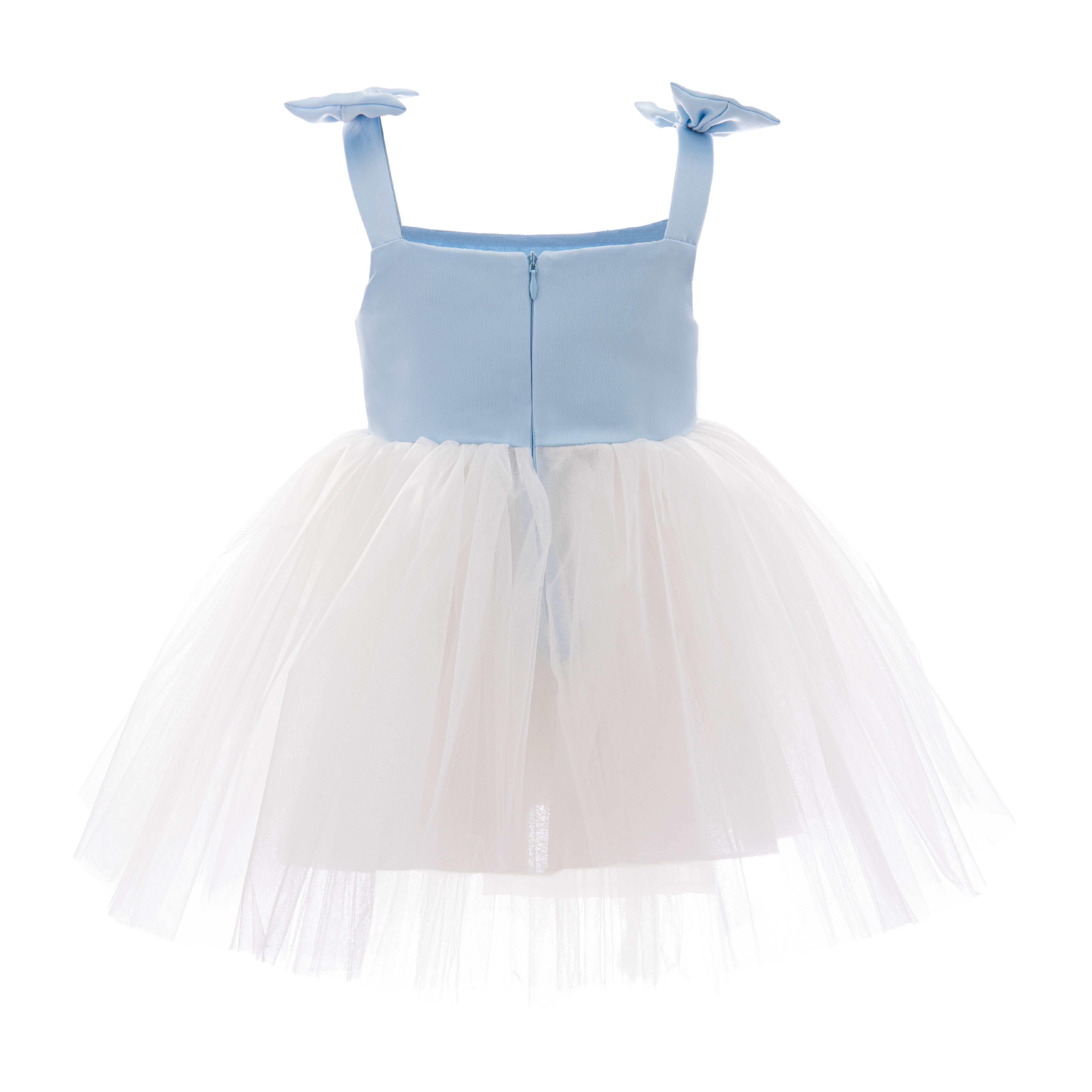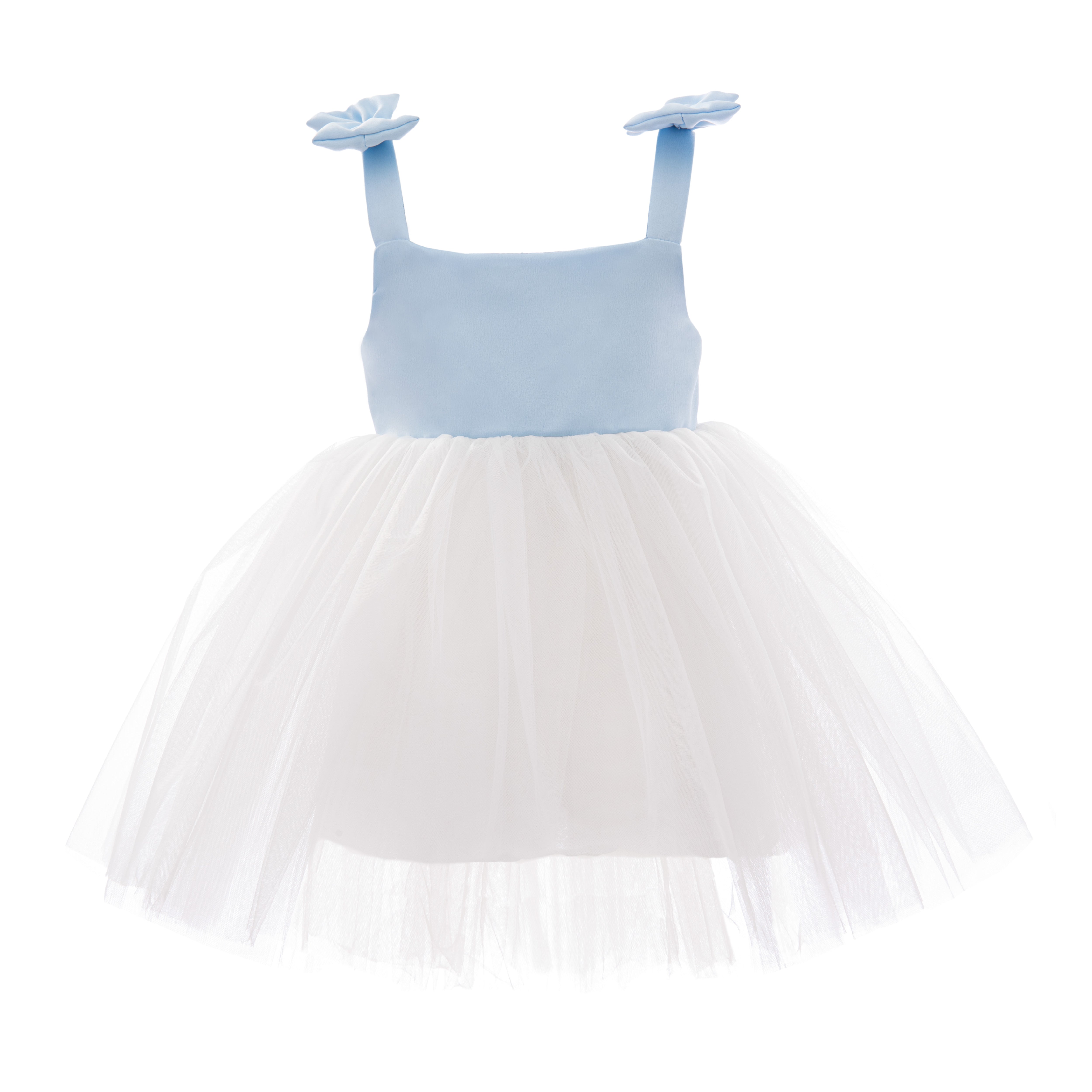 Delicate and airy, this dress features a smooth light blue bodice with floral strap embellishments and a voluminous white tulle skirt. Perfect for parties or special celebrations, it blends elegance with playful charm.