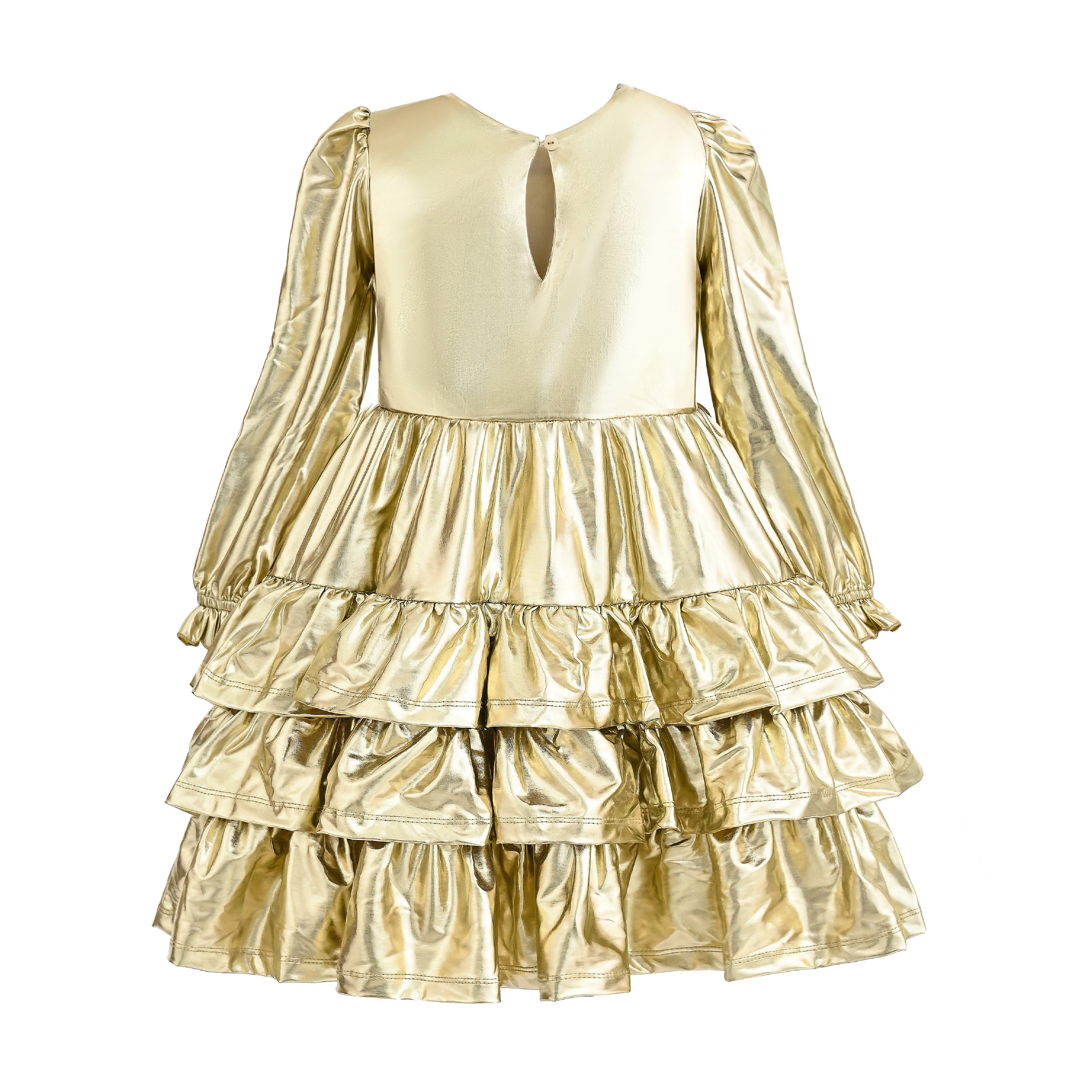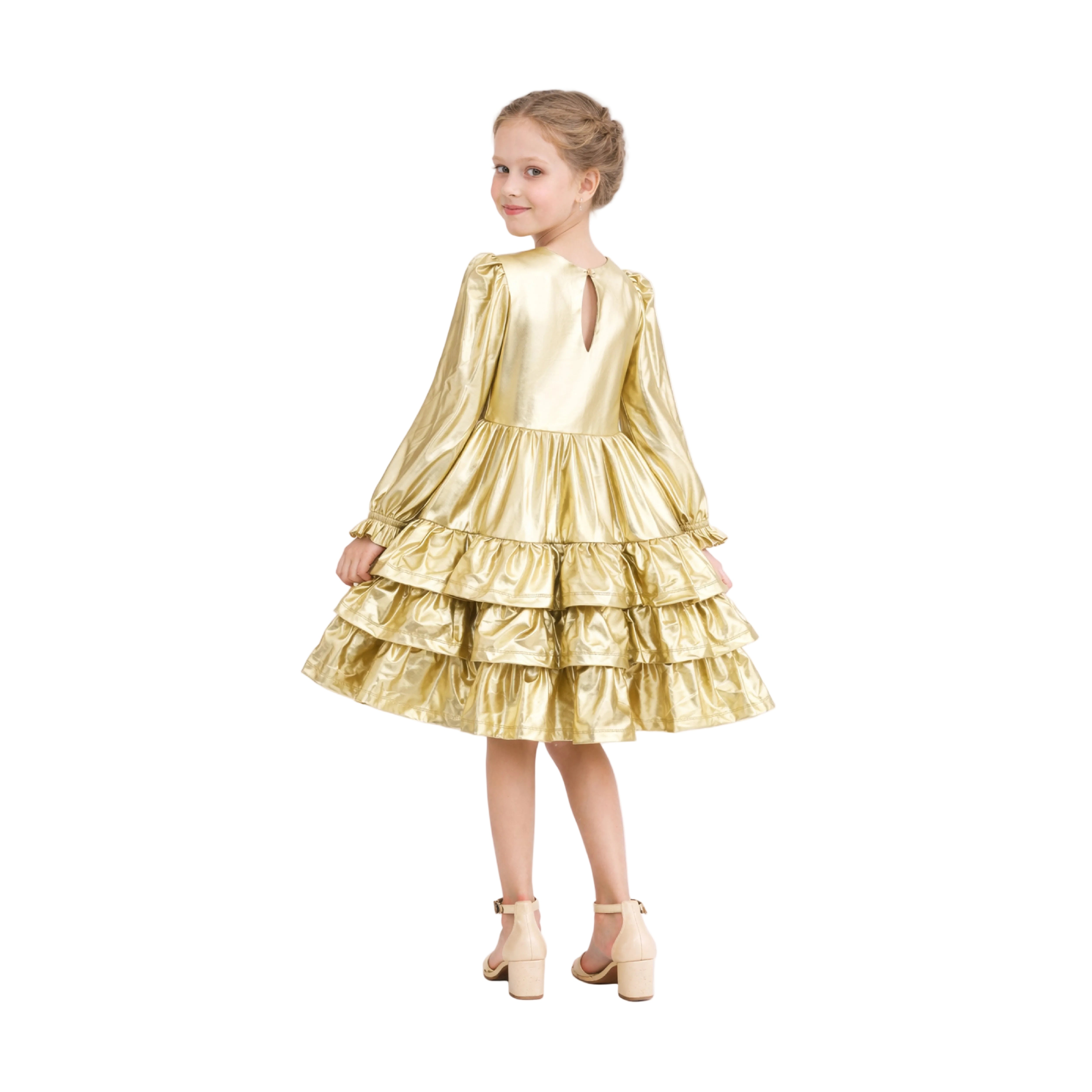 This dazzling party dress is crafted with a fitted bodice and a tiered ruffle skirt, creating a playful yet elegant silhouette. Perfect for special celebrations, it combines comfort with standout style.