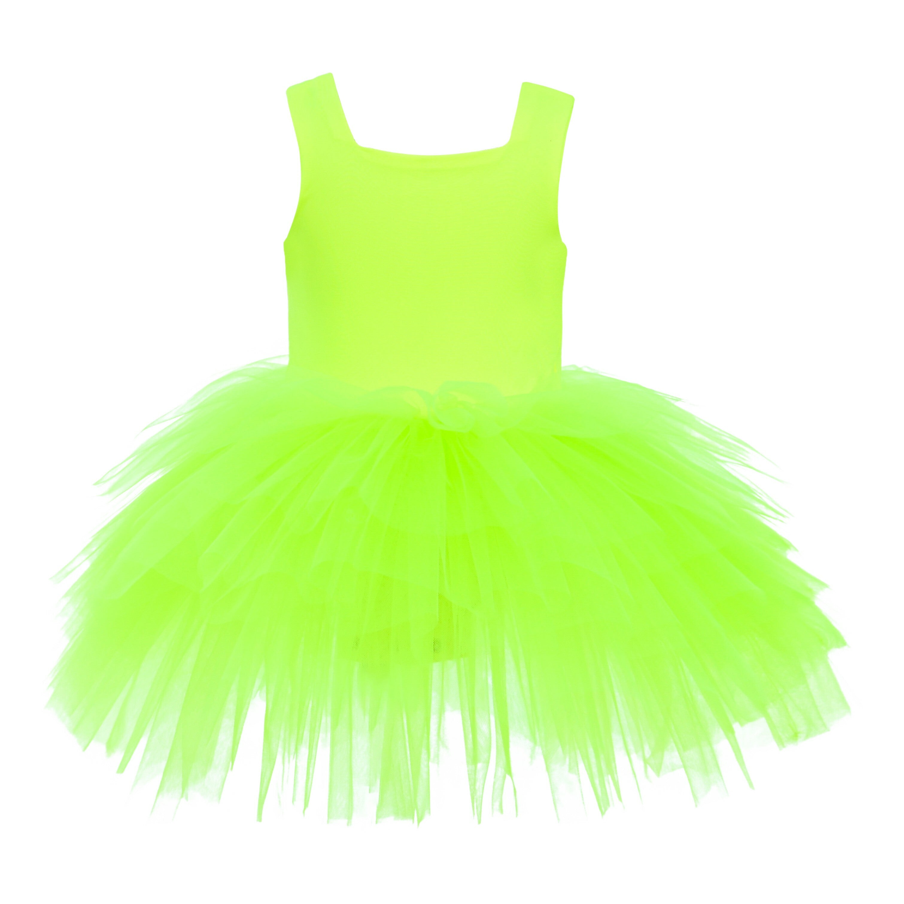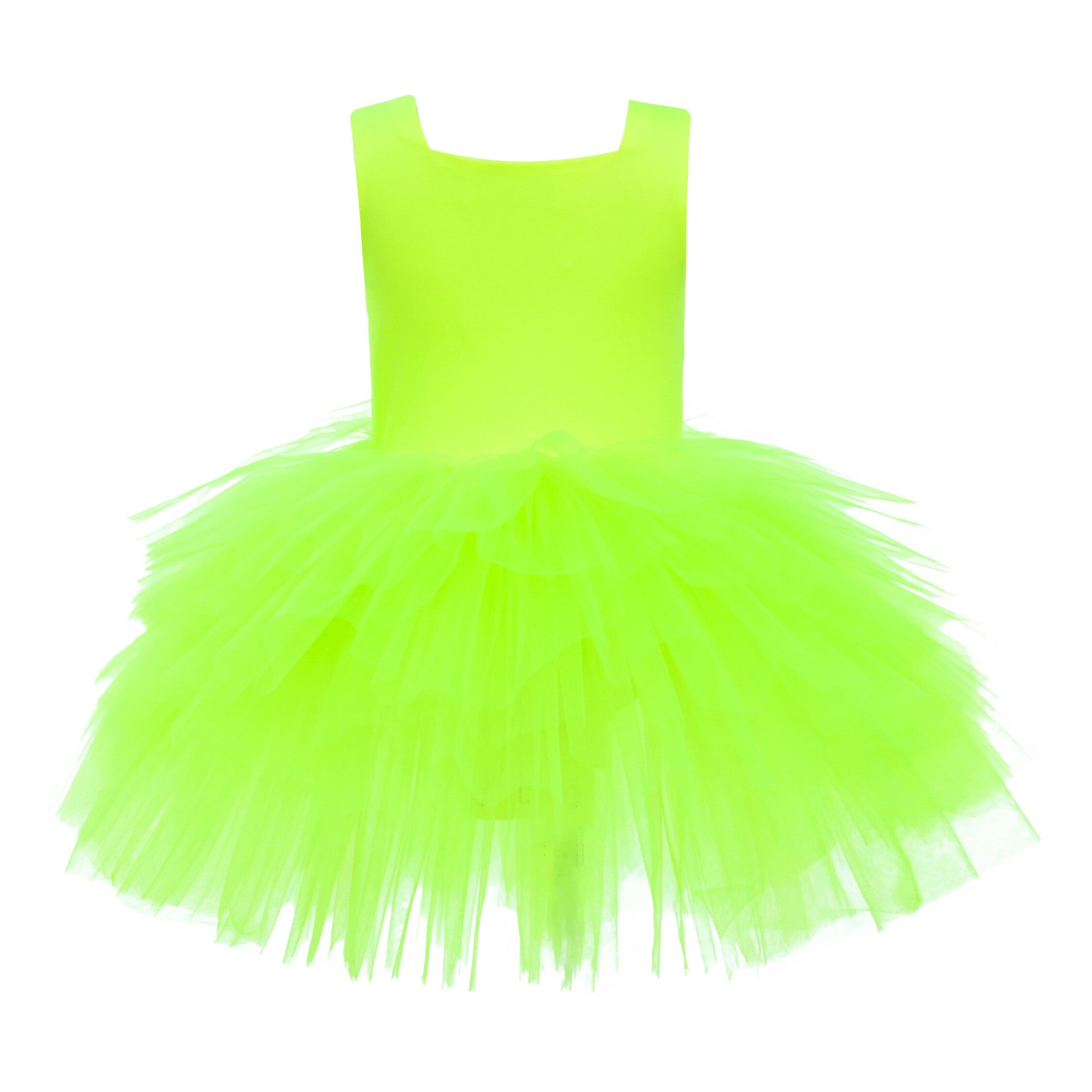 The Yellow Neon Solid Dress from Mimi Tutu is an enchanting outfit for baby girls. This adorable dress features thin sleeves and a square neck, offering a timeless and sophisticated look. The multiple layers of lightweight lush tulle create a voluminous and airy skirt, perfect for twirling and dancing. The tulle underlay adds a touch of contrast, enhancing the dress's overall elegance.