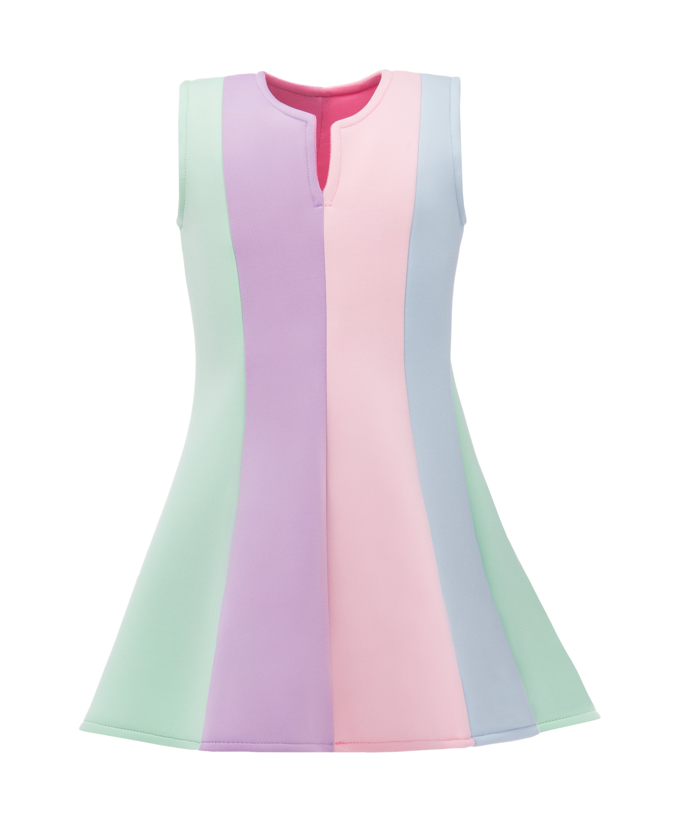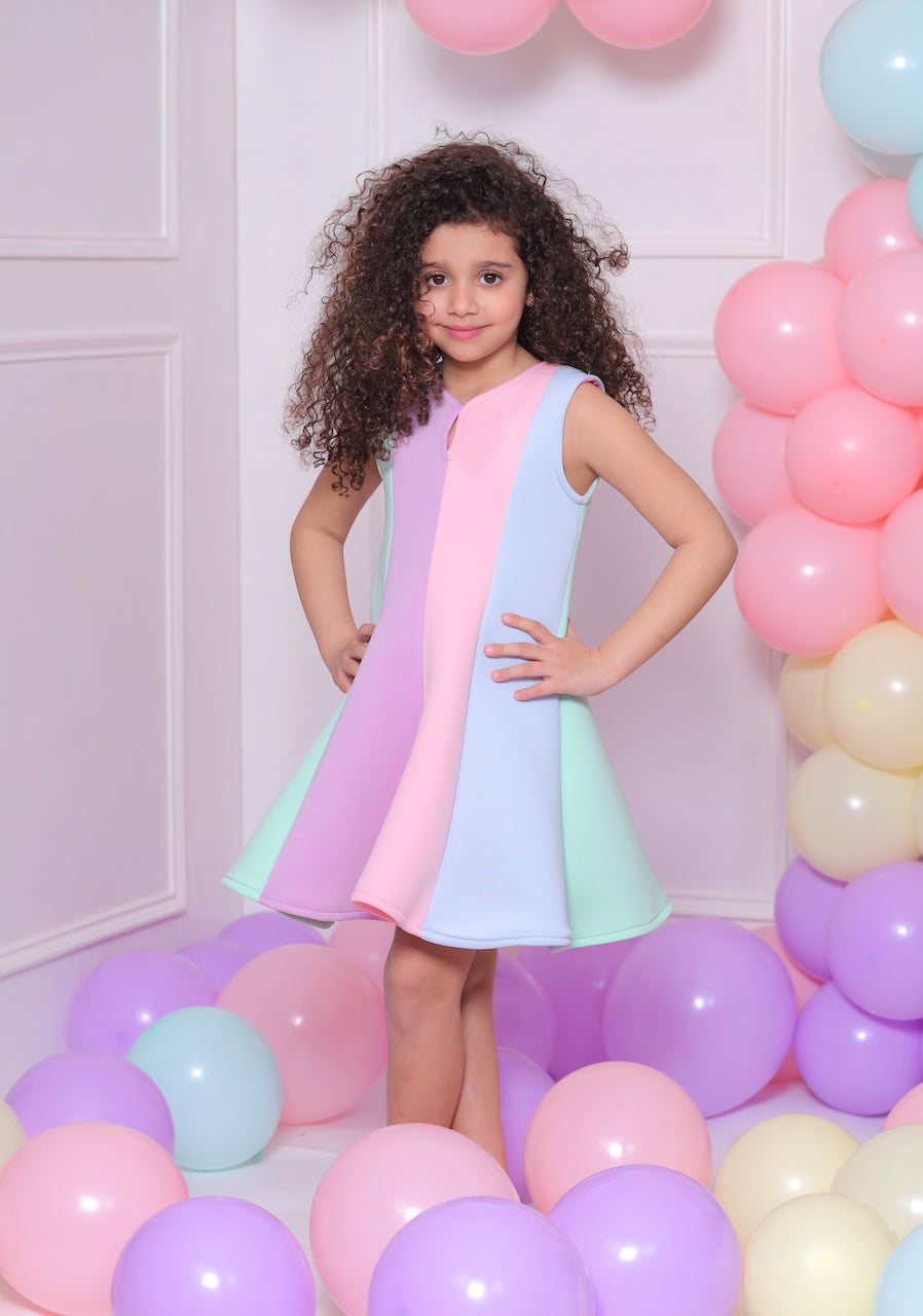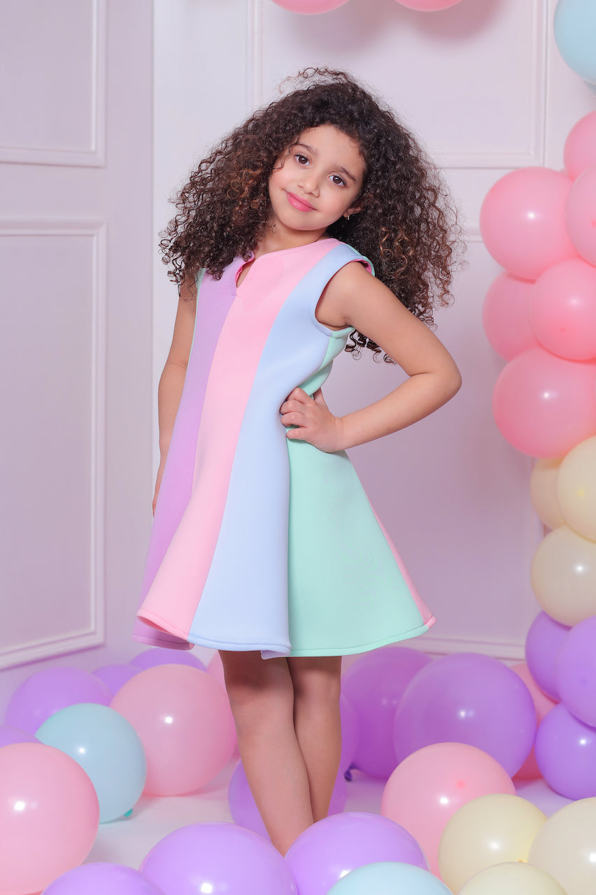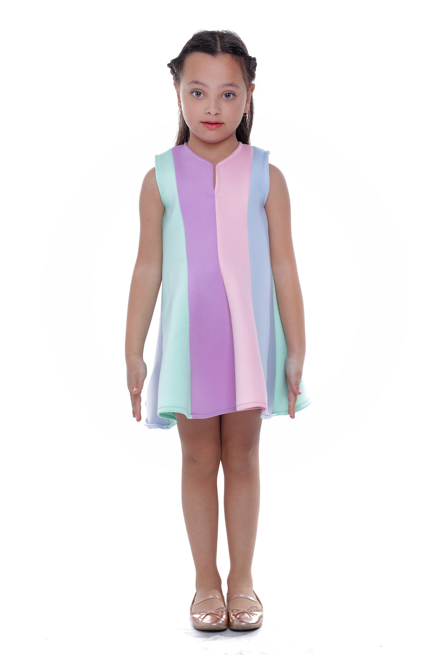 The Multi Sophie rainbow striped dress for kid and baby girls from Mimi Tutu is an eye-catching and vibrant addition to any wardrobe. Featuring a sleeveless cut and a round neck, this dress ensures comfort and style. The striped multicolor design in shades of aqua, pink, purple, and blue adds a playful and cheerful touch.