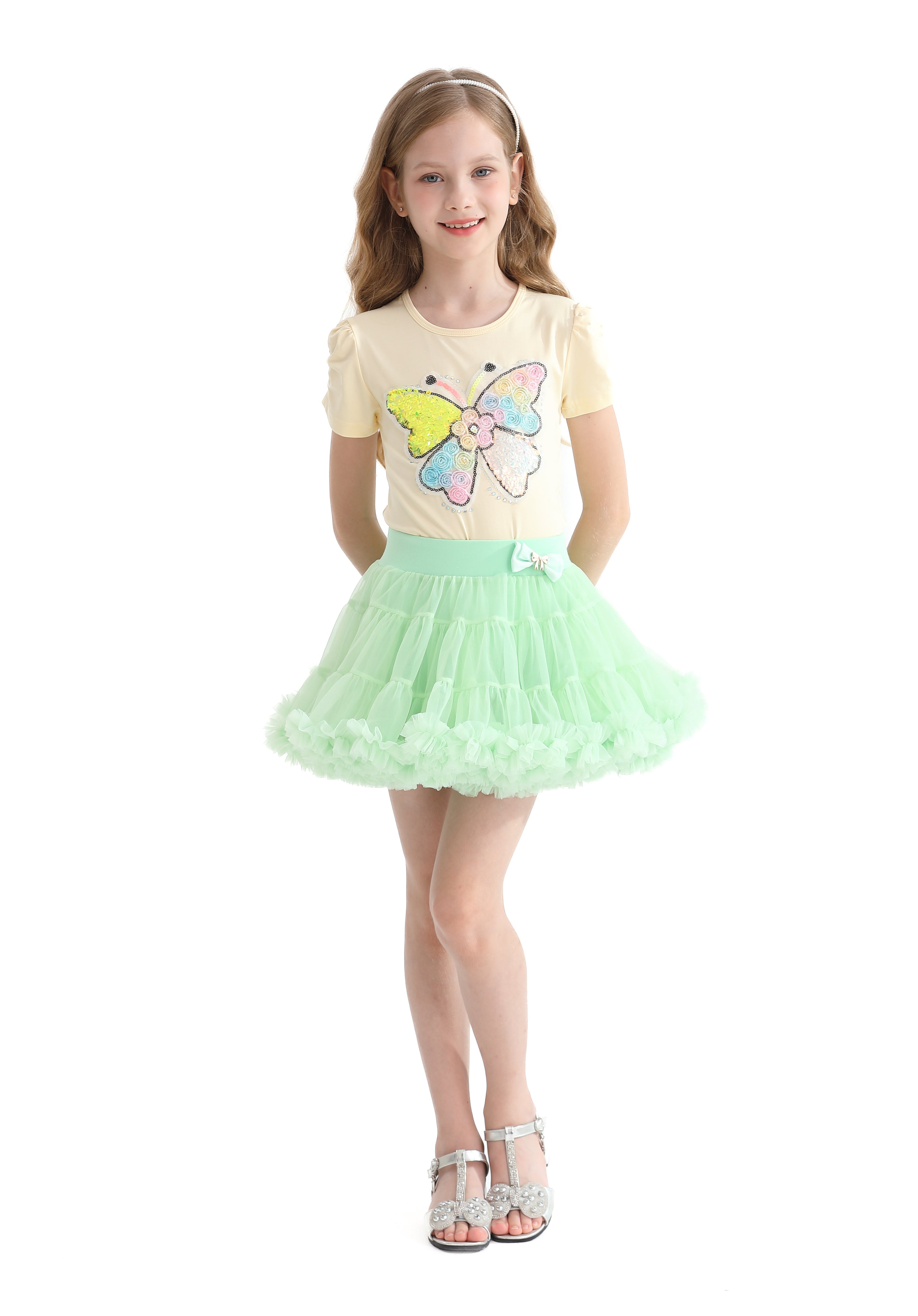 The enchanting green skirt features a lightweight and voluminous tulle design, perfect for twirling and dancing. A decorative bow applique adds a charming touch, making the skirt both playful and stylish. The elasticated waistband ensures a comfortable and secure fit, allowing for easy movement and wear.