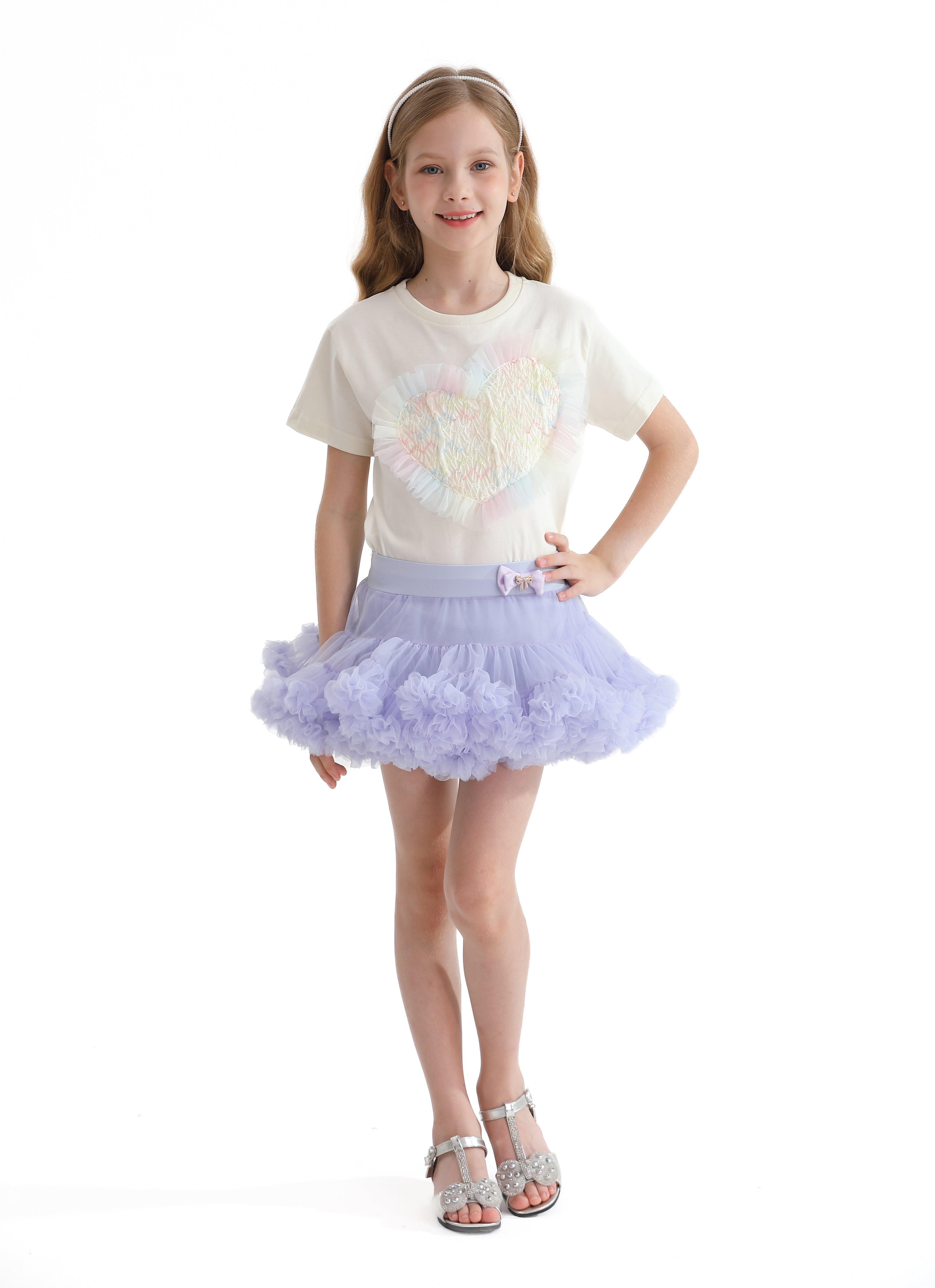 Multicolor Briona heart skirt outfit for kid girls from Mimi Tutu. This cream soft cotton tee features a vibrant multicolor rainbow heart applique, adding a cheerful and eye-catching element. The round neck ensures a comfortable and classic fit, while the short sleeves provide ease of movement, making it perfect for active kids.