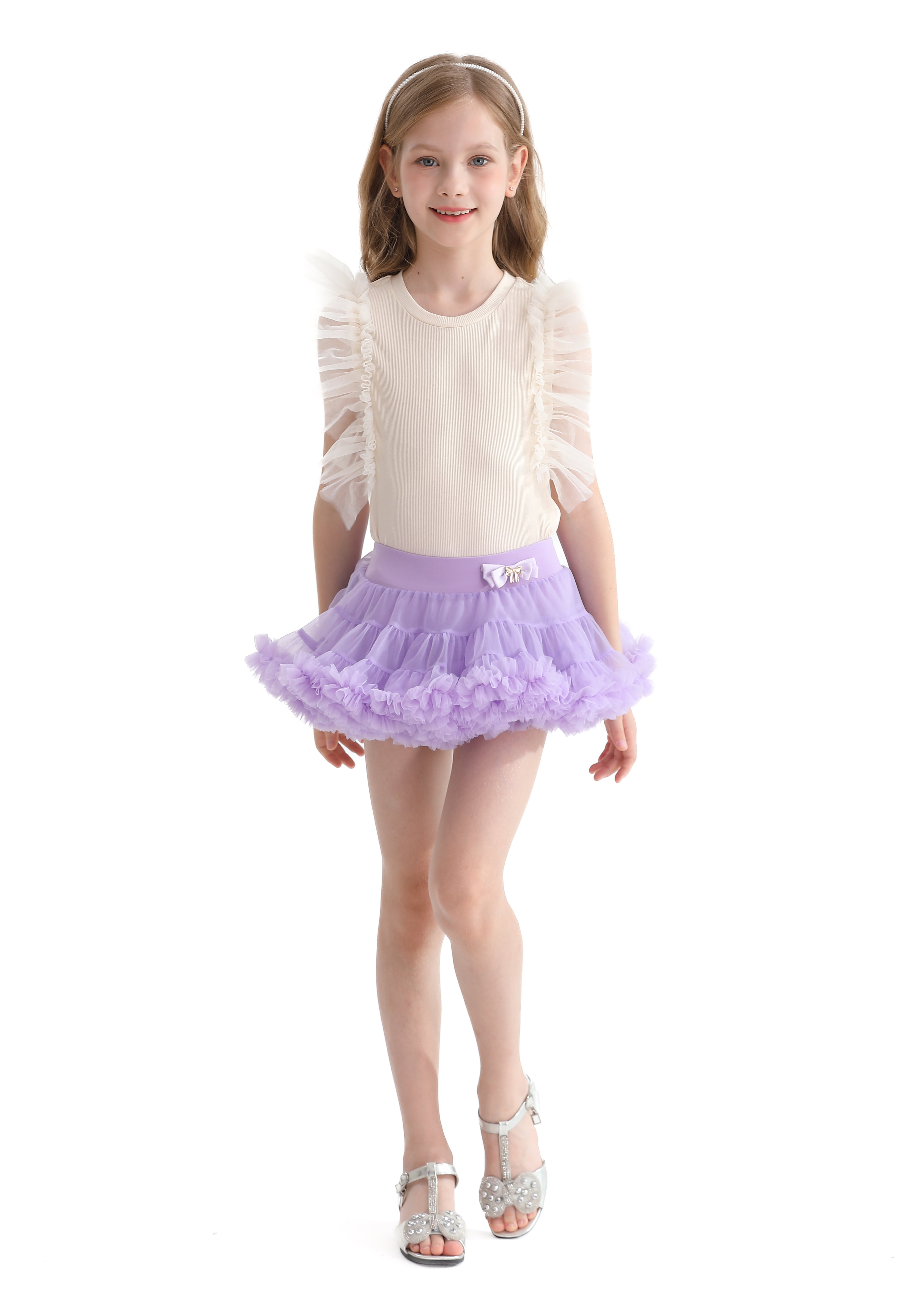 Multicolor Diana ruffle skirt outfit for kid girls from Mimi Tutu. This stylish tee features large tulle frill sleeves, creating a whimsical and charming look. The round neck and straight hem provide a classic and comfortable fit. Pair it with a tutu for the most exciting and delightful set.