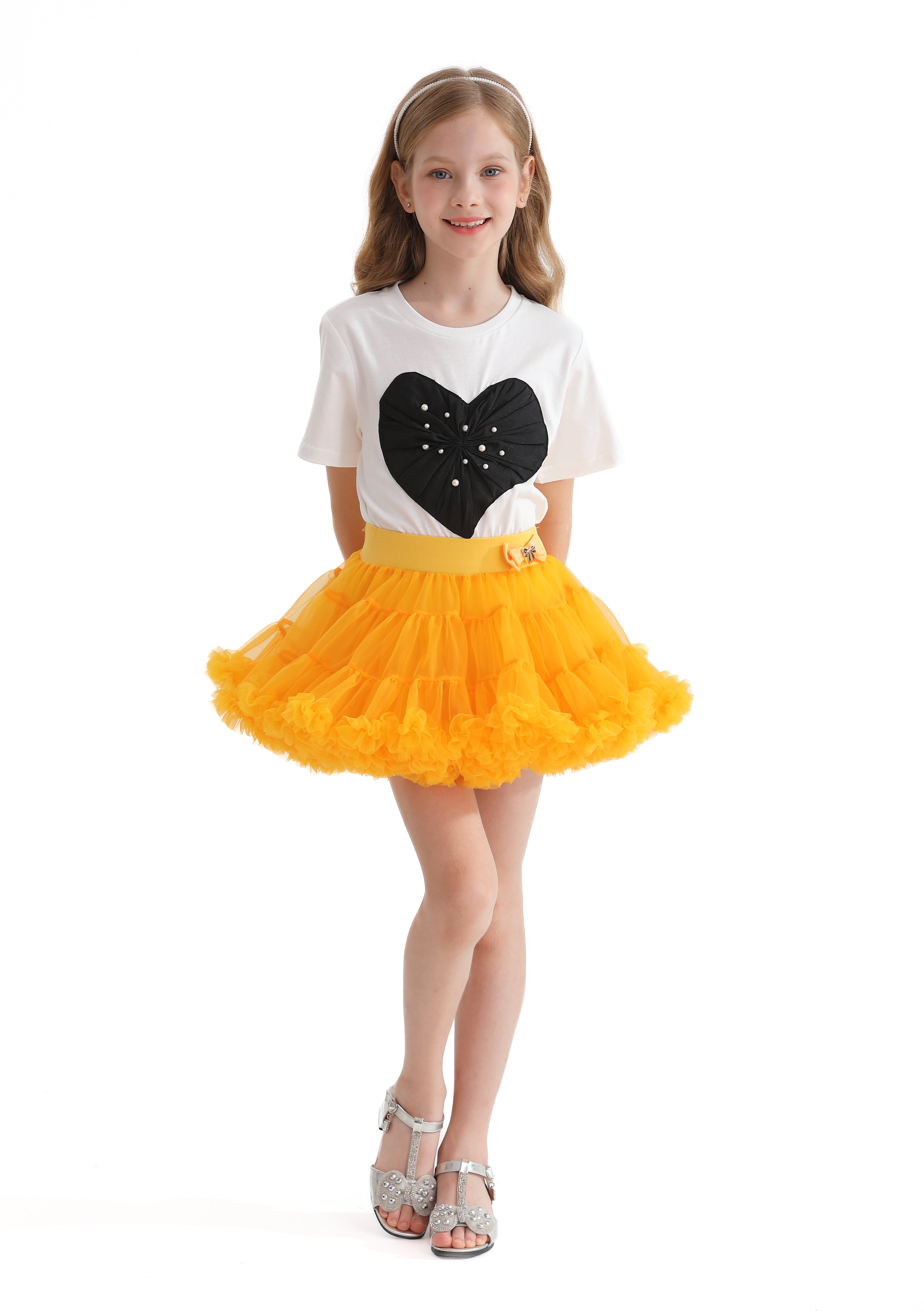 Multicolor Haley heart skirt outfit for kid girls from Mimi Tutu. This t-shirt features a round neck and short sleeves, providing a classic and comfortable fit. Firstly, the standout feature of this tee is the black heart applique adorned with delicate pearl decorations.
