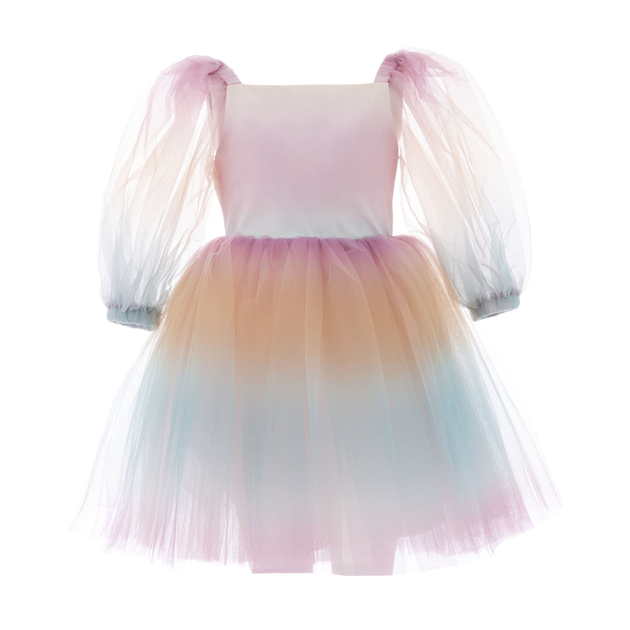The Multicolor Puesta Del Sol long sleeve tulle dress for kid girls from Tulleen is a vibrant and enchanting piece. The dress features a long sleeve bodice that provides comfort and style, while the lightweight tulle sleeves add a touch of elegance. The highlight of this dress is the long, flowy rainbow tulle skirt, which creates a stunning visual effect.