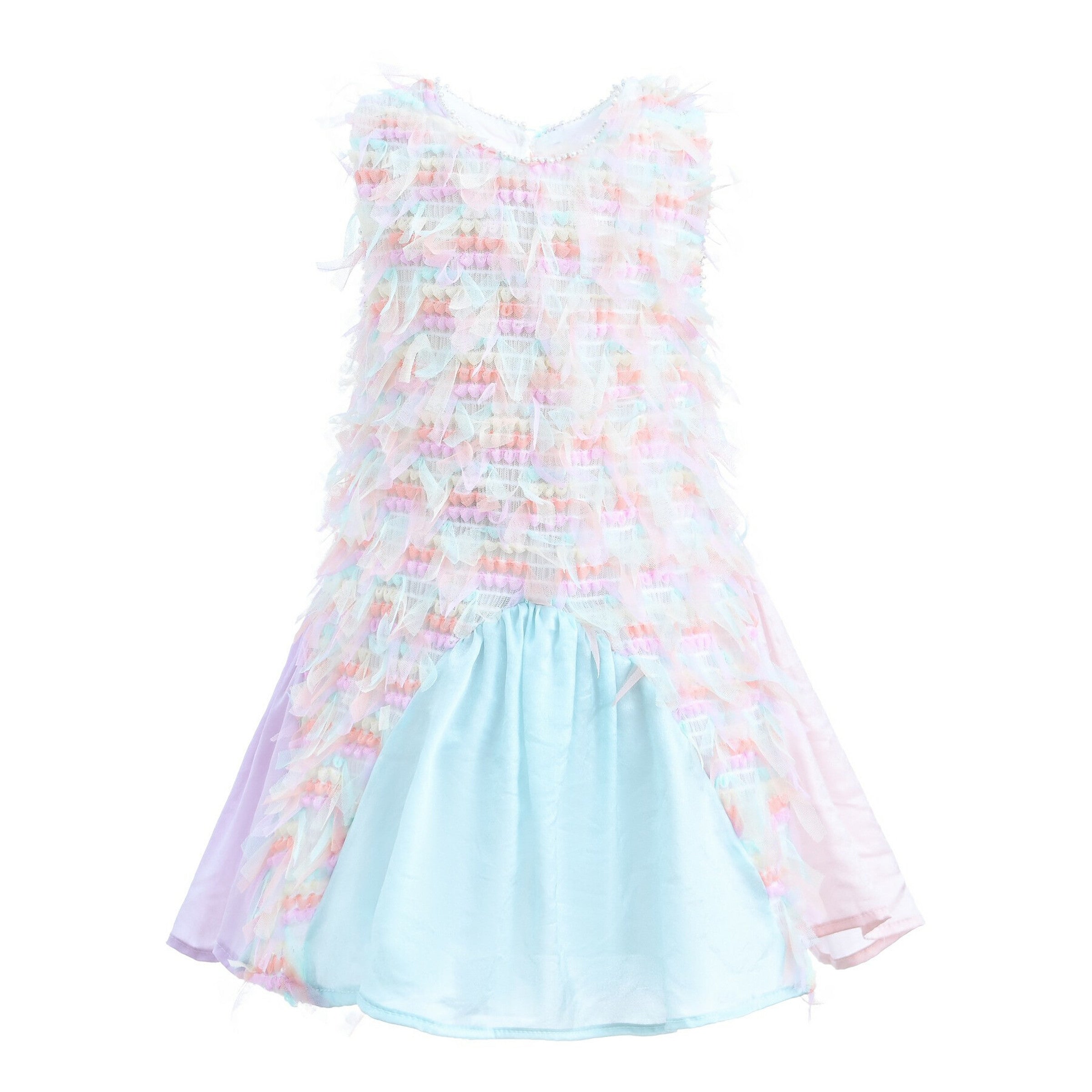 Multicolor rainbow sleeveless quilted dress for kid and baby girls from Mimi Tutu. Featuring a sleeveless cut, rainbow quilted design and satin cuts in blue, pink, and purple.